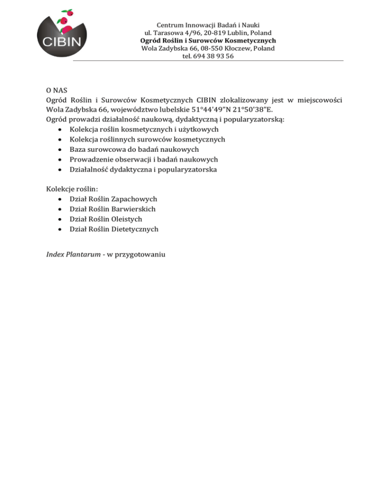Centrum Innowacji Badań i Nauki ul. Tarasowa 4/96, 20-819 Lublin, Poland Ogród Roślin i Surowców Kosmetycznych Wola Zadybska 66, 08-550 Kłoczew, Poland tel. 694 38 93 56 O NAS Ogród Roślin i Surowców Kosmetycznych CIBIN zlokalizowany jest w miejscowości Wola Zadybska 66, województwo lubelskie 51°44'49"N 21°50'38"E. Ogród prowadzi działalność naukową, dydaktyczną i popularyzatorską: Kolekcja roślin kosmetycznych i użytkowych Kolekcja roślinnych surowców kosmetycznych Baza surowcowa do badań naukowych Prowadzenie obserwacji i badań naukowych Działalność dydaktyczna i popularyzatorska Kolekcje roślin: Dział Roślin Zapachowych Dział Roślin Barwierskich Dział Roślin Oleistych Dział Roślin Dietetycznych Index Plantarum - w przygotowaniu