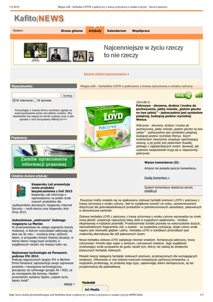 1.9.2014 Magia ziół - herbatka LOYD z pokrzywy z trawą cytrynową o smaku cytryny - Serwis prasowy Strona główna Wybierz: Artykuły Kalendarium Współpraca Zamów artykuł sponsorowany » Magia ziół herbatka LOYD z pokrzywy z trawą cytrynową o smaku cytryny Wyszukiwarka: Szukaj W internecie W serwisie 20140821 Pokrzywa skromna, drobna i trudna do pochwycenia, jakby mówiła „jestem głucha na twe zaloty” jednocześnie jest symbolem potężnej, budzącej podziw rzymskiej Wenus. Korzystając z naszej strony wyrażasz zgodę na wykorzystywanie przez nas plików cookies. Aby dowiedzieć się więcej na temat cookies oraz w jaki sposób z nich korzystamy kliknij tu>>> Pokrzywa skromna, drobna i trudna do pochwycenia, jakby mówiła „jestem głucha na twe zaloty” jednocześnie jest symbolem potężnej, budzącej podziw rzymskiej Wenus. Swym kwitnieniem nieomylnie zwiastuje nadchodzącą wiosnę, a jej pyłek jest pokarmem Rusałki, jednego z najpiękniejszych motyli. Sprawdź, jak cudowne niespodzianki kryją się w niepozornej pokrzywie. Popieramy: Wasze komentarze (0): Artykuł nie posiada jeszcze komentarzy. Ostatnio dodane artykuły: Kaspersky Lab prezentuje nowe produkty bezpieczeństwa z linii 2015 Kaspersky Lab informuje o wprowadzeniu na polski rynek nowych produktów dla użytkowników domowych: Kaspersky Internet Security – multidevice oraz Kaspersky Anti Virus 2015. Jednodniowe „wietrzenie” ślubnego magazynu La Mariee W przeciwieństwie do całego segmentu branży modowej, w którym wyprzedaże odbywają się dwa raz do roku – wczesną zimą i późnym latem, w przypadku branży ślubnej sytuacja, w której klienci mogą kupić produkty w wyjątkowych cenach ma miejsce tylko raz. Najnowsze technologie od Panasonic podczas IFA 2014 Podczas tegorocznych targów IFA w Berlinie firma Panasonic zaprezentuje swoje najnowsze produkty i rozwiązania technologiczne, począwszy od cyfrowego sprzętu AV i AGD, aż po rozwiązania dla biznesu. Hasłem przewodnim wystawy będzie „Lepsze życie, lepszy świat”. więcej » Dodaj Komentarz » System komentarzy dostarcza serwis eGadki.pl Powyższe motto znalazło się na opakowaniu ziołowej herbatki premium LOYD z pokrzywy z trawą cytrynową o smaku cytryny. Jest to wyjątkowa nowość na rynku, zarezerwowanym dotychczas dla jednoskładnikowych produktów w jednokomorowych saszetkach, pakowanych w ekonomiczne kartoniki. Ziołowa herbatka LOYD z pokrzywy z trawą cytrynową o smaku cytryny wprowadza na rynek nową jakość: proponuje najwyższej klasy zioła w wygodnym opakowaniu torebce ekspresowej w kształcie piramidki. Przestrzenność torebki pozwala na wykorzystanie dużych, nierozdrobionych fragmentów ziół, a wodzie na swobodną cyrkulację, dzięki czemu smak naparu jest niezwykle głęboki i pełny. Herbatka LOYD w torebkach piramidkach jest znakomitą alternatywą dla ziół pakowanych luzem. Nowa herbatka ziołowa LOYD zaskakuje również smakiem. Kompozycja pokrzywy, trawy cytrynowej i limonki daje napar o świeżym, cytrusowym bukiecie. Jego wyjątkowo orzeźwiający smak przypadnie do gustu nawet tym, którzy nie należą do amatorów klasycznych herbatek ziołowych. Mokate tworzy kategorię herbatek ziołowych premium, przeznaczonych dla wymagających smakoszy. Oferowane w niej ziołowoowocowe kompozycje zachwycą koneserów, a sceptyków przekonają, że produkty tego typu, zapewniając dobre samopoczucie, są też przyjemnością dla podniebienia. Nadesłał: Art Media http://news.kafito.pl/artykul/magia-ziol-herbatka-loyd-z-pokrzywy-z-trawa-cytrynowa-o-smaku-cytryny,60902.html 1/3