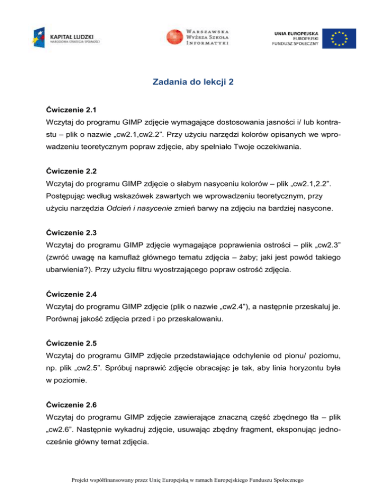 Zadania do lekcji 2 Ćwiczenie 2.1 Wczytaj do programu GIMP zdjęcie wymagające dostosowania jasności i/ lub kontrastu – plik o nazwie „cw2.1,cw2.2”. Przy użyciu narzędzi kolorów opisanych we wprowadzeniu teoretycznym popraw zdjęcie, aby spełniało Twoje oczekiwania. Ćwiczenie 2.2 Wczytaj do programu GIMP zdjęcie o słabym nasyceniu kolorów – plik „cw2.1,2.2”. Postępując według wskazówek zawartych we wprowadzeniu teoretycznym, przy użyciu narzędzia Odcień i nasycenie zmień barwy na zdjęciu na bardziej nasycone. Ćwiczenie 2.3 Wczytaj do programu GIMP zdjęcie wymagające poprawienia ostrości – plik „cw2.3” (zwróć uwagę na kamuflaż głównego tematu zdjęcia – żaby; jaki jest powód takiego ubarwienia?). Przy użyciu filtru wyostrzającego popraw ostrość zdjęcia. Ćwiczenie 2.4 Wczytaj do programu GIMP zdjęcie (plik o nazwie „cw2.4”), a następnie przeskaluj je. Porównaj jakość zdjęcia przed i po przeskalowaniu. Ćwiczenie 2.5 Wczytaj do programu GIMP zdjęcie przedstawiające odchylenie od pionu/ poziomu, np. plik „cw2.5”. Spróbuj naprawić zdjęcie obracając je tak, aby linia horyzontu była w poziomie. Ćwiczenie 2.6 Wczytaj do programu GIMP zdjęcie zawierające znaczną część zbędnego tła – plik „cw2.6”. Następnie wykadruj zdjęcie, usuwając zbędny fragment, eksponując jednocześnie główny temat zdjęcia. Projekt współfinansowany przez Unię Europejską w ramach Europejskiego Funduszu Społecznego Ćwiczenie 2.7 Wczytaj do programu GIMP zdjęcie budynku – plik o nazwie „cw2.7”. Posługując się narzędziem Perspektywa, zmień zdjęcie tak, jakby budynek był fotografowany z innej perspektywy. Ćwiczenie 2.8 Posługując się narzędziem GIMPresjonista, zmodyfikuj w niepowtarzalny sposób fotografię, np. plik „cw2.8”. Projekt współfinansowany przez Unię Europejską w ramach Europejskiego Funduszu Społecznego
