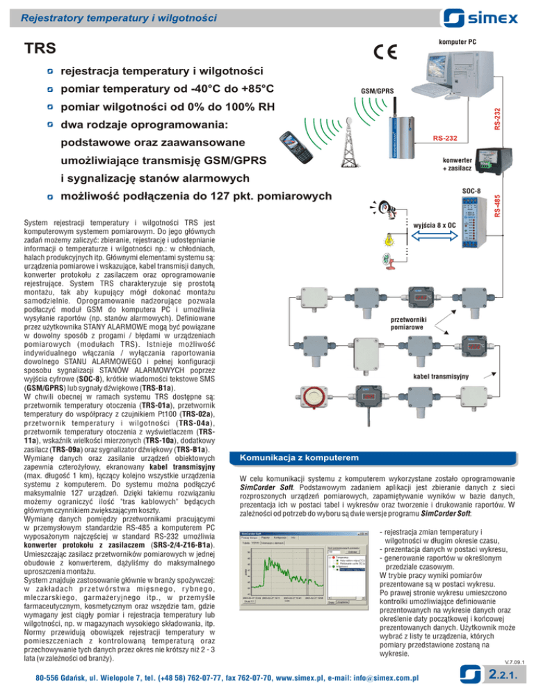 Rejestratory temperatury i wilgotnoœci komputer PC TRS rejestracja temperatury i wilgotnoœci pomiar temperatury od -40°C do +85°C GSM/GPRS RS-232 pomiar wilgotnoœci od 0% do 100% RH dwa rodzaje oprogramowania: RS-232 podstawowe oraz zaawansowane umo¿liwiaj¹ce transmisjê GSM/GPRS konwerter + zasilacz i sygnalizacjê stanów alarmowych SOC-8 System rejestracji temperatury i wilgotnoœci TRS jest komputerowym systemem pomiarowym. Do jego g³ównych zadañ mo¿emy zaliczyæ: zbieranie, rejestracjê i udostêpnianie informacji o temperaturze i wilgotnoœci np.: w ch³odniach, halach produkcyjnych itp. G³ównymi elementami systemu s¹: urz¹dzenia pomiarowe i wskazuj¹ce, kabel transmisji danych, konwerter protoko³u z zasilaczem oraz oprogramowanie rejestruj¹ce. System TRS charakteryzuje siê prostot¹ monta¿u, tak aby kupuj¹cy móg³ dokonaæ monta¿u samodzielnie. Oprogramowanie nadzoruj¹ce pozwala pod³aczyæ modu³ GSM do komputera PC i umo¿liwia wysy³anie raportów (np. stanów alarmowych). Definiowane przez u¿ytkownika STANY ALARMOWE mog¹ byæ powi¹zane w dowolny sposób z progami / b³êdami w urz¹dzeniach pomiarowych (modu³ach TRS). Istnieje mo¿liwoœæ indywidualnego w³¹czania / wy³¹czania raportowania dowolnego STANU ALARMOWEGO i pe³nej konfiguracji sposobu sygnalizacji STANÓW ALARMOWYCH poprzez wyjœcia cyfrowe (SOC-8), krótkie wiadomoœci tekstowe SMS (GSM/GPRS) lub sygna³y dŸwiêkowe (TRS-B1a). W chwili obecnej w ramach systemu TRS dostêpne s¹: przetwornik temperatury otoczenia (TRS-01a), przetwornik temperatury do wspó³pracy z czujnikiem Pt100 (TRS-02a), przetwornik temperatury i wilgotnoœci (TRS-04a), przetwornik temperatury otoczenia z wyœwietlaczem (TRS11a), wskaŸnik wielkoœci mierzonych (TRS-10a), dodatkowy zasilacz (TRS-09a) oraz sygnalizator dŸwiêkowy (TRS-B1a). Wymianê danych oraz zasilanie urz¹dzeñ obiektowych zapewnia cztero¿y³owy, ekranowany kabel transmisyjny (max. d³ugoœæ 1 km), ³¹cz¹cy kolejno wszystkie urz¹dzenia systemu z komputerem. Do systemu mo¿na pod³¹czyæ maksymalnie 127 urz¹dzeñ. Dziêki takiemu rozwi¹zaniu mo¿emy ograniczyæ iloœæ "tras kablowych" bêd¹cych g³ównym czynnikiem zwiêkszaj¹cym koszty. Wymianê danych pomiêdzy przetwornikami pracuj¹cymi w przemys³owym standardzie RS-485 a komputerem PC wyposa¿onym najczêœciej w standard RS-232 umo¿liwia konwerter protoko³u z zasilaczem (SRS-2/4-Z16-B1a). Umieszczaj¹c zasilacz przetworników pomiarowych w jednej obudowie z konwerterem, d¹¿yliœmy do maksymalnego uproszczenia monta¿u. System znajduje zastosowanie g³ównie w bran¿y spo¿ywczej: w zak³adach pr zetwórstwa miêsnego, r ybnego, mleczarskiego, garma¿eryjnego itp., w przemyœle farmaceutycznym, kosmetycznym oraz wszêdzie tam, gdzie wymagany jest ci¹g³y pomiar i rejestracja temperatury lub wilgotnoœci, np. w magazynach wysokiego sk³adowania, itp. Normy przewiduj¹ obowi¹zek rejestracji temperatury w pomieszczeniach z kontrolowan¹ temperatur¹ oraz przechowywanie tych danych przez okres nie krótszy ni¿ 2 - 3 lata (w zale¿noœci od bran¿y). RS-485 mo¿liwoœæ pod³¹czenia do 127 pkt. pomiarowych wyjœcia 8 x OC przetworniki pomiarowe kabel transmisyjny Komunikacja z komputerem W celu komunikacji systemu z komputerem wykorzystane zosta³o oprogramowanie SimCorder Soft. Podstawowym zadaniem aplikacji jest zbieranie danych z sieci rozproszonych urz¹dzeñ pomiarowych, zapamiêtywanie wyników w bazie danych, prezentacja ich w postaci tabel i wykresów oraz tworzenie i drukowanie raportów. W zale¿noœci od potrzeb do wyboru s¹ dwie wersje programu SimCorder Soft: - rejestracja zmian temperatury i wilgotnoœci w d³ugim okresie czasu, - prezentacja danych w postaci wykresu, - generowanie raportów w okreœlonym przedziale czasowym. W trybie pracy wyniki pomiarów prezentowane s¹ w postaci wykresu. Po prawej stronie wykresu umieszczono kontrolki umo¿liwiaj¹ce definiowanie prezentowanych na wykresie danych oraz okreœlenie daty pocz¹tkowej i koñcowej prezentowanych danych. U¿ytkownik mo¿e wybraæ z listy te urz¹dzenia, których pomiary przedstawione zostan¹ na wykresie. 80-556 Gdañsk, ul. Wielopole 7, tel. (+48 58) 762-07-77, fax 762-07-70, www.simex.pl, e-mail: [email protected] V.7.09.1 2.2.1. Rejestratory temperatury i wilgotnoœci Urz¹dzenia uzupe³niaj¹ce systemu TRS TRS-09a zasilacz wspomagaj¹cy systemu TRS wydajnoœæ pr¹dowa 200 mA Dane techniczne TRS-09a jest wspomagaj¹cym zasilaczem systemu TRS dostarczaj¹cym stabilizowanego napiêcia sta³ego 11,5V. Mo¿e pracowaæ w dwóch trybach: jako zasilacz sterowany (w³¹czany napiêciem zewnêtrznym 7-12V) lub niesterowany. Wyboru konfiguracji dokonuje siê za pomoc¹ zworki. Wydajnoœæ pr¹dowa wynosi 200 mA. Zasilacz jest odporny na krótkotrwa³e zwarcie napiêcia wyjœciowego. Urz¹dzenie umieszczone zosta³o w obudowie zapewniaj¹cej pe³n¹ ochronê przed py³ami oraz niskociœnieniowymi strugami wody. napiêcie zasilania: 230 V AC +10/-5% napiêcie wyjœciowe zasilacza: 11,5 V ±5% napiêcie steruj¹ce: od 7 V do 12 V, max. 2 mA wydajnoœæ pr¹dowa: 200 mA (przeciêtnie 15 urz¹dzeñ TRS) temperatura pracy: 0°C do +50°C temperatura sk³adowania: -10°C do +70°C wymiary obudowy (d³ x sz x g³): 110 x 80 x 67 mm, 133 x 130 x 67 mm z d³awicami wilgotnoœæ: do 90% bez kondensacji waga: 365 g SRS-2/4-Z16-B1a zasilacz systemu czujników pomiarowych konwerter standardu RS-232/RS-485 separator galwaniczny obwodów RS-232 i RS-485 rejestrator danych Rejestrator SRS-2/4-Z16-B1a jest urz¹dzeniem dwuprocesorowym, wyposa¿onym w zegar czasu rzeczywistego podtrzymywany bateri¹ litow¹ oraz nieulotn¹ pamiêæ typu flash (1MB), umo¿liwiaj¹c¹ rejestracjê ok. 40 000 pomiarów. Po ponownym w³¹czeniu programu SimCorder Soft wszystkie zarejestrowane pomiary kopiowane s¹ do komputera PC, a bufor rejestratora jest kasowany. Podstawowym zastosowaniem urz¹dzenia jest: - pod³¹czenie sieci modu³