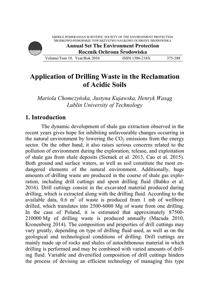 MIDDLE POMERANIAN SCIENTIFIC SOCIETY OF THE ENVIRONMENT PROTECTION ŚRODKOWO-POMORSKIE TOWARZYSTWO NAUKOWE OCHRONY ŚRODOWISKA Annual Set The Environment Protection Rocznik Ochrona Środowiska Volume/Tom 18. Year/Rok 2016 ISSN 1506-218X 375-388 Application of Drilling Waste in the Reclamation of Acidic Soils Mariola Chomczyńska, Justyna Kujawska, Henryk Wasąg Lublin University of Technology 1. Introduction The dynamic development of shale gas extraction observed in the recent years gives hope for inhibiting unfavourable changes occurring in the natural environment by lowering the CO2 emissions from the energy sector. On the other hand, it also raises serious concerns related to the pollution of environment during the exploration, release, and exploitation of shale gas from shale deposits (Siemek et al. 2013, Cao et al. 2015). Both ground and surface waters, as well as soil constitute the most endangered elements of the natural environment. Additionally, huge amounts of drilling waste are produced in the course of shale gas exploration, including drill cuttings and spent drilling fluid (Babko et al. 2016). Drill cuttings consist in the excavated material produced during drilling, which is extracted along with the drilling fluid. According to the available data, 0.6 m3 of waste is produced from 1 mb of wellbore drilled, which translates into 2500-6000 Mg of waste from one drilling. In the case of Poland, it is estimated that approximately 87500210000 Mg of drilling waste is produced annually (Macuda 2010, Kronenberg 2014). The composition and properties of drill cuttings may vary greatly, depending on type of drilling fluid used, as well as on the geological and technological conditions of drilling. Drill cuttings are mainly made up of rocks and shales of autochthonous material in which drilling is performed and may be combined with varied amounts of drilling fluid. Variable and diversified composition of drill cuttings hinders the process of devising an efficient technology of managing this type 376 Mariola Chomczyńska, Justyna Kujawska, Henryk Wasąg waste and complicates the assessment of their toxicity, as well as the determination of environmental impact (Abbe et al. 2009, Reichetseder 2016, Pawłowski et al. 2016, Burri 2016). Drill cuttings management in Poland is most frequently limited to depositing on waste disposal sites. Simultaneously, research work on the possibility of managing and utilizing this type of waste is performed. Studies on the usefulness of drill cuttings as a soil additive for swamp plants which were conducted in the USA showed that there is no significant difference between cultivating plants in soil modified with drill cuttings and its unmodified variant (Ball et al. 2012, Bielińska et. al. 2016, Bielińska et. al. 2015, Pawłowski et. al. 2015). The Taranaki technical report showed the influence of drill cuttings on the productivity of sandy soils. Changes in the level of nutrients caused by the drill cuttings addition enabled to convert non-productive soils into pastures (Technical report 2011, Żukowska et. al. 2016, Lindzen & Sloan 2016). Considering the properties of drill cuttings, the reclamation of acidic soils may prove to be an attractive method of managing this type of waste, which constitutes a problem both in Poland and other countries. Soil acidification is caused by natural and anthropogenic factors. The latter mainly consist of acid rains, intensive plant cultivation and application of high doses of physiologically acidic mineral fertilizers (Baran & Turski 1996, Karczewska 2008). Acidification of soils negatively impacts, among others, the quantitative proportions of soil microflora. In acidic soils fungi and actinobacteria are the dominant group, whereas bacteria decline. Therefore, various biochemical processes including, for instance, nitrification, organic matter decomposition and humus forming, slow down or – in extreme cases – stop altogether (Dobrzańska et al. 2008, Karczewska 2008). In order to counteract the negative effects of soil acidification, liming is a commonly employed solution. Liming can be performed by means of various calcium fertilizers of natural or industrial origin (Baran et al. 2011). The work presents the results of preliminary studies on the improvement of acidic soil properties by means of drill cuttings. 2. Materials and methods Acidic soil, drilling cuttings and ion exchange substrate Biona312 were used as basic materials in the study. Application of Drilling Waste in the Reclamation of Acidic Soils 377 Soil was taken from the field situated in Felin, near Lublin (Eastern Poland). It consisted of the following fractions: sand (2.0-0.05mm) – 22%; silt (0.05-0.002 mm) – 73%; clay (<0.002 mm) – 5%. The pH value of the soil in KCl solution was about 4.8. The contents of macronutrients available for plants in the soil were determined according to Polish standards (Lityński & Jurkowska 1982, Ostrowska et al. 1991). It was characterized by common (Mg), low (K, S), very low (P) or insufficient (N, Ca) contents of nutrients in terms of plants requirements – Table 1. Table 1. Contents of nutrients in soil Tabela 1. Zawartość makroskładników w glebie N-NH4 N-NO3 [mg per kg] 2.98 22.26 P2O5 3.40 K2O Mg [mg per 100g] 10.21 5.97 S-SO4 0.67 Ca [mg per dm3] 318.8 Drilling cuttings were obtained from the facility of mining waste utilization located in Luchów near Biłgoraj (Eastern Poland). Its granulometric composition was as follows: sand (2.0-0.05mm) – 75%; silt (0.05-0.002 mm) – 18%; clay (<0.002 mm) – 7%. The pH value of waste in KCl solution was about 9. The content of carbonates in waste equalled to 36.2% and the organic matter content was 8.5%. The metal contents in a solution obtained after waste mineralization with aqua regia (0.1 g of waste + 7 ml of the acid) was determined by ICP-OES JY 238 Ultrace (Table 2). Waste only contained high concentration of barium which was above the acceptable