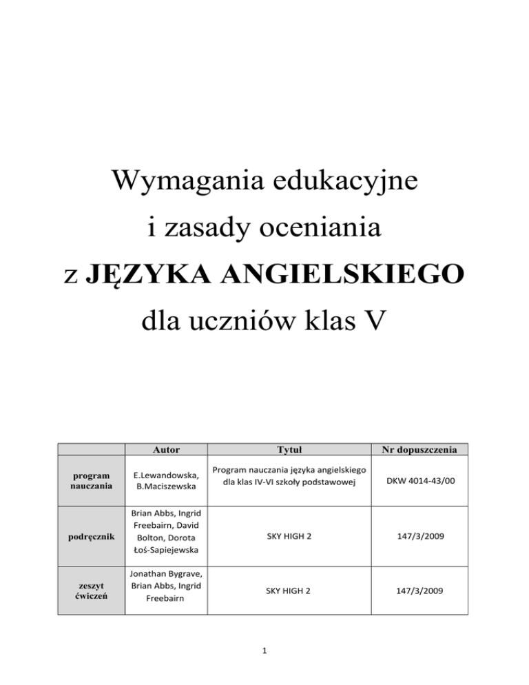 Wymagania edukacyjne i zasady oceniania dla uczniów klas V