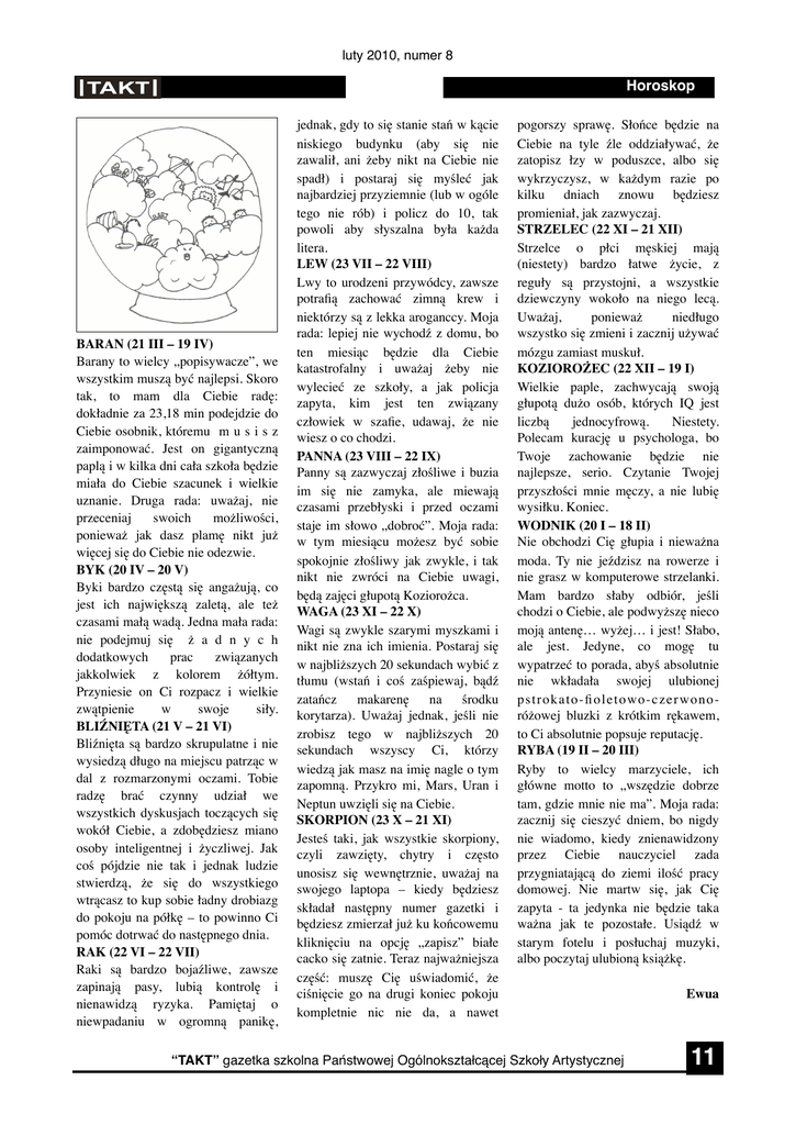 luty 2010, numer 8 Horoskop BARAN (21 III – 19 IV) Barany to wielcy „popisywacze”, we wszystkim muszą być najlepsi. Skoro tak, to mam dla Ciebie radę: dokładnie za 23,18 min podejdzie do Ciebie osobnik, któremu m u s i s z zaimponować. Jest on gigantyczną paplą i w kilka dni cała szkoła będzie miała do Ciebie szacunek i wielkie uznanie. Druga rada: uważaj, nie przeceniaj swoich możliwości, ponieważ jak dasz plamę nikt już więcej się do Ciebie nie odezwie. BYK (20 IV – 20 V) Byki bardzo częstą się angażują, co jest ich największą zaletą, ale też czasami małą wadą. Jedna mała rada: nie podejmuj się ż a d n y c h dodatkowych prac związanych jakkolwiek z kolorem żółtym. Przyniesie on Ci rozpacz i wielkie zwątpienie w swoje siły. BLIŹNIĘTA (21 V – 21 VI) Bliźnięta są bardzo skrupulatne i nie wysiedzą długo na miejscu patrząc w dal z rozmarzonymi oczami. Tobie radzę brać czynny udział we wszystkich dyskusjach toczących się wokół Ciebie, a zdobędziesz miano osoby inteligentnej i życzliwej. Jak coś pójdzie nie tak i jednak ludzie stwierdzą, że się do wszystkiego wtrącasz to kup sobie ładny drobiazg do pokoju na półkę – to powinno Ci pomóc dotrwać do następnego dnia. RAK (22 VI – 22 VII) Raki są bardzo bojaźliwe, zawsze zapinają pasy, lubią kontrolę i nienawidzą ryzyka. Pamiętaj o niewpadaniu w ogromną panikę, jednak, gdy to się stanie stań w kącie niskiego budynku (aby się nie zawalił, ani żeby nikt na Ciebie nie spadł) i postaraj się myśleć jak najbardziej przyziemnie (lub w ogóle tego nie rób) i policz do 10, tak powoli aby słyszalna była każda litera. LEW (23 VII – 22 VIII) Lwy to urodzeni przywódcy, zawsze potrafią zachować zimną krew i niektórzy są z lekka aroganccy. Moja rada: lepiej nie wychodź z domu, bo ten miesiąc będzie dla Ciebie katastrofalny i uważaj żeby nie wylecieć ze szkoły, a jak policja zapyta, kim jest ten związany człowiek w szafie, udawaj, że nie wiesz o co chodzi. PANNA (23 VIII – 22 IX) Panny są zazwyczaj złośliwe i buzia im się nie zamyka, ale miewają czasami przebłyski i przed oczami staje im słowo „dobroć”. Moja rada: w tym miesiącu możesz być sobie spokojnie złośliwy jak zwykle, i tak nikt nie zwróci na Ciebie uwagi, będą zajęci głupotą Koziorożca. WAGA (23 XI – 22 X) Wagi są zwykle szarymi myszkami i nikt nie zna ich imienia. Postaraj się w najbliższych 20 sekundach wybić z tłumu (wstań i coś zaśpiewaj, bądź zatańcz makarenę na środku korytarza). Uważaj jednak, jeśli nie zrobisz tego w najbliższych 20 sekundach wszyscy Ci, którzy wiedzą jak masz na imię nagle o tym zapomną. Przykro mi, Mars, Uran i Neptun uwzięli się na Ciebie. SKORPION (23 X – 21 XI) Jesteś taki, jak wszystkie skorpiony, czyli zawzięty, chytry i często unosisz się wewnętrznie, uważaj na swojego laptopa – kiedy będziesz składał następny numer gazetki i będziesz zmierzał już ku końcowemu kliknięciu na opcję „zapisz” białe cacko się zatnie. Teraz najważniejsza część: muszę Cię uświadomić, że ciśnięcie go na drugi koniec pokoju kompletnie nic nie da, a nawet pogorszy sprawę. Słońce będzie na Ciebie na tyle źle oddziaływać, że zatopisz łzy w poduszce, albo się wykrzyczysz, w każdym razie po kilku dniach znowu będziesz promieniał, jak zazwyczaj. STRZELEC (22 XI – 21 XII) Strzelce o płci męskiej mają (niestety) bardzo łatwe życie, z reguły są przystojni, a wszystkie dziewczyny wokoło na niego lecą. Uważaj, ponieważ niedługo wszystko się zmieni i zacznij używać mózgu zamiast muskuł. KOZIOROŻEC (22 XII – 19 I) Wielkie paple, zachwycają swoją głupotą dużo osób, których IQ jest liczbą jednocyfrową. Niestety. Polecam kurację u psychologa, bo Twoje zachowanie będzie nie najlepsze, serio. Czytanie Twojej przyszłości mnie męczy, a nie lubię wysiłku. Koniec. WODNIK (20 I – 18 II) Nie obchodzi Cię głupia i nieważna moda. Ty nie jeździsz na rowerze i nie grasz w komputerowe strzelanki. Mam bardzo słaby odbiór, jeśli chodzi o Ciebie, ale podwyższę nieco moją antenę… wyżej… i jest! Słabo, ale jest. Jedyne, co mogę tu wypatrzeć to porada, abyś absolutnie nie wkładała swojej ulubionej p s t r o k a t o - fi o l e t o w o - c z e r w o n o różowej bluzki z krótkim rękawem, to Ci absolutnie popsuje reputację. RYBA (19 II – 20 III) Ryby to wielcy marzyciele, ich główne motto to „wszędzie dobrze tam, gdzie mnie nie ma”. Moja rada: zacznij się cieszyć dniem, bo nigdy nie wiadomo, kiedy znienawidzony przez Ciebie nauczyciel zada przygniatającą do ziemi ilość pracy domowej. Nie martw się, jak Cię zapyta - ta jedynka nie będzie taka ważna jak te pozostałe. Usiądź w starym fotelu i posłuchaj muzyki, albo poczytaj ulubioną książkę. “TAKT” gazetka szkolna Państwowej Ogólnokształcącej Szkoły Artystycznej Ewua 11