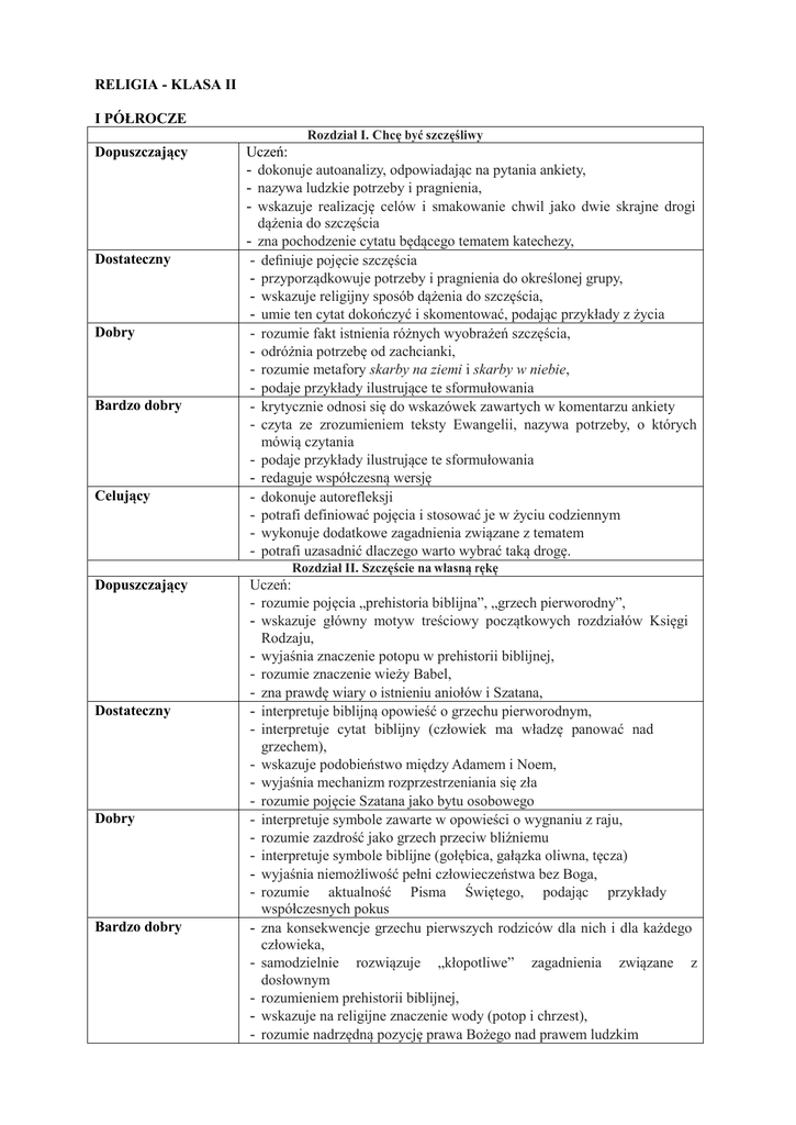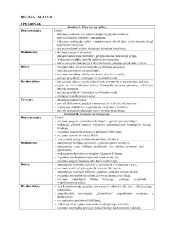 RELIGIA - KLASA II I PÓŁROCZE Rozdział I. Chcę być szczęśliwy Dopuszczający Dostateczny Dobry Bardzo dobry Celujący Uczeń: - dokonuje autoanalizy, odpowiadając na pytania ankiety, - nazywa ludzkie potrzeby i pragnienia, - wskazuje realizację celów i smakowanie chwil jako dwie skrajne drogi dążenia do szczęścia - zna pochodzenie cytatu będącego tematem katechezy, - definiuje pojęcie szczęścia - przyporządkowuje potrzeby i pragnienia do określonej grupy, - wskazuje religijny sposób dążenia do szczęścia, - umie ten cytat dokończyć i skomentować, podając przykłady z życia - rozumie fakt istnienia różnych wyobrażeń szczęścia, - odróżnia potrzebę od zachcianki, - rozumie metafory skarby na ziemi i skarby w niebie, - podaje przykłady ilustrujące te sformułowania - krytycznie odnosi się do wskazówek zawartych w komentarzu ankiety - czyta ze zrozumieniem teksty Ewangelii, nazywa potrzeby, o których mówią czytania - podaje przykłady ilustrujące te sformułowania - redaguje współczesną wersję - dokonuje autorefleksji - potrafi definiować pojęcia i stosować je w życiu codziennym - wykonuje dodatkowe zagadnienia związane z tematem - potrafi uzasadnić dlaczego warto wybrać taką drogę. Rozdział II. Szczęście na własną rękę Dopuszczający Dostateczny Dobry Bardzo dobry Uczeń: - rozumie pojęcia „prehistoria biblijna”, „grzech pierworodny”, - wskazuje główny motyw treściowy początkowych rozdziałów Księgi Rodzaju, - wyjaśnia znaczenie potopu w prehistorii biblijnej, - rozumie znaczenie wieży Babel, - zna prawdę wiary o istnieniu aniołów i Szatana, - interpretuje biblijną opowieść o grzechu pierworodnym, - interpretuje cytat biblijny (człowiek ma władzę panować nad grzechem), - wskazuje podobieństwo między Adamem i Noem, - wyjaśnia mechanizm rozprzestrzeniania się zła - rozumie pojęcie Szatana jako bytu osobowego - interpretuje symbole zawarte w opowieści o wygnaniu z raju, - rozumie zazdrość jako grzech przeciw bliźniemu - interpretuje symbole biblijne (gołębica, gałązka oliwna, tęcza) - wyjaśnia niemożliwość pełni człowieczeństwa bez Boga, - rozumie aktualność Pisma Świętego, podając przykłady współczesnych pokus - zna konsekwencje grzechu pierwszych rodziców dla nich i dla każdego człowieka, - samodzielnie rozwiązuje „kłopotliwe” zagadnienia związane z dosłownym - rozumieniem prehistorii biblijnej, - wskazuje na religijne znaczenie wody (potop i chrzest), - rozumie nadrzędną pozycję prawa Bożego nad prawem ludzkim - rozumie aktualność Pisma Świętego, podając przykłady współczesnych pokus Celujący - wskazuje sakrament łagodzący skutki grzechu pierworodnego - tłumaczy zależność między wolnością a poszanowaniem wolności drugiego człowieka - porównuje motywy mitologiczne z biblijnymi (potop) - rozumie nadrzędną pozycję prawa Bożego nad prawem ludzkim - rozumie aktualność Pisma Świętego, podając przykłady współczesnych pokus Rozdział III. Pomocna dłoń Boga Dopuszczający Dostateczny Dobry Bardzo dobry Celujący Uczeń: - opowiada historię Józefa Egipskiego, - opowiada historię Mojżesza (na podstawie streszczenia i fragmentów Księgi Wyjścia), - opowie o okolicznościach wyjścia ludu izraelskiego z Egiptu - wyjaśnia istotę zakazu i nakazu etycznego, - zna określenie „Opatrzność Boża” i wykorzystuje je do opisu sytuacji egzystencjalnych, - wskazuje argumenty „za” i „przeciw” powołaniu Mojżesza na wyzwoliciela ludu egipskiego - podaje sytuacje egzystencjalne uwidaczniające drogę do nawrócenia - podaje przykłady zakazów i nakazów etycznych, - rozumie znaczenie Bożego prowadzenia w życiu człowieka - wskazuje na przyczynę skuteczności działań Mojżesza, - wymienia cechy Bożego wybawienia, - wyjaśnia związek między wolnością człowieka a przestrzeganiem prawa - buduje alternatywny model historii Józefa, - zna opowiadanie o życiu Mojżesza z Dziejów Apostolich - wymienia cechy Bożego wybawienia, - wskazuje na cechy prawdziwej wolności - dokonuje autorefleksji pod kątem obecności Opatrzności Bożej w swoim życiu - wyjaśnia znaczenie imienia Boga „Jestem, Który Jestem”, - wymienia plagi egipskie i potrafi je zinterpretować religijnie - rozumie pojęcia „powołanie” i „obowiązek”, stosując je w dyskusji Rozdział IV. Bóg stał się jednym z nas Dopuszczający Dostateczny Dobry Bardzo dobry Uczeń: - opowiada historię narodzin Jezusa, - definiuje pojęcie „apokryf ”, - opowiada o ofiarowa Jezusa w Świątyni, - opowiada o znalezieniu Jezusa w Świątyni, - rozumie pojęcie „wcielenie”, - nazywa kulturę, w której urodził się Jezus, - tłumaczy religijną wymowę zwyczaju ofiarowania dziecka, - wyjaśnia religijną istotę przykazań w religii żydowskiej, - tłumaczy konieczność wcielenia w historii zbawienia, - wyjaśnia etymologię słowa „Jezus”, - interpretuje postawę i słowa Symeona, - wskazuje na aspekt dojrzałości w religii żydowskiej i chrześcijańskiej - porównuje biblijne opisy narodzenia Jezusa, - wyjaśnia zwyczaj nadawania imienia, - wskazuje potrzebę ratunku dla każdego człowieka - interpretuje słowa Jezusa w Świątyni, Celujący - tłumaczy pojęcie „kenoza”, interpretuje obraz „Boże Narodzenie” przeprowadza analogię między obrzezaniem chrztem interpretuje postawę i słowa Symeona rozważa pojęcia „powołania” jako zwykłej lub niezwykłej drogi życia II PÓŁROCZE Dopuszczający Dostateczny Dobry Bardzo dobry Celujący Dopuszczający Rozdział V. Zobacz i uwierz Uczeń: - zna przebieg „misji” Jezusa - zna sposób interpretacji przypowieści biblijnej, - podaje znaczenie cudu dla judaizmu i chrześcijaństwa, - wie, kim byli celnicy, a kim faryzeusze za czasów Jezusa, - rozumie sens modlitwy Ojcze nasz - podaje okoliczności przedstawienia Jezusa jako Syna Bożego, - opowiada jedną, wybrana przez sieb