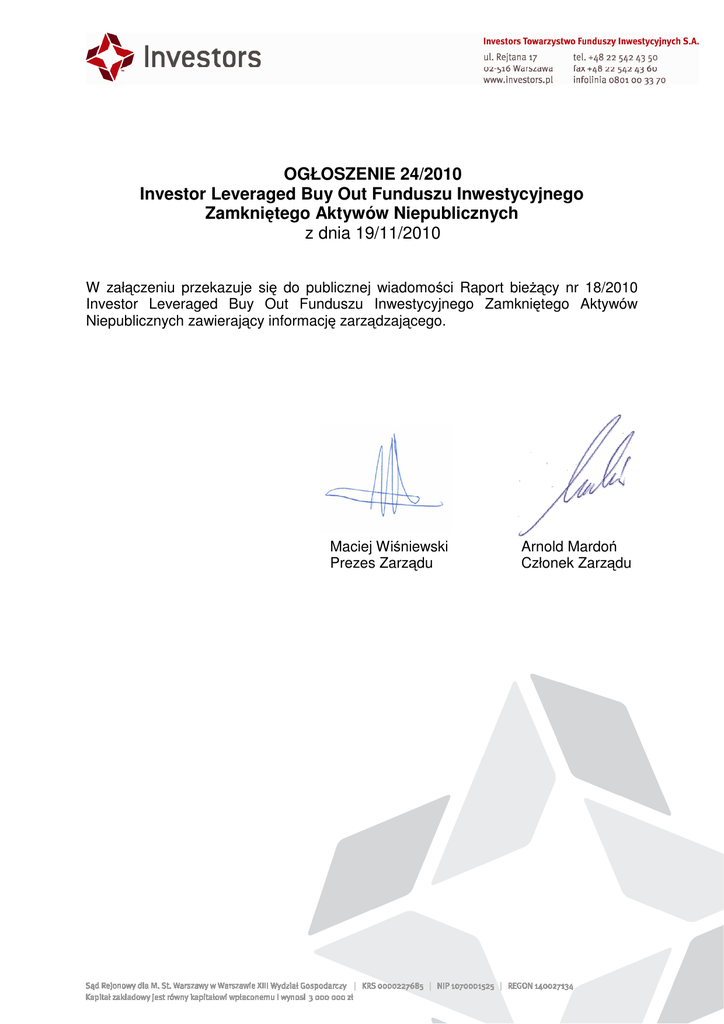 OGŁOSZENIE 24/2010 Investor Leveraged Buy Out Funduszu Inwestycyjnego Zamkniętego Aktywów Niepublicznych z dnia 19/11/2010 W załączeniu przekazuje się do publicznej wiadomości Raport bieżący nr 18/2010 Investor Leveraged Buy Out Funduszu Inwestycyjnego Zamkniętego Aktywów Niepublicznych zawierający informację zarządzającego. Maciej Wiśniewski Prezes Zarządu Arnold Mardoń Członek Zarządu INVESTOR LEVERAGED BUY OUT FIZ AKTYWÓW NIEPUBL. RB_FI_E 18 2010 korekta KOMISJANADZORUFINANSOWEGO Raport bieżący funduszu inwestycyjnego nr 18 / 2010 (numer kolejny raportu / rok) Data przekazania: 2010-11-19 Nazwa podmiotu: INVESTOR LEVERAGED BUY OUT FUNDUSZ INWESTYCYJNY ZAMKNIĘTY AKTYWÓ Temat raportu: Informac ja zarządzającego Podstawa prawna § 42 ust. 1 pkt 37 oie - inne zdarzenia, przewidziane statutem funduszu WIADOMOŚĆ Informujemy, że w dniu dzisiejszym Dom Inwestycyjny Investors S.A. zarządzający funduszem Investor Leveraged Buy Out Fundusz Inwestycyjny Zamknięty Aktywów Niepublicznych przekazał informację, że w dniu 22 listopada 2010 roku jest organizowany IPO Day, w ramach którego zostaną przekazane do publicznej wiadomości sporzadzone przez spółkę CB S.A. spodziewane wyniki finansowe za rok 2010 oraz prognoza wyników finansowych na rok 2011 dla Grupy CB. Spółka CB S.A. jest spółką portfelową Funduszu. Wobec powyższego przekazujemy w załączeniu spodziewane wyniki finansowe za rok 2010 oraz prognozę wyników finansowych na rok 2011 dla Grupy CB. Plik Opis Grupa CB prognoza.pdf PODPISYOSÓBREPREZENTUJĄCYCHPODMIOT Data Imię i Nazwisko Stanowisko/Funkc ja 2010-11-19 Grzegorz Mielcarek Członek Zarządu 2010-11-19 Beata Sax Członek Zarządu Podpis Komisja Nadzoru Finansowego 1