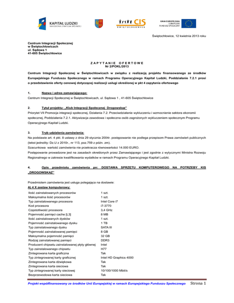 Świętochłowice, 12 kwietnia 2013 roku Centrum Integracji Społecznej w Świętochłowicach ul. Sądowa 1 41-605 Świętochłowice ZAPYTANIE OFERTOWE Nr 2/POKL/2013 Centrum Integracji Społecznej w Świętochłowicach w związku z realizacją projektu finansowanego ze środków Europejskiego Funduszu Społecznego w ramach Programu Operacyjnego Kapitał Ludzki, Poddziałanie 7.2.1 prosi o przedstawienie oferty cenowej dotyczącej realizacji usługi określonej w pkt 4 zapytania ofertowego 1. Nazwa i adres zamawiającego: Centrum Integracji Społecznej w Świętochłowicach, ul. Sądowa 1 , 41-605 Świętochłowice 2. Tytuł projektu: „Klub Integracji Społecznej Drogowskaz” Priorytet VII Promocja integracji społecznej, Działania 7.2. Przeciwdziałanie wykluczeniu i wzmocnienie sektora ekonomii społecznej, Poddziałania 7.2.1. Aktywizacja zawodowa i społeczna osób zagrożonych wykluczeniem społecznym Programu Operacyjnego Kapitał Ludzki. 3. Tryb udzielenia zamówienia: Na podstawie art. 4 pkt. 8 ustawy z dnia 29 stycznia 2004r. postępowanie nie podlega przepisom Prawa zamówień publicznych (tekst jednolity: Dz.U z 2010r., nr 113, poz.759 z późn. zm). Szacunkowa wartość zamówienia nie przekracza równowartości 14.000 EURO. Postępowanie prowadzone jest na zasadach określonych przez Zamawiającego i jest zgodnie z wytycznymi Ministra Rozwoju Regionalnego w zakresie kwalifikowania wydatków w ramach Programu Operacyjnego Kapitał Ludzki. 4. Opis przedmiotu zamówienia pn: DOSTAWA SPRZĘTU KOMPUTEROWEGO NA POTRZEBY KIS „DROGOWSKAZ” Przedmiotem zamówienia jest usługa polegająca na dostawie: A) 4 X zestaw komputerowy: Ilość zainstalowanych procesorów Maksymalna ilość procesorów Typ zainstalowanego procesora Kod procesora Częstotliwość procesora Pojemność pamięci cache [L3] Ilość zainstalowanych dysków Pojemność zainstalowanego dysku Typ zainstalowanego dysku Pojemność zainstalowanej pamięci Maksymalna pojemność pamięci Rodzaj zainstalowanej pamięci Producent chipsetu zainstalowanej płyty głównej Typ zainstalowanego chipsetu Zintegrowana karta graficzna Typ zintegrowanej karty graficznej Zintegrowana karta dźwiękowa Zintegrowana karta sieciowa Typ zintegrowanej karty sieciowej Bezprzewodowa karta sieciowa 1 szt. 1 szt. Intel Core i7 i7-3770 3,4 GHz 8 MB 1 szt. 1 TB SATA III 8 GB 32 GB DDR3 Intel H77 Tak Intel HD Graphics 4000 Tak Tak 10/100/1000 Mbit/s Tak Projekt współfinansowany ze środków Unii Europejskiej w ramach Europejskiego Funduszu Społecznego Strona 1 Typ bezprzewodowej karty sieciowej Bluetooth Czytnik kart pamięci Napędy wbudowane (zainstalowane) Interfejsy (wartości minimalne) IEEE 802.11b/g/n Tak Tak DVD±RW Dual Layer • 1 x 15-stykowe D-Sub (wejście na monitor) • 1 x HDMI • 4 x USB 3.0 • 1 x RJ-45 (LAN) • 1 x wyjście słuchawkowe • 1 x wejście na mikrofon • 1 x wyjście liniowe • 1 x SPDIF 19”, 1440x900, 1000:1, 5ms TAK TAK 36 miesięcy Monitor Mysz, klawiatura Moduł WIFI Gwarancja producenta B) 2 X Laptop: Klasa procesora Prędkość procesora Kod procesora Częstotliwość szyny QPI/DMI Pojemność pamięci podręcznej Pojemność dysku (HDD) Rodzaj dysku Prędkość obrotowa silnika Zainstalowana pamięć Rodzaj pamięci Przekątna ekranu LCD Maksymalna rozdzielczość LCD Karta graficzna Typ karty graficznej Zainstalowana pamięć wideo Karta dźwiękowa Napędy wbudowane (zainstalowane) Typ gniazda rozszerzeń Urządzenia wskazujące Rodzaj baterii Złącza zewn.(wartości minimalne) Mysz optyczna bezprzewodowa Gwarancja producenta Intel Core i7 od 2,1 GHz i7-3612QM 5 GT/s 6 MB 500 GB lub więcej Standardowy (nośnik magnetyczny) 7200 obr./min 4 GB lub więcej DDR3 15-16 cali 1920 x 1080 TAK AMD Radeon HD 7670M 1024 MB TAK DVD±RW Dual Layer 1 x Express Card 34 TouchPad Li-Ion • 1x 15-stykowe D-Sub (wyjście na monitor) • 1 x HDMI • 4x USB 3.0 • 1x RJ-45 (LAN) • wyjście słuchawkowe • wejście na mikrofon • wejście zasilania (DC-in) TAK 36 miesięcy C) 6 X oprogramowanie: Microsoft Windows 7 Professional 64 bit SP1 OEM PL Office Home and Business 2010 Polish PC Attach Key PKC Microcase Kaspersky Internet Security 2013PL – licencja 2 lata D) Dysk zewnętrzny Projekt współfinansowany ze środków Unii Europejskiej w ramach Europejskiego Funduszu Społecznego Strona 2 3TB, USB 3.0, Gwarancja 24 miesiące E) 2 X Torba na laptop - 16” F) 2 X Oprogramowanie Program OCR Abby FineReader 11 Pro PL Box G) Urządzenie wielofunkcyjne – Brother MFC – 7860DW Drukarka, skaner, kopiarka, fax, wifi, duplex, gwarancja 24 miesiące H) Router TP-Link TL-WDR3600 N600 Wireless Dual Band Router Zamawiający nie dopuszcza możliwości składania ofert częściowych. 5. Rodzaje i opis kryteriów, którymi Beneficjent będzie się kierował przy wyborze oferty, wraz z podaniem znaczenia tych kryteriów i sposobu oceny ofert oraz opis sposobu obliczenia ceny. Przy wyborze ofert Zamawiający będzie się kierował następującymi kryteriami: 1 kryterium: cena - waga 100% Sposób oceny ofert: C (cena oferty) = najniższa cena spośród złożonych ofert : cenę oferty badanej x 100 pkt. 6. Miejsce i termin realizacji zamówienia: Miejsce realizacji zamówienia: Centrum Integracji Społecznej w Świętochłowicach, ul. Sądowa 1, 41-605 Świętochłowice. Termin realizacji zamówienia: do 30 kwietnia 2013r. Sposób płatności: przelew w terminie do 14 dni od wystawienia faktury. 7. Sposób, miejsce i termin składania ofert: Ofertę należy złożyć na formularzu ofertowym, stanowiącym załącznik do niniejszego zapytania ofertowego. Ofertę można dostarczyć w wersji elektronicznej lub papierowej. Ofertę w wersji papierowej należy dostarczyć na adres Centrum Integracji Społecznej w Świętochłowicach, ul. Sądowa 1, 41605 Świętochłowice lub faksem na nr 32 24 555 24 dopiskiem: „Dostawa sprzętu komputerowego na potrzeby KIS Drogowskaz - POKL 7.2.1 - 2013” Ofertę w wersji elekt