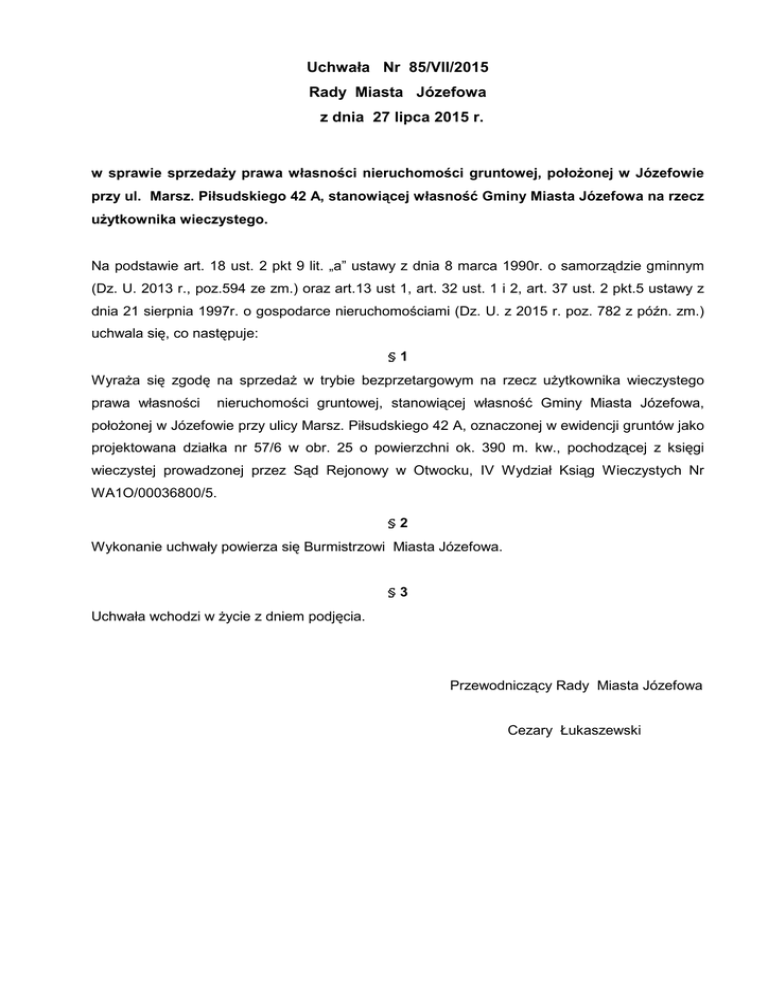 Uchwała Nr 85/VII/2015 Rady Miasta Józefowa z dnia 27 lipca 2015 r. w sprawie sprzedaży prawa własności nieruchomości gruntowej, położonej w Józefowie przy ul. Marsz. Piłsudskiego 42 A, stanowiącej własność Gminy Miasta Józefowa na rzecz użytkownika wieczystego. Na podstawie art. 18 ust. 2 pkt 9 lit. „a” ustawy z dnia 8 marca 1990r. o samorządzie gminnym (Dz. U. 2013 r., poz.594 ze zm.) oraz art.13 ust 1, art. 32 ust. 1 i 2, art. 37 ust. 2 pkt.5 ustawy z dnia 21 sierpnia 1997r. o gospodarce nieruchomościami (Dz. U. z 2015 r. poz. 782 z późn. zm.) uchwala się, co następuje: §1 Wyraża się zgodę na sprzedaż w trybie bezprzetargowym na rzecz użytkownika wieczystego prawa własności nieruchomości gruntowej, stanowiącej własność Gminy Miasta Józefowa, położonej w Józefowie przy ulicy Marsz. Piłsudskiego 42 A, oznaczonej w ewidencji gruntów jako projektowana działka nr 57/6 w obr. 25 o powierzchni ok. 390 m. kw., pochodzącej z księgi wieczystej prowadzonej przez Sąd Rejonowy w Otwocku, IV Wydział Ksiąg Wieczystych Nr WA1O/00036800/5. §2 Wykonanie uchwały powierza się Burmistrzowi Miasta Józefowa. §3 Uchwała wchodzi w życie z dniem podjęcia. Przewodniczący Rady Miasta Józefowa Cezary Łukaszewski Uzasadnienie do Uchwały Nr 85/VII/2015 Rady Miasta Józefowa z dnia 27 lipca 2015 r. w sprawie sprzedaży prawa własności nieruchomości gruntowej, położonej w Józefowie przy ul. Marsz. Piłsudskiego 42 A, stanowiącej własność Gminy Miasta Józefowa na rzecz użytkownika wieczystego. Nieruchomość stanowiąca własność Gminy Miasta Józefowa, położona w Józefowie przy ulicy Marsz. Piłsudskiego 42 A, oznaczona w ewidencji gruntów jako działka nr 57/1 w obr. 25 o powierzchni 402 m. kw., posiada urządzoną księgę wieczystą prowadzoną przez Sąd Rejonowy w Otwocku, IV Wydział Ksiąg Wieczystych Nr WA1O/00036800/5. Nieruchomość została oddana w użytkowanie wieczyste na okres 99 lat, tj. do dnia 27.01.2081 roku. Działka została zabudowana przez użytkownika wieczystego budynkiem handlowo-usługowym. Nieruchomość położona jest na terenie objętym ustaleniami miejscowego planu zagospodarowania przestrzennego, na terenie jednostki terenowej oznaczonej symbolem 19.MN+U. Przeznaczeniem podstawowym jednostki jest zabudowa mieszkaniowa jednorodzinna realizowana w formie zabudowy wolnostojącej lub bliźniaczej i usługi z zakresu usług podstawowych. Dopuszczona jest realizacja budynków i segmentów zarówno mieszkalnych, usługowych jak i o funkcji mieszanej. Zgodnie z wyżej powołanym planem część przedmiotowej nieruchomości położona jest w liniach rozgraniczających ulicy Piotra Skargi, z przeznaczeniem pod narożne ścięcie widoczności. W związku z powyższym na rzecz użytkownika wieczystego zostanie zbyta część nieruchomości oznaczona jako proj. dz. 57/6 w obr. 25, natomiast w stosunku do proj. dz. ew. 57/5 w obr. 25 nastąpi wygaszenie prawa użytkowania wieczystego, po podjęciu odpowiedniej uchwały w tej sprawie. Zgodnie z treścią art. 37 ust.2 pkt 5 ustawy z dnia 21 sierpnia 1997 r. o gospodarce nieruchomościami ( Dz. U. z 2015 poz. 782 ze zm.) nieruchomość jest zbywana w drodze bezprzetargowej, jeżeli sprzedaż nieruchomości następuje na rzecz jej użytkownika wieczystego. Zgodnie z treścią art. 32 ust. 1 i 2 ustawy z dnia 21 sierpnia 1997 r. o gospodarce nieruchomościami, nieruchomość gruntowa oddana w użytkowanie wieczyste może być sprzedana wyłącznie użytkownikowi wieczystemu. Z dniem zawarcia umowy sprzedaży nieruchomości wygasa, z mocy prawa, uprzednio ustanowione prawo użytkownika wieczystego. Z wnioskiem o zbycie prawa własności nieruchomości wystąpił użytkownik wieczysty nieruchomości. Przewodniczący Rady Miasta Józefowa Cezary Łukaszewski