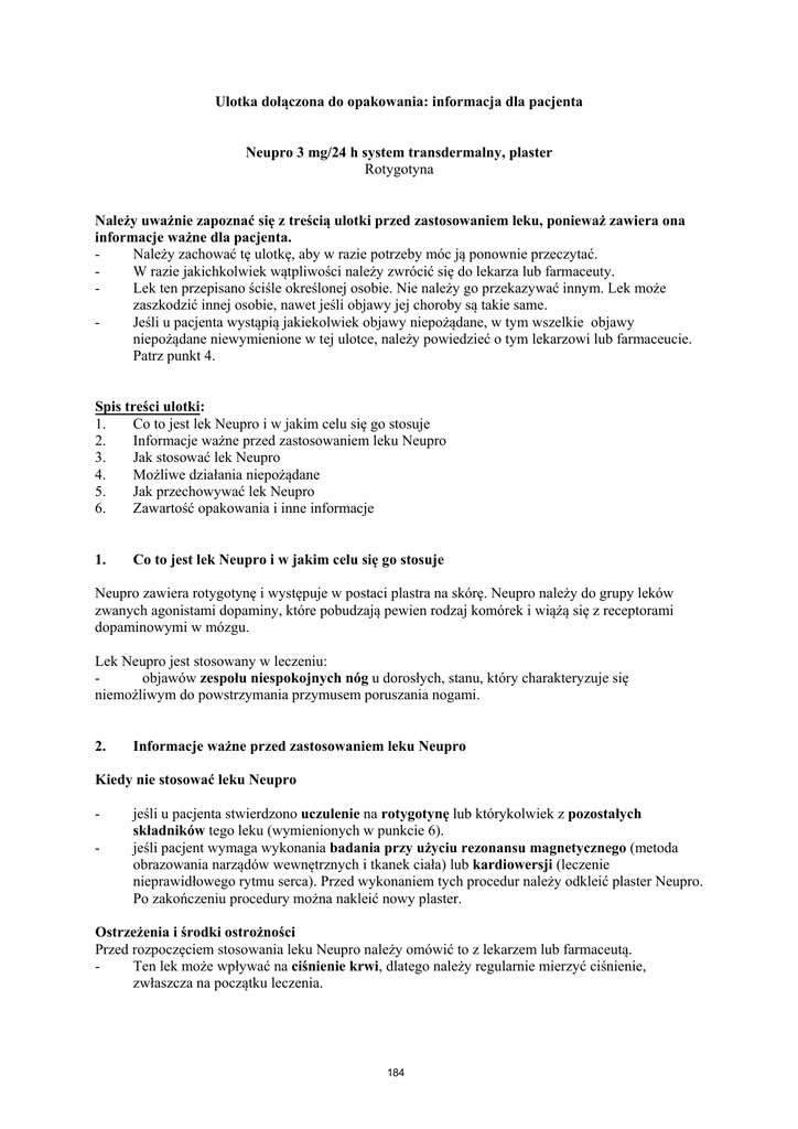 Ulotka dołączona do opakowania: informacja dla pacjenta Neupro 3 mg/24 h system transdermalny, plaster Rotygotyna Należy uważnie zapoznać się z treścią ulotki przed zastosowaniem leku, ponieważ zawiera ona informacje ważne dla pacjenta. Należy zachować tę ulotkę, aby w razie potrzeby móc ją ponownie przeczytać. W razie jakichkolwiek wątpliwości należy zwrócić się do lekarza lub farmaceuty. Lek ten przepisano ściśle określonej osobie. Nie należy go przekazywać innym. Lek może zaszkodzić innej osobie, nawet jeśli objawy jej choroby są takie same. Jeśli u pacjenta wystąpią jakiekolwiek objawy niepożądane, w tym wszelkie objawy niepożądane niewymienione w tej ulotce, należy powiedzieć o tym lekarzowi lub farmaceucie. Patrz punkt 4. Spis treści ulotki: 1. Co to jest lek Neupro i w jakim celu się go stosuje 2. Informacje ważne przed zastosowaniem leku Neupro 3. Jak stosować lek Neupro 4. Możliwe działania niepożądane 5. Jak przechowywać lek Neupro 6. Zawartość opakowania i inne informacje 1. Co to jest lek Neupro i w jakim celu się go stosuje Neupro zawiera rotygotynę i występuje w postaci plastra na skórę. Neupro należy do grupy leków zwanych agonistami dopaminy, które pobudzają pewien rodzaj komórek i wiążą się z receptorami dopaminowymi w mózgu. Lek Neupro jest stosowany w leczeniu: objawów zespołu niespokojnych nóg u dorosłych, stanu, który charakteryzuje się niemożliwym do powstrzymania przymusem poruszania nogami. 2. Informacje ważne przed zastosowaniem leku Neupro Kiedy nie stosować leku Neupro - jeśli u pacjenta stwierdzono uczulenie na rotygotynę lub którykolwiek z pozostałych składników tego leku (wymienionych w punkcie 6). jeśli pacjent wymaga wykonania badania przy użyciu rezonansu magnetycznego (metoda obrazowania narządów wewnętrznych i tkanek ciała) lub kardiowersji (leczenie nieprawidłowego rytmu serca). Przed wykonaniem tych procedur należy odkleić plaster Neupro. Po zakończeniu procedury można nakleić nowy plaster. Ostrzeżenia i środki ostrożności Przed rozpoczęciem stosowania leku Neupro należy omówić to z lekarzem lub farmaceutą. Ten lek może wpływać na ciśnienie krwi, dlatego należy regularnie mierzyć ciśnienie, zwłaszcza na początku leczenia. 184 - Zaleca się regularne przeprowadzanie badań wzroku podczas stosowania leku Neupro. Jeżeli wystąpią jakiekolwiek zaburzenia widzenia pomiędzy badaniami, należy niezwłocznie skontaktować się z lekarzem. - W razie ciężkich zaburzeń czynności wątroby lekarz może dostosować dawkę. W przypadku nasilenia się zaburzeń czynności wątroby, należy skontaktować się z lekarzem najszybciej jak to możliwe. - Jeśli u pacjenta wystąpi znaczna senność lub nagłe zasypianie, należy skontaktować się z lekarzem (patrz także poniżej w: „Prowadzenie pojazdów i obsługa maszyn”). - Należy poinformować lekarza, jeśli pacjent lub jego bliscy zauważą nietypowe zachowania bedące wynikiem nieodpartego popędu, pokusy, czy przymusu wykonania pewnych czynności, które mogą być szkodliwe dla pacjenta lub innych osób. Takie zachowania są nazywane zaburzeniami nawyków i popędów i mogą obejmować uzależnienie od hazardu, napadowe objadanie się lub wydawanie pieniędzy, nadmierny popęd seksualny lub nasilone myśli i odczucia seksualne. Lekarz może zadecydować o dostosowaniu leczenia lub odstawieniu leku. - Lek Neupro może powodować zaburzenia myślenia i zachowania. Zaburzenia myślenia i zachowania mogą przejawiać się rozmaicie, w tym przez zaburzone postrzeganie rzeczywistości, urojenia, omamy (widzenie lub słyszenie nieistniejących zjawisk), splątanie, dezorientację, zachowania agresywne, pobudzenie i majaczenie. W razie wystąpienia takich objawów, należy skontaktować się z lekarzem. - Podobnie jak w przypadku innych plastrów lub bandaży, Neupro może powodować odczyny skórne takie jak zaczerwienienie i świąd. Są one zwykle łagodne i najczęściej dotyczą tylko obszaru skóry, na którym znajdował się plaster. Reakcje te przemijają zazwyczaj w ciągu kilku godzin od usunięcia plastra. W przypadku odczynu skórnego utrzymującego się dłużej niż kilka dni, jeśli rozwinie się ciężki odczyn skórny lub jeśli odczyn skórny ulegnie rozszerzeniu poza miejsce naklejenia plastra, należy skontaktować się z lekarzem. Należy unikać narażenia na światło słoneczne i solarium okolicy z objawami jakiegokolwiek odczynu skórnego spowodowanego lekiem Neupro. Aby zapobiec wystąpieniu reakcji skórnych, należy przyklejać plaster codziennie w innym miejscu, w tym samym miejscu można przykleić plaster po upływie 14 dni. - Może się zdarzyć, że objawy zespołu niespokojnych nóg wystąpią wcześniej, niż zwykle, będą bardziej intensywne i obejmą pozostałe kończyny. - Nie należy stosować leku Neupro u dzieci ponieważ nie ustalono bezpieczeństwa stosowania i skuteczności u dzieci. Inne leki i Neupro Należy powiedzieć lekarzowi lub farmaceucie o wszystkich lekach przyjmowanych przez pacjenta obecnie lub ostatnio, a także o lekach, które pacjent planuje przyjmować. Z uwagi na możliwość zmniejszenia skuteczności leku Neupro nie powinno się go stosować równocześnie z lekami przeciwpsychotycznymi (stosowanymi w leczeniu niektórych chorób psychicznych) ani z metoklopramidem (stosowanym przeciw nudnościom i wymiotom). W przypadku jednoczesnego stosowania leku Neupro i lewodopy niektóre działania niepożądane mogą się nasilić, np. widzenie lub słyszenie nieistniejących zjawisk (omamy), mimowolne ruchy związane z chorobą Parkinsona (dyskineza) oraz obrzęk nóg i stóp. Należy skonsultować się z lekarzem, czy podczas stosowania leku Neupro bezpieczne jest dla pacjenta: spożywanie alkoholu 185 - przyjmowanie leków uspokajających (np. benzodiazepin, leków stosowanych w leczeniu chorób psychicznych i depresji). Neupro z jedzenie