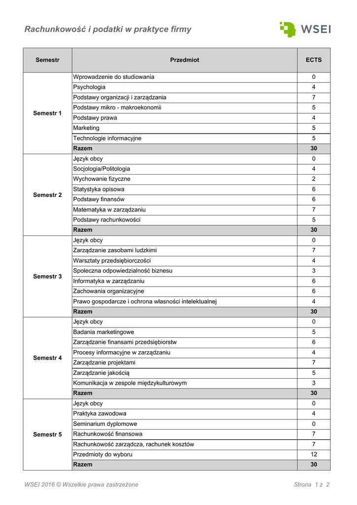 5DFKXQNRZRĞüLSRGDWNLZSUDNW\FHILUP\ Semestr Semestr 1 Semestr 2 Semestr 3 Semestr 4 Semestr 5 Przedmiot ECTS Wprowadzenie do studiowania 0 Psychologia 4 3RGVWDZ\RUJDQL]DFMLL]DU]ąG]DQLD 7 Podstawy mikro - makroekonomii 5 Podstawy prawa 4 Marketing 5 Technologie informacyjne 5 Razem 30 -Ċ]\NREF\ 0 Socjologia/Politologia 4 Wychowanie fizyczne 2 Statystyka opisowa 6 Podstawy finansów 6 0DWHPDW\NDZ]DU]ąG]DQLX 7 3RGVWDZ\UDFKXQNRZRĞFL 5 Razem 30 -Ċ]\NREF\ 0 =DU]ąG]DQLH]DVREDPLOXG]NLPL 7 :DUV]WDW\SU]HGVLĊELRUF]RĞFL 4 6SRáHF]QDRGSRZLHG]LDOQRĞüEL]QHVX 3 ,QIRUPDW\NDZ]DU]ąG]DQLX 6 Zachowania organizacyjne 6 3UDZRJRVSRGDUF]HLRFKURQDZáDVQRĞFLLQWHOHNWXDOQHM 4 Razem 30 -Ċ]\NREF\ 0 Badania marketingowe 5 =DU]ąG]DQLHILQDQVDPLSU]HGVLĊELRUVWZ 6 3URFHV\LQIRUPDF\MQHZ]DU]ąG]DQLX 4 =DU]ąG]DQLHSURMHNWDPL 7 =DU]ąG]DQLHMDNRĞFLą 5 .RPXQLNDFMDZ]HVSROHPLĊG]\NXOWXURZ\P 3 Razem 30 -Ċ]\NREF\ 0 Praktyka zawodowa 4 Seminarium dyplomowe 0 5DFKXQNRZRĞüILQDQVRZD 7 5DFKXQNRZRĞü]DU]ąGF]DUDFKXQHNNRV]WyZ 7 Przedmioty do wyboru 12 Razem 30 :6(,:V]HONLHSUDZD]DVWU]HĪRQH Strona 1 z 2 5DFKXQNRZRĞüLSRGDWNLZSUDNW\FHILUP\ Semestr Semestr 6 Razem Przedmiot ECTS -Ċ]\NREF\ 8 Seminarium dyplomowe 10 8SURV]F]RQHIRUP\HZLGHQFMLG]LDáDOQRĞFLJRVSRGDUF]HM 4 5DFKXQNRZRĞüSRGDWNRZDLRSW\PDOL]DFMHSRGDWNRZH 4 Przedmioty do wyboru 4 Razem 30 Razem 180 (&76(XURSHDQ&UHGLW7UDQVIHU6\VWHP']LĊNLZGURĪHQLX(&76HXURSHMVF\VWXGHQFLPDMąPRĪOLZRĞüSRGMĊFLD OXENRQW\QXDFMLVWXGLyZZHZV]\VWNLFKXF]HOQLDFKUHDOL]XMąF\FKSURMHNW8áDWZLDWRZ\MD]GQDXF]HOQLH]DJUDQLF]QH DWDNĪHZ\PLDQĊVWXGHQWyZPLĊG]\SROVNLPLXF]HOQLDPLNWyUHZGURĪ\á\(&76 &3U]HGPLRWSU]\JRWRZXMąF\GRHJ]DPLQXFHU\ILNDF\MQHJR :6(,:V]HONLHSUDZD]DVWU]HĪRQH Strona 2 z 2