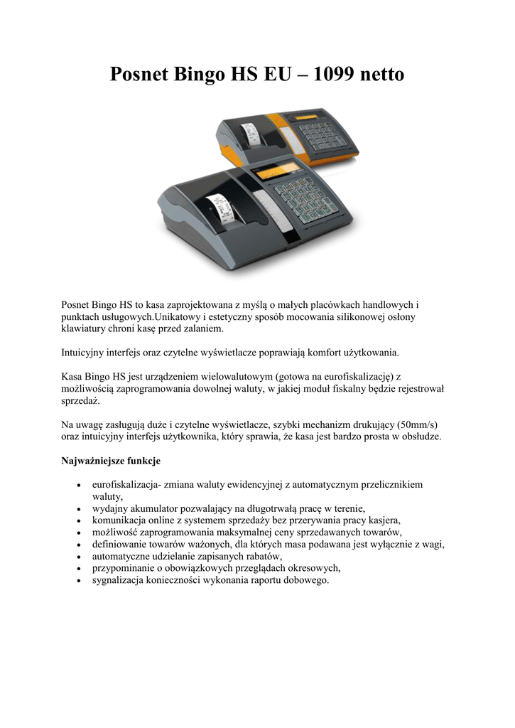 Posnet Bingo HS EU – 1099 netto Posnet Bingo HS to kasa zaprojektowana z myślą o małych placówkach handlowych i punktach usługowych.Unikatowy i estetyczny sposób mocowania silikonowej osłony klawiatury chroni kasę przed zalaniem. Intuicyjny interfejs oraz czytelne wyświetlacze poprawiają komfort użytkowania. Kasa Bingo HS jest urządzeniem wielowalutowym (gotowa na eurofiskalizację) z możliwością zaprogramowania dowolnej waluty, w jakiej moduł fiskalny będzie rejestrował sprzedaż. Na uwagę zasługują duże i czytelne wyświetlacze, szybki mechanizm drukujący (50mm/s) oraz intuicyjny interfejs użytkownika, który sprawia, że kasa jest bardzo prosta w obsłudze. Najważniejsze funkcje eurofiskalizacja- zmiana waluty ewidencyjnej z automatycznym przelicznikiem waluty, wydajny akumulator pozwalający na długotrwałą pracę w terenie, komunikacja online z systemem sprzedaży bez przerywania pracy kasjera, możliwość zaprogramowania maksymalnej ceny sprzedawanych towarów, definiowanie towarów ważonych, dla których masa podawana jest wyłącznie z wagi, automatyczne udzielanie zapisanych rabatów, przypominanie o obowiązkowych przeglądach okresowych, sygnalizacja konieczności wykonania raportu dobowego.