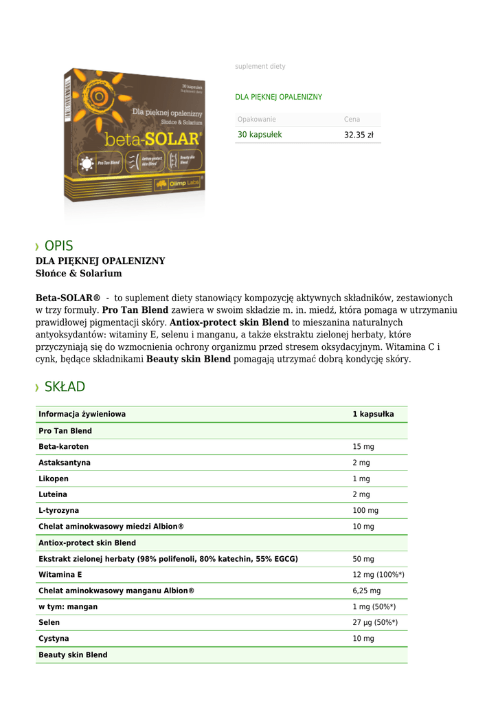 suplement diety DLA PIĘKNEJ OPALENIZNY Opakowanie Cena 30 kapsułek 32.35 zł OPIS DLA PIĘKNEJ OPALENIZNY Słońce & Solarium Beta-SOLAR® - to suplement diety stanowiący kompozycję aktywnych składników, zestawionych w trzy formuły. Pro Tan Blend zawiera w swoim składzie m. in. miedź, która pomaga w utrzymaniu prawidłowej pigmentacji skóry. Antiox-protect skin Blend to mieszanina naturalnych antyoksydantów: witaminy E, selenu i manganu, a także ekstraktu zielonej herbaty, które przyczyniają się do wzmocnienia ochrony organizmu przed stresem oksydacyjnym. Witamina C i cynk, będące składnikami Beauty skin Blend pomagają utrzymać dobrą kondycję skóry. SKŁAD Informacja żywieniowa 1 kapsułka Pro Tan Blend Beta-karoten 15 mg Astaksantyna 2 mg Likopen 1 mg Luteina 2 mg L-tyrozyna 100 mg Chelat aminokwasowy miedzi Albion® 10 mg Antiox-protect skin Blend Ekstrakt zielonej herbaty (98% polifenoli, 80% katechin, 55% EGCG) 50 mg Witamina E 12 mg (100%*) Chelat aminokwasowy manganu Albion® 6,25 mg w tym: mangan 1 mg (50%*) Selen 27 µg (50%*) Cystyna 10 mg Beauty skin Blend Kwas hialuronowy 1 mg PureWay-C® Opatentowany kompleks witaminy C i bioflawonoidów cytrusowych 88,9 mg w tym: witamina C 80 mg (100%*) Chelat aminokwasowy cynku Albion® 50 mg w tym: cynk 10 mg (100%*) *RWS - referencyjna wartość spożycia. Składniki: beta–karoten, L-tyrozyna, witaminy (kwas L-askorbinowy – wit. C (PureWay-C®), octan DL-α-tokoferylu – wit. E), składniki mineralne [diglicynian cynku (chelat aminokwasowy cynku Albion®), diglicynian miedzi (chelat aminokwasowy miedzi Albion®), diglicynian manganu (chelat aminokwasowy manganu Albion®), selenian (IV) sodu], ekstrakt zielonej herbaty, astaksantyna, likopen, luteina, cystyna, hialuronian sodu, bioflawonoidy cytrusowe, celuloza mikrokrystaliczna substancja wypełniająca, stearynian magnezu - substancja przeciwzbrylająca, kapsułka (żelatyna – składnik otoczki, barwnik: E 171) PRZEZNACZENIE Preparat polecany: osobom korzystającym z kąpieli słonecznych i solarium dążącym do uzyskania pięknej opalenizny oraz ochrony skóry przed stresem oksydacyjnym. DAWKOWANIE Zalecana dzienna porcja: 1 kapsułka dziennie pomiędzy posiłkami. Nie należy przekraczać zalecanej dziennej porcji do spożycia w ciągu dnia. Suplement diety nie może być stosowany jako substytut zróżnicowanej diety. Zalecany jest zrównoważony sposób żywienia i zdrowy tryb życia. Uwaga: nie należy stosować w przypadku nadwrażliwości na którykolwiek ze składników preparatu.