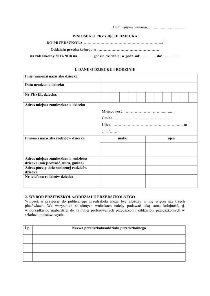 Data wpływu wniosku…………………………… WNIOSEK O PRZYJĘCIE DZIECKA DO PRZEDSZKOLA ……………………………………………………./ Oddziału przedszkolnego w ………………………………………… na rok szkolny 2017/2018 na …….….. godzin dziennie; w godz. od: .……….. do: ….…….. . 1. DANE O DZIECKU I RODZINIE Imię (imiona)i nazwisko dziecka Data urodzenia dziecka Nr PESEL dziecka, Adres miejsca zamieszkania dziecka Miejscowość: …………………………..…..… Gmina: ……………..…….………………….. Ulica. …………………………………………….… nr ….../…… Imiona i nazwiska rodziców dziecka matki ojca Adres miejsca zamieszkania rodziców dziecka (miejscowość, ulica, gmina) Adres poczty elektronicznej rodziców dziecka Nr telefonu rodziców dziecka 2. WYBÓR PRZEDSZKOLA/ODDZIAŁU PRZEDSZKOLNEGO Wniosek o przyjęcie do publicznego przedszkola może być złożony w nie więcej niż trzech placówkach. We wszystkich składanych wnioskach należy podawać taką samą kolejność, tj. w porządku od najbardziej do najmniej preferowanych przedszkoli / oddziałów przedszkolnych w szkołach podstawowych. Lp. Nazwa przedszkola/oddziału przedszkolnego 3. POTWIERDZENIE SPEŁNIENIA KRYTERIUM Znakiem „X” należy zaznaczyć spełnienie kryterium w poszczególnych etapach postępowania rekrutacyjnego w kolumnie II. 1. wielodzietność rodziny kandydata (rodzina wychowująca troje i więcej dzieci) 2. niepełnosprawność kandydata 3. niepełnosprawność jednego z rodziców kandydata 4. niepełnosprawność obojga rodziców kandydata; 5. niepełnosprawność rodzeństwa kandydata; 6. samotne wychowywanie kandydata w rodzinie (wychowywanie dziecka przez pannę, kawalera, wdowę, wdowca, osobę pozostającą w separacji orzeczonej prawomocnym wyrokiem sądu, osobę rozwiedzioną chyba, że osoba taka wychowuje wspólnie co najmniej jedno dziecko z jego rodzicem); 7. objęcie kandydata pieczą zastępczą Załączniki składane z wnioskiem, potwierdzające spełnienie kryterium Spełnienie kryterium znak „X” A: Pierwszy etap rekrutacji kryteria ustawowe Uwagi oświadczenie wnioskodawcy o wielodzietności rodziny kandydata orzeczenie o potrzebie kształcenia specjalnego wydane ze względu na niepełnosprawność ( o ile takie wystawiono); orzeczenie o niepełnosprawności lub o stopniu niepełnosprawności lub orzeczenie równoważne w rozumieniu przepisów ustawy z dnia 27 sierpnia 1997 r.o rehabilitacji zawodowej i społecznej oraz zatrudnianiu osób niepełnosprawnych (Dz.U. z 201 r. Nr 127, poz. 721, z późn. zm.), prawomocny wyrok sądu rodzinnego orzekający rozwód lub separację lub akt zgonu oraz oświadczenie o samotnym wychowywaniu dziecka oraz oświadczenie o niewychowywaniu żadnego dziecka wspólnie z jego rodzicem dokument poświadczający objęcie dziecka pieczą zastępczą zgodnie z ustawą z dnia 9 czerwca 2011r. o wspieraniu rodziny i systemie pieczy zastępczej B: Drugi etap rekrutacji - kryteria ustalone przez organ prowadzący 1. Kandydaci podlegający rocznemu Wg daty urodzenia obowiązkowemu przygotowaniu przedszkolnemu, kandydaci z odroczonym obowiązkiem szkolnym 2. Przedszkole wskazane we wniosku jest Oświadczenie wnioskodawcy o położeniu najbliżej położone od miejsca przedszkola zamieszkania dziecka 3. Przedszkole wskazane we wniosku jest Oświadczenie wnioskodawcy o położeniu najbliżej położone od miejsca pracy przedszkola względem pracy rodzica jednego z rodziców 4. Deklarowany czas pobytu kandydata w Oświadczenie rodziców kandydata dotyczące przedszkolu powyżej 5 godzin deklarowanego czasu pobytu dziecka w przedszkolu 5. Dziecko, którego rodzeństwo uczęszcza Oświadczenie rodziców kandydata o już do danego przedszkola lub szkoły kontynuowaniu wychowania przedszkolnego w podstawowej tym przedszkolu przez rodzeństwo kandydata 6. Kandydat, którego obydwoje Oświadczenie rodziców kandydata o rodziców/prawnych opiekunów pracują, zatrudnieniu lub prowadzeniu działalności wykonują pracę na podstawie umowy gospodarczej lub prowadzenie działalności cywilnoprawnej, uczą się w trybie rolniczej lub pobieranie nauki w systemie dziennym, prowadzą gospodarstwo rolne dziennym lub działalność gospodarczą, a w przypadku samotnego wychowywania dziecka, gdy rodzic pracuje (Wzory oświadczeń stanowią załącznik do Wniosku o przyjęcie dziecka do (…) na rok szkolny 2017/2018) - Załączniki składane są w oryginale, notarialnie poświadczonej kopii albo w postaci urzędowo poświadczonego, zgodnie z art. 76a § 1 Kodeksu postępowania administracyjnego, odpisu lub wyciągu z dokumentu; mogą być składane także w postaci kopii poświadczanych za zgodność z oryginałem przez wnioskodawcę. -Oświadczenia są składane pod rygorem odpowiedzialności karnej za składanie fałszywych zeznań. - Błędne wypełnienie wniosku (brak oświadczeń, wymaganych danych, podpisów, dat) może skutkować nie rozpatrywaniem Wniosku przez Komisję 4. SKŁADANE DO WNIOSKU ZAŁĄCZNIKI, proszę wymienić: 1) ………………………………………………………………………………………………………… 2) ………………………………………………………………………………………………………… 3) ………………………………………………………………………………………………………… 4) ………………………………………………………………………………………………………… 5) ………………………………………………………………………………………………………… 6) ………………………………………………………………………………………………………… 7) ………………………………………………………………………………………………