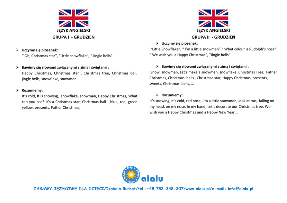 JĘZYK ANGIELSKI GRUPA I - GRUDZIEŃ Uczymy się piosenek: “ Oh, Christmas star”, “Little snowflake”, “ Jingle bells” Bawimy się słowami związanymi z zima i świętami : Happy Christmas, Christmas star , Christmas tree, Christmas ball, jingle bells, snowflake, snowmen... Rozumiemy: It’s cold, It is snowing, snowflake, snowman, Happy Christmas, What can you see? It’s a Christmas star, Christmas ball - blue, red, green yellow, presents, Father Christmas, JĘZYK ANGIELSKI GRUPA II - GRUDZIEŃ Uczymy się piosenek: “Little Snowflake”, “ I’m a little snowmen”,” What colour is Rudolph’s nose” ” We wish you a Happy Christmas”, “Jingle bells” Bawimy się słowami związanymi z zimą i świętami : Snow, snowmen, Let’s make a snowmen, snowflake, Christmas Tree, Father Christmas, Christmas balls , Christmas star, Happy Christmas, presents, sweets, Christmas bells, ... Rozumiemy: It’s snowing, It’s cold, red nose, I’m a little snowmen, look at me, falling on my head, on my nose, in my hand, Let’s decorate our Christmas tree, We wish you a Happy Christmas and a Happy New Year... ZABAWY JĘZYKOWE DLA DZIECI/Izabela Burkat/tel.:+48 783-348-207/www.alalu.pl/e-mail: [email protected] JĘZYK ANGIELSKI GRUPA III – GRUDZIEŃ Uczymy się piosenek: “ Snowflake”,“ What do you want for Christmas ”, “Three Christmas trees” “I’m a dancing Christmas tree”, We wish you a happy Christmas”, “ Jingle bells” Bawimy się słowami związanymi z zimą i świętami: Snow, snowmen, Let’s make a snowmen, snowflake, snowball, Christmas cards, Christmas Tree, Father Christmas, sleigh, Christmas balls , Christmas star, stocking, Happy Christmas, presents, sweets, Christmas bells, candy cane, gingerbread, Rozumiemy: We wish you a Happy Christmas and a Happy New Year, (...)What’s in the box?, Are you Father Christmas? What colour is Rudolph’s nose?, Let’s decorate a Christmas tree, Let’s make cookies, Snowball fight, Let’s build a snowman, It’s snowing, Jingle bells , It’s a present, ....It’s red and white, What do you want for Christmas ... ZABAWY JĘZYKOWE DLA DZIECI/Izabela Burkat/tel.:+48 783-348-207/www.alalu.pl/e-mail: [email protected]