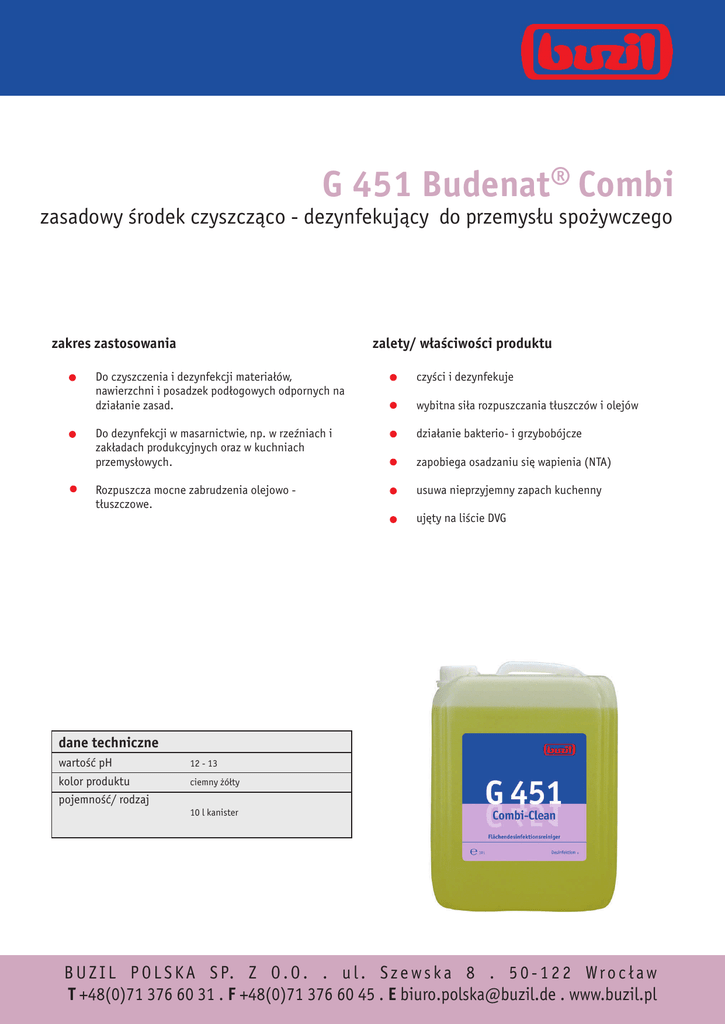 G 451 Budenat® Combi zasadowy środek czyszcząco - dezynfekujący do przemysłu spożywczego zakres zastosowania zalety/ właściwości produktu Do czyszczenia i dezynfekcji materiałów, nawierzchni i posadzek podłogowych odpornych na działanie zasad. czyści i dezynfekuje Do dezynfekcji w masarnictwie, np. w rzeźniach i zakładach produkcyjnych oraz w kuchniach przemysłowych. działanie bakterio- i grzybobójcze Rozpuszcza mocne zabrudzenia olejowo tłuszczowe. usuwa nieprzyjemny zapach kuchenny wybitna siła rozpuszczania tłuszczów i olejów zapobiega osadzaniu się wapienia (NTA) ujęty na liście DVG dane techniczne wartość pH 12 - 13 kolor produktu ciemny żółty pojemność/ rodzaj 10 l kanister B U Z I L P O L S K A S P. Z O . O . . u l . S z e w s k a 8 . 5 0 - 1 2 2 W r o c ł a w T +48(0)71 376 60 31 . F +48(0)71 376 60 45 . E [email protected] . www.buzil.pl G 451 Budenat® Combi zasadowy środek czyszcząco - dezynfekujący do przemysłu spożywczego zastosowanie i dozowanie produkty uzupełniające Do przemysłu spożywczego. Zasadowy środek do czyszczenia nawierzchni: G 435 Bistro. Kwaśny środek czyszczący: G 461 Buz® Contracalc. Do posadzek podłogowych odpornych na działanie zasad. Dozowanie zgodnie z listą DVG: 1,0 % = 100 ml/10 l wody -min. 1 h działania 2,0 % = 200 ml/10 l wody - min. 1/2 h działania znaki ostrzegawcze - oznakowanie wg dyrektywy Parlamentu Europejskiego i Rady 1999/45/WE Xi N R36/38 R 50 S 2 S 26 S 28 S 46 S57 Produkt drażniący. Produkt niebezpieczny dla środowiska. Działa drażniąco na oczy i skórę. Działa bardzo toksycznie na organizmy wodne Chronić przed dziećmi. Zanieczyszczone oczy przemyć natychmiast dużą ilością wody i zasięgnąć porady lekarza. Zanieczyszczoną skórę natychmiast przemyć dużą ilością wody. W razie połknięcia niezwłocznie zasięgnij porady lekarza - pokaż opakowanie lub etykietkę. Używać odpowiednich pojemników zapobiegających skażeniu środowiska ważne wskazówki Zawsze używać zimnej wody. Puste opakowanie oddać do punktu skupu surowców wtórnych. Szczegółowe informacje znajdziecie Państwo w karcie charakterystyki preparatu niebezpiecznego do produktu G 451 Budenat® Combi na stronie www.buzil.com. Butelki lub przedmioty mające bezpośredni kontakt z żywnością oczyścić po czasie działania produktu z jego resztek poprzez obfite spłukanie wodą. kod GISBAU: GD 30 numer artykułu: G451-0010 Dane zawarte w informacjach o produktach bazują na naszych doświadczeniach oraz badaniach i odpowiadają naszemu dzisiejszemu stanowi wiedzy. Różnorodność warunków panujących w obiektach oraz cech materiałów uniemożliwia jednak uwzględnienie wszystkich przypadków. Dlatego w informacjach technicznych możemy podać jedynie ogólne wskazówki odnośnie stosowania produktu. Jakość pracy zależy zatem od fachowej oceny obiektu dokonanej przez użytkownika. W przypadkach spornych jest on zobowiązany sprawdzić działanie produktu firmy Buzil na ukrytym kawałku nawierzchni przeznaczonej do czyszczenia lub zasięgnąć porady odnośnie techniki zastosowania. Ponosimy odpowiedzialność za niepełne lub niewłaściwe dane zawarte w naszych materiałach informacyjnych tylko w przypadku rażącej winy (działanie zamierzone lub rażące zaniedbanie); pozostałe roszczenia wynikające z rękojmi pozostają nienaruszone. Poprzez wprowadzenie tej informacji technicznej unieważniamy wszystkie poprzednie informacje techniczne. Wersja/nr druku: TDG451/01/13 B U Z I L P O L S K A S P. Z O . O . . u l . S z e w s k a 8 . 5 0 - 1 2 2 W r o c ł a w T +48(0)71 376 60 31 . F +48(0)71 376 60 45 . E [email protected] . www.buzil.pl