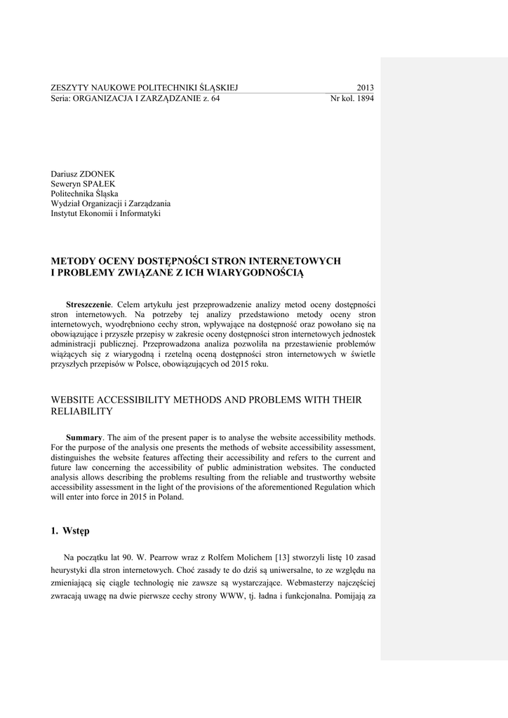 ZESZYTY NAUKOWE POLITECHNIKI ŚLĄSKIEJ Seria: ORGANIZACJA I ZARZĄDZANIE z. 64 2013 Nr kol. 1894 Dariusz ZDONEK Seweryn SPAŁEK Politechnika Śląska Wydział Organizacji i Zarządzania Instytut Ekonomii i Informatyki METODY OCENY DOSTĘPNOŚCI STRON INTERNETOWYCH I PROBLEMY ZWIĄZANE Z ICH WIARYGODNOŚCIĄ Streszczenie. Celem artykułu jest przeprowadzenie analizy metod oceny dostępności stron internetowych. Na potrzeby tej analizy przedstawiono metody oceny stron internetowych, wyodrębniono cechy stron, wpływające na dostępność oraz powołano się na obowiązujące i przyszłe przepisy w zakresie oceny dostępności stron internetowych jednostek administracji publicznej. Przeprowadzona analiza pozwoliła na przestawienie problemów wiążących się z wiarygodną i rzetelną oceną dostępności stron internetowych w świetle przyszłych przepisów w Polsce, obowiązujących od 2015 roku. WEBSITE ACCESSIBILITY METHODS AND PROBLEMS WITH THEIR RELIABILITY Summary. The aim of the present paper is to analyse the website accessibility methods. For the purpose of the analysis one presents the methods of website accessibility assessment, distinguishes the website features affecting their accessibility and refers to the current and future law concerning the accessibility of public administration websites. The conducted analysis allows describing the problems resulting from the reliable and trustworthy website accessibility assessment in the light of the provisions of the aforementioned Regulation which will enter into force in 2015 in Poland. 1. Wstęp Na początku lat 90. W. Pearrow wraz z Rolfem Molichem [13] stworzyli listę 10 zasad heurystyki dla stron internetowych. Choć zasady te do dziś są uniwersalne, to ze względu na zmieniającą się ciągle technologię nie zawsze są wystarczające. Webmasterzy najczęściej zwracają uwagę na dwie pierwsze cechy strony WWW, tj. ładna i funkcjonalna. Pomijają za D. Zdonek, S. Spałek 280 to bardzo istotną cechę – dostępność. Liczba cech strony internetowej, składająca się na jej funkcjonalność jest spora, o czym świadczą pozycje literaturowe autorstwa: J. Nielsena [11], M. Pearrowa, J. Zeldmana [25], L. Rosenfelda i P. Morville’a [18]. Najbardziej niedocenianym elementem strony, który często jest pomijany lub wprowadzany tylko w ograniczonej części w ramach funkcjonalności jest dostępność. O ile dostępność strony może być traktowana powierzchownie w przypadku firmowych stron internetowych o niewielkiej liczbie odwiedzin, o tyle strony internetowe instytucji administracji publicznej powinny uwzględniać potrzeby osób niepełnosprawnych i spełniać określone w tym zakresie kryteria. 2. Metody oceny stron internetowych Ocena strony internetowej jest zadaniem dosyć trudnym, pomimo ogłaszania dużej liczby różnego rodzaju konkursów na najlepszą stronę internetową [7]. Bardzo często przy ocenie stron internetowych dostępność traktuje się jako element funkcjonalności. Dzięki temu liczba kryteriów dostępności poddawana ocenie przez badacza zostaje ograniczona lub „gubi się” w ogromnej liczbie elementów, wpływających na funkcjonalność. Pomimo tego, że duża liczba tych samych elementów wpływa zarówno na funkcjonalność, jak i na dostępność, to według autorów powinno się oddzielić ocenę dostępności strony od jej funkcjonalności. Dostępność strony ma szczególne znaczenie dla osób niepełnosprawnych, a przy ogólnej ocenie strony internetowej, kładącej nacisk na funkcjonalność i estetykę, braki w zakresie dostępności mogą być niezauważalne. 2.1. Dostępność stron internetowych – definicja i standardy Dostępność WWW (ang. web accessibility) to dziedzina wiedzy z zakresu interakcji człowieka z komputerem, zajmująca się problematyką tworzenia stron i serwisów internetowych, dostępnych dla jak najszerszego grona odbiorców, ze szczególnym uwzględnieniem osób niepełnosprawnych [21]. Dostępność serwisu internetowego oznacza stopień, w jakim może być on postrzegany, rozumiany i przeglądany przez wszystkich użytkowników, niezależnie od ich cech lub upośledzeń, a także niezależnie od właściwości używanego przez nich oprogramowania i sprzętu. Instytucją pracującą nad standardem dostępności, zawierającym wskazania, które powinna spełniać dostępna strona jest konsorcjum W3C. Obecnie rekomendowaną wersją dostępności jest WCAG 2.0 (ang. Web Content Accessibility Guidelines 2.0) [20] Wytyczne standardu WCAG 2.0 koncentrują się na 4 zasadach: • Zasada 1 – Postrzeganie, tj. treść musi być widoczna. Metody i problemy oceny dostępności stron internetowych… 281 • Zasada 2 – Funkcjonalność, tj. komponenty interfejsu zawarte w treści muszą być operacyjne. • Zasada 3 – Zrozumiałość, tj. treść, a także sterowanie muszą być zrozumiałe. • Zasada 4 – Kompatybilność, tj. zawartość stron powinna być wystarczająco silna, aby pracować z bieżącym i przyszłym oprogramowaniem użytkownika. Istotnym elementem tego standardu są poziomy dostępności, w niektórych źródłach nazywane priorytetami [9]: • Priorytet 1 (Poziom 1, Poziom A) oznacza, że twórca stron internetowych musi spełnić wymogi tego punktu kontrolnego. • Priorytet 2 (Poziom 2, Poziom AA) oznacza, że twórca stron internetowych powinien spełnić wymogi tego punktu kontrolnego. • Priorytet 3 (Poziom 3, Poziom AAA) oznacza, że twórca stron internetowych może spełnić wymogi tego punktu kontrolnego. 2.2. Metody oceny dostępności strony internetowej Ocena dostępności strony internetowej znana jest często pod pojęciem audytu dostępności. Z jednej strony mamy bardzo wiele firm internetowych oferujących taką usługę odpłatnie, a z drugiej nie ma jednej, uniwersalnej metody przeprowadzania takiego audytu. Najczęściej usługa ta polega na szczegółowej analizie strony internetowej pod względem standar