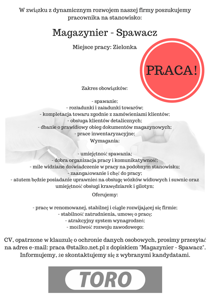 W związku z dynamicznym rozwojem naszej firmy poszukujemy pracownika na stanowisko: Magazynier - Spawacz Miejsce pracy: Zielonka PRACA! Zakres obowiązków: - spawanie; - rozładunki i załadunki towarów; - kompletacja towaru zgodnie z zamówieniami klientów; - obsługa klientów detalicznych; - dbanie o prawidłowy obieg dokumentów magazynowych; - prace inwentaryzacyjne; Wymagania: - umiejętność spawania; - dobra organizacja pracy i komunikatywność; - mile widziane doświadczenie w pracy na podobnym stanowisku; - zaangażowanie i chęć do pracy; - atutem będzie posiadanie uprawnień na obsługę wózków widłowych i suwnic oraz umiejętność obsługi krawędziarek i gilotyn; Oferujemy: - pracę w renomowanej, stabilnej i ciągle rozwijającej się firmie; - stabilność zatrudnienia, umowę o pracę; - atrakcyjny system wynagrodzeń; - możliwość rozwoju zawodowego; CV, opatrzone w klauzulę o ochronie danych osobowych, prosimy przesyłać na adres e-mail: praca @stalko.net.pl z dopiskiem "Magazynier - Spawacz". Informujemy, że skontaktujemy się z wybranymi kandydatami.