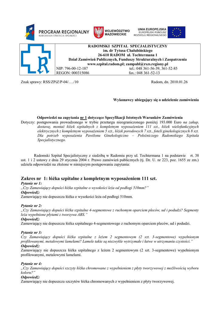 RADOMSKI SZPITAL SPECJALISTYCZNY im. dr Tytusa Chałubińskiego 26-610 RADOM ul. Tochtermana 1 Dział Zamówień Publicznych, Funduszy Strukturalnych i Zaopatrzenia www.szpital.radom.pl; [email protected] NIP: 796-00-12-187 tel.: 048 361-56-39, 361-52-85 REGON: 000315086 fax.: 048 361-52-13 Znak sprawy: RSS/ZPiZ/P-04/…./10 Radom, dn. 2010.01.26 Wykonawcy ubiegający się o udzielenie zamówienia Odpowiedzi na zapytania nr 1 dotyczące Specyfikacji Istotnych Warunków Zamówienia Dotyczy: postępowania prowadzonego w trybie przetargu nieograniczonego poniżej 193.000 Euro na zakup, dostawę, montaż łóżek szpitalnych z kompletnym wyposażeniem 111 szt., łóżek wielofunkcyjnych elektrycznych z kompletnym wyposażeniem 5 szt., łóżek porodowych 7 szt., foteli ginekologicznych 8 szt. Dla potrzeb wyposażenia Pawilonu Ginekologiczno – Położniczego Radomskiego Szpitala Specjalistycznego. Radomski Szpital Specjalistyczny z siedzibą w Radomiu przy ul. Tochtermana 1 na podstawie rt. 38 ust. 1 i 2 ustawy z dnia 29 stycznia 2004 r. Prawo zamówień publicznych (tj. Dz. U. nr 223, poz. 1655 ze zm.) udziela odpowiedzi na złożone w niniejszym postępowaniu zapytania: Zakres nr 1: łóżka szpitalne z kompletnym wyposażeniem 111 szt. Pytanie nr 1: „Czy Zamawiający dopuści łóżka szpitalne o wysokości leża od podłogi 510mm?” Odpowiedź: Zamawiający nie dopuszcza łóżka o wysokości leża od podłogi 510mm. Pytanie nr 2: „Czy Zamawiający dopuści łóżka szpitalne 4-segmentowe z ruchomym oparciem pleców, ud i podudzi? Segmenty leża wypełnione płytami z tworzywa ABS.” Odpowiedź: Zamawiający nie dopuszcza łóżka szpitalnego 4-segmentowego z ruchomym oparciem pleców, ud i podudzi. Pytanie nr 3: Czy Zamawiający dopuści łóżka szpitalne z leżem 2 segmentowym (2 szt. 3-segmentowe) wypełnionym profilowanymi, metalowymi lamelami? Lamele takie są niezwykle wytrzymałe i łatwe w utrzymaniu czystości.” Odpowiedź: Zamawiający nie dopuszcza łóżka szpitalnego z leżem 2 segmentowym (2 szt. 3-segmentowe) wypełnionym profilowanymi, metalowymi lamelami. Pytanie nr 4: „Czy Zamawiający dopuści szczyty łóżka chromowane z wypełnieniem z płyty tworzywowej z możliwością wyboru koloru?” Odpowiedź: Zamawiający nie dopuszcza szczytów łóżka chromowanych z wypełnieniem z płyty tworzywowej. Pytanie nr 5: „Czy Zamawiający dopuści obciążenie łóżka 175kg?” Odpowiedź: Zamawiający nie dopuszcza w/w obciążenia Pytanie nr 6: „Czy Zamawiający dopuści szczyty łóżka wyjmowane z ramy leża wykonane z rury chromowanej wypełnionej płytą tworzywową?” Odpowiedź: Zamawiający nie dopuszcza szczytów łóżka wykonanych z rury chromowanej wypełnionej płytą tworzywową. Pytanie nr 7: „Czy Zamawiający dopuści łóżko wypełnione metalową siatką malowaną farbą proszkową lub wypełnione płytą tworzywową – unilam?” Odpowiedź: Zamawiający nie dopuszcza łóżka wypełnionego metalową siatką malowaną farbą proszkową lub wypełnionego płytą tworzywową – unilam. Zakres nr 2: łóżka wielofunkcyjne elektryczne z kompletnym wyposażeniem 5 szt. Łóżko wersja I – 1 szt. Pytanie nr 1: „Czy Zamawiający dopuści obciążenie łóżka 300kg?” Odpowiedź: Zamawiający nie dopuszcza w/w obciążenia. Andrzej Pawluczyk ……………………………………… Dyrektor Radomskiego Szpitala Specjalistycznego Sporządziła: Anna Skwarczyńska