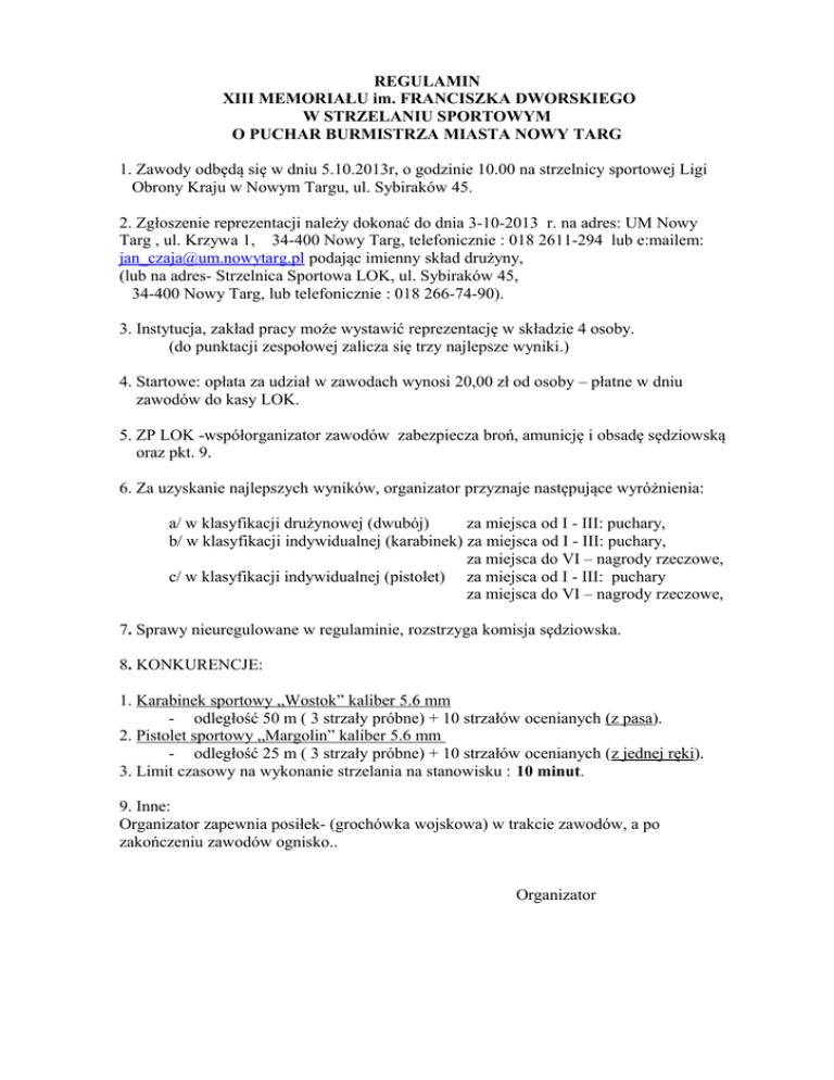 REGULAMIN XIII MEMORIAŁU im. FRANCISZKA DWORSKIEGO W STRZELANIU SPORTOWYM O PUCHAR BURMISTRZA MIASTA NOWY TARG 1. Zawody odbędą się w dniu 5.10.2013r, o godzinie 10.00 na strzelnicy sportowej Ligi Obrony Kraju w Nowym Targu, ul. Sybiraków 45. 2. Zgłoszenie reprezentacji należy dokonać do dnia 3-10-2013 r. na adres: UM Nowy Targ , ul. Krzywa 1, 34-400 Nowy Targ, telefonicznie : 018 2611-294 lub e:mailem: [email protected] podając imienny skład drużyny, (lub na adres- Strzelnica Sportowa LOK, ul. Sybiraków 45, 34-400 Nowy Targ, lub telefonicznie : 018 266-74-90). 3. Instytucja, zakład pracy może wystawić reprezentację w składzie 4 osoby. (do punktacji zespołowej zalicza się trzy najlepsze wyniki.) 4. Startowe: opłata za udział w zawodach wynosi 20,00 zł od osoby – płatne w dniu zawodów do kasy LOK. 5. ZP LOK -współorganizator zawodów zabezpiecza broń, amunicję i obsadę sędziowską oraz pkt. 9. 6. Za uzyskanie najlepszych wyników, organizator przyznaje następujące wyróżnienia: a/ w klasyfikacji drużynowej (dwubój) za miejsca od I - III: puchary, b/ w klasyfikacji indywidualnej (karabinek) za miejsca od I - III: puchary, za miejsca do VI – nagrody rzeczowe, c/ w klasyfikacji indywidualnej (pistolet) za miejsca od I - III: puchary za miejsca do VI – nagrody rzeczowe, 7. Sprawy nieuregulowane w regulaminie, rozstrzyga komisja sędziowska. 8. KONKURENCJE: 1. Karabinek sportowy „Wostok” kaliber 5.6 mm - odległość 50 m ( 3 strzały próbne) + 10 strzałów ocenianych (z pasa). 2. Pistolet sportowy „Margolin” kaliber 5.6 mm - odległość 25 m ( 3 strzały próbne) + 10 strzałów ocenianych (z jednej ręki). 3. Limit czasowy na wykonanie strzelania na stanowisku : 10 minut. 9. Inne: Organizator zapewnia posiłek- (grochówka wojskowa) w trakcie zawodów, a po zakończeniu zawodów ognisko.. Organizator