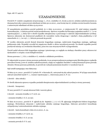 Sygn. akt I C 440/12 UZASADNIENIE Powód D. P. wniósł o zasądzenie od pozwanego (...) S.A. z siedziba w Ł. kwoty 3.000 zł., tytułem zadośćuczynienia za doznaną krzywdę z ustawowymi odsetkami od dnia 30.12.2011r., oraz kwotę 640 zł., tytułem zwrotu kosztów leczenia z ustawowymi odsetkami od dnia 23.03.2012r. W uzasadnieniu powództwa powód podniósł, że w dniu 15.10.2011r., w miejscowości W. miał miejsce wypadek komunikacyjny , w którym powód został poszkodowany. Sprawca wypadku był kierujący pojazdem marki V. (...) o nr rejestracyjnym (...), który był w chwili wypadku ubezpieczony u pozwanego w zakresie odpowiedzialności cywilnej. Sprawca zdarzenia nie dostosował prędkości do warunków ruchu drogowego i wjechał z dużą prędkością w tył samochodu A. (...) nr rej (...) , którym poruszał się powód. W wyniku zdarzenia powód doznał skręcenia kręgosłupa szyjnego, naderwania kręgosłupa szyjnego, ogólnego potłuczenia ciała. Wypadek wywołał też negatywne skutki w sferze zawodowej powoda. Na skutek wypadku powód przebywał miesiąc na zwolnieniu lekarskim, przez ten czas otrzymywał 80% wynagrodzenia. Powód nadal odczuwa bóle kręgosłupa szyjnego i piersiowego, ze względu na siedzący charakter pracy odczuwa też dyskomfort w związku z tymi dolegliwościami. Strona pozwana (...) S.A. z siedziba w Ł. wniosła o oddalenie powództwa. W odpowiedzi na pozew strona pozwana podniosła, że po przeprowadzonym postępowaniu likwidacyjnym wypłaciła powodowi kwotę 3.000 zł. tytułem zadośćuczynienia, mając na względzie charakter i rodzaj doznanych przez powoda obrażeń. Strona pozwana podniosła, że powód nie wykazał poniesienia kosztów w wysokości 640 zł. Sąd ustalił następujący stan faktyczny: W dniu 15.10,.2011r., powód D. P. jechał z W. w kierunku H.; zatrzymał się aby zabrać pasażera. W tył jego samochodu uderzył samochód marki V. (...) numer rejestracyjny (...) kierowany przez A. P. (1). ( dowód: - akta szkody). W chwili zdarzenia sprawca wypadku posiadał ubezpieczenia odpowiedzialności cywilnej u strony pozwanej. ( dowód: - bezsporne). W nocy powód D. P. zaczął odczuwać bóle i zawroty głowy. ( dowód: - zeznania świadka A. P. (2) k. 91; - zeznania świadka J. G. k. 91-92). W dniu 16.10.2011r., powód D. P. zgłosił się do Szpitala (...). A. w Z. Śl. zgłaszając dolegliwości bólowe kręgosłupa szyjnego. Stwierdzono skręcenie i naderwanie odcinka szyjnego kręgosłupa. Zalecono powodowi konsultację ortopedyczną i unieruchomienie odcinka szyjnego. ( dowód: - karta konsultacji z dnia 16.10.2011r., k. 15;. - zeznania świadka A. P. (2) k. 91; - zeznania świadka J. G. k. 91-92; - zeznania powoda D. P. k. 92). W dniu 17.10.2011r., powód D. P. zgłosił się do lekarza rodzinnego w H.. Stwierdzono wówczas ograniczenie ruchomości i tkliwość przy palpacji kręgosłupa szyjnego, bez zaburzeń czucia Zalecono wówczas powodowi dalsze noszenie kołnierza ortopedycznego i konsultację ortopedyczną. ( dowód: - dokumentacja medyczna k. 16; - zeznania świadka A. P. (2) k. 91; - zeznania powoda D. P. k. 92). W dniu 22.10.2011r. powód D. P. zgłosił się na prywatna wizytę do lekarza ortopedy. Lekarz ortopeda zalecił noszenie kołnierza ortopedycznego przez okres 3 tygodni a następnie wykonanie zdjęcia rtg kręgosłupa szyjnego. Zalecił też stosowanie R. i S.. ( dowód: - zaświadczenie lekarskie k. 17; - zeznania powoda D. P. k. 92). W dniu 4.11.2014r., powód D. P. zgłosił się do innego ortopedy; stwierdził on parestezję kończyny górnej lewej i zalecił konsultację neurologiczną. ( dowód:- zaświadczenie lekarskie k. 18; - zeznania powoda D. P. k. 92). W dniu 12.11.2011r., powód D. P. zgłosił się do lekarza neurologa; zgłaszał bóle i zawroty głowy oraz drętwienie rąk. Neurolog zalecił dalsze leczenie farmakologiczne. ( dowód: - zaświadczenie lekarskie k. 19-20;. - zeznania powoda D. P. k. 92). Powód D. P. uczęszczał na zabiegi rehabilitacyjne w okresie od 5.01.2012r., do 19.01.2012r. . ( dowód: - zaświadczenie z dnia 19.01.2012r., k,. 22; - zeznania powoda D. P. k. 92). Powód przez okres 3 tygodni nosił kołnierz ortopedyczny, brał też leki przeciwbólowe. ( dowód: - zaświadczenie lekarskie k. 23; - zeznania powoda D. P. k. 92). Strona pozwana wypłaciła powodowi kwotę 4.000 zł., tytułem odszkodowania i 347,60 zł., tytułem odszkodowania. ( dowód: - decyzja strony pozwanej z dnia 9.12.2011r., k. 27). W wyniku wypadku w dniu 15.10.2011r., u powoda D. P. nastąpiło skręcenie kręgosłupa szyjnego. Spowodowało to długotrwały uszczerbek na zdrowiu w wysokości 3%. Stan powoda po wypadku poprawił się, pozostały nieznaczne ograniczenia w zakresie ruchomości kręgosłupa szyjnego . Powód nie wymaga dalszej opieki lekarskiej , leczenia ani rehabilitacji. ( dowód: - opinia biegłego S. L. z dnia 4.06.2013r., k. 108- 111). U powoda D. P. w zakresie neurologicznym nie stwierdzono odchyleń od stanu prawidłowego , objawy korzeniowe są ujemne , nieruchomość w kończynach górnych i dolnych zachowana jest w pełnym zakresie, odruchy głębokie są symetryczne, chód wydolny. Z przyczyn neurologicznych u powoda nie stwierdzono istnienia uszczerbku na zdrowiu związanego z wypadkiem. ( dowód: - opinia biegłego H. M. z dnia 30.09.2013r., k. 125- 126). Powód D. P. przebywał na zwolnieniu lekarskim w okresie: - od 17.10.2011r do 26.10. (...). - od 27.10.2011 do 5.11.2011r. ; - od 6.11.2011r. do 18.11.2011r; ( dowód: - zwolnienia lekarskie k. 77- 78). Powód D. P. poniósł koszty leczenia związane z wykonaniem zdjęć rtg kręgosłupa, leków, wizyt lekarskich i rehabilitacji. ( dowód: - faktura VAT nr (...) k. 78; - faktura VAT nr(...) k. 79; - faktura VAT nr (...)/2011k. 80; - rachunek numer (...) k. 80; - rachunek numer (...) k. 80; - rachunek numer (...) k. 64; - rachunek numer (...) k. 64). Strona pozwana po przeprowadzeniu postępowania likwida