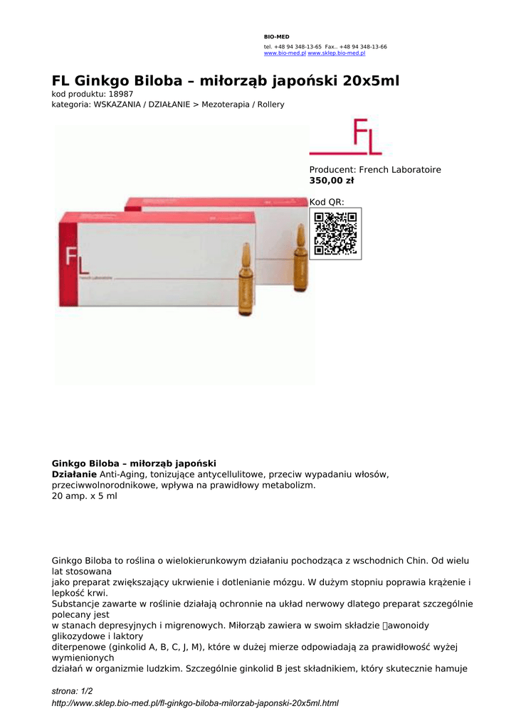 BIO-MED tel. +48 94 348-13-65 Fax.. +48 94 348-13-66 www.bio-med.pl www.sklep.bio-med.pl FL Ginkgo Biloba – miłorząb japoński 20x5ml kod produktu: 18987 kategoria: WSKAZANIA / DZIAŁANIE > Mezoterapia / Rollery Producent: French Laboratoire 350,00 zł Kod QR: Ginkgo Biloba – miłorząb japoński Działanie Anti-Aging, tonizujące antycellulitowe, przeciw wypadaniu włosów, przeciwwolnorodnikowe, wpływa na prawidłowy metabolizm. 20 amp. x 5 ml Ginkgo Biloba to roślina o wielokierunkowym działaniu pochodząca z wschodnich Chin. Od wielu lat stosowana jako preparat zwiększający ukrwienie i dotlenianie mózgu. W dużym stopniu poprawia krążenie i lepkość krwi. Substancje zawarte w roślinie działają ochronnie na układ nerwowy dlatego preparat szczególnie polecany jest w stanach depresyjnych i migrenowych. Miłorząb zawiera w swoim składzie awonoidy glikozydowe i laktory diterpenowe (ginkolid A, B, C, J, M), które w dużej mierze odpowiadają za prawidłowość wyżej wymienionych działań w organizmie ludzkim. Szczególnie ginkolid B jest składnikiem, który skutecznie hamuje strona: 1/2 http://www.sklep.bio-med.pl/fl-ginkgo-biloba-milorzab-japonski-20x5ml.html działanie czynnika aktywującego płytki (PAF), biorącego udział w większości reakcji zapalnych i alergicznych. Potwierdzono badaniami naukowymi, że Gingko Biloba reguluje wydzielanie niektórych hormonów mających duży wpływ na prawidłowy metabolizm. Zmniejsza przepuszczalność i kurczliwość naczyń. Posiada właściwości przeciwwolnorodnikowe (ogranicza przewlekłe zapalenia). Zmniejsza powstawanie obrzęków. Wzmacnia odporność i szczelność kapilar. Wyciąg z nostrzyka i rutyny znajduje zastosowanie w elektromezoterapii cellulitu w celu usprawnienia mikrokrążenia i odpływu limfy. Wskazania: - cellulit naczyniowy - wypadanie włosów - Anti-Aging strona: 2/2 http://www.sklep.bio-med.pl/fl-ginkgo-biloba-milorzab-japonski-20x5ml.html