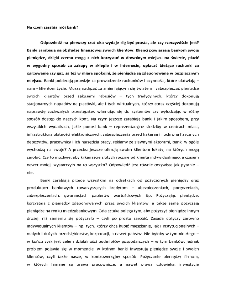Na czym zarabia mój bank? Odpowiedź na pierwszy rzut oka wydaje się być prosta, ale czy rzeczywiście jest? Banki zarabiają na obsłudze finansowej swoich klientów. Klienci powierzają bankom swoje pieniądze, dzięki czemu mogą z nich korzystać w dowolnym miejscu na świecie, płacić w wygodny sposób za zakupy w sklepie i w Internecie, opłacać bieżące rachunki za ogrzewanie czy gaz, są też w miarę spokojni, że pieniądze są zdeponowane w bezpiecznym miejscu. Banki pobierają prowizje za prowadzenie rachunków i czynności, które ułatwiają – nam - klientom życie. Muszą nadążać za zmieniającym się światem i zabezpieczać pieniądze swoich klientów przed zakusami rabusiów – tych tradycyjnych, którzy dokonują stacjonarnych napadów na placówki, ale i tych wirtualnych, którzy coraz częściej dokonują naprawdę zuchwałych przestępstw, włamując się do systemów czy wyłudzając w różny sposób dostęp do naszych kont. Na czym jeszcze zarabiają banki i jakim sposobem, przy wszystkich wydatkach, jakie ponosi bank – reprezentacyjne siedziby w centrach miast, infrastruktura płatności elektronicznych, zabezpieczenia przed hakerami i ochrona fizycznych depozytów, pracownicy i ich narzędzia pracy, reklamy ze sławnymi aktorami, banki w ogóle wychodzą na swoje? A przecież jeszcze oferują swoim klientom lokaty, na których mogą zarobić. Czy to możliwe, aby kilkanaście złotych rocznie od klienta indywidualnego, a czasem nawet mniej, wystarczyło na to wszystko? Odpowiedź jest równie oczywista jak pytanie – nie. Banki zarabiają przede wszystkim na odsetkach od pożyczonych pieniędzy oraz produktach bankowych towarzyszących kredytom – ubezpieczeniach, poręczeniach, zabezpieczeniach, gwarancjach papierów wartościowych itp. Pożyczając pieniądze, korzystają z pieniędzy zdeponowanych przez swoich klientów, a także same pożyczają pieniądze na rynku międzybankowym. Cała sztuka polega tym, aby pożyczyć pieniądze innym drożej, niż samemu się pożyczyło – czyli po prostu zarobić. Zasada dotyczy zarówno indywidualnych klientów – np. tych, którzy chcą kupić mieszkanie, jak i instytucjonalnych – małych i dużych przedsiębiorstw, korporacji, a nawet państw. Nie byłoby w tym nic złego – w końcu zysk jest celem działalności podmiotów gospodarczych – w tym banków, jednak problem pojawia się w momencie, w którym banki inwestują pieniądze swoje i swoich klientów, czyli także nasze, w kontrowersyjny sposób. Pożyczanie pieniędzy firmom, w których łamane są prawa pracownicze, a nawet prawa człowieka, inwestycje w spekulacyjny zakup ziemi, możliwy wyłącznie przez działania korupcyjne, przedsięwzięcia zagrażające środowisku naturalnemu lub wręcz z góry zakładające dewastację środowiska na rzecz większego zysku dla inwestora, wreszcie wsparcie produkcji broni nuklearnej i pocisków kasetowych – to inwestycje, które wiele banków, z którymi mamy na co dzień do czynienia finansuje, jednak informacji tej nie przekazuje do publicznej wiadomości. Informacje te docierają do opinii publicznej za sprawą organizacji pozarządowych i instytucji działających na rzecz ochrony praw człowieka. Publikowane przez organizacje strażnicze raporty, przedstawiające niechlubną działalność firm i instytucji finansowych pokazują rzeczywistość w trochę innym świetle, niż raporty tychże firm. Rzetelne zebranie informacji, dowodów w sprawie i przedstawienie ich opinii publicznej jest zadaniem niezwykle niebezpiecznym zarówno dla badaczy, jak i społeczności, których sprawa dotyczy. Dodatkową trudnością w zebraniu materiałów dowodowych jest fakt, że kontrowersyjne inwestycje prowadzone są w odległych krajach – głównie Azji, Afryki i Ameryki Południowej, których system prawny i ustrój polityczny nie są w stanie zagwarantować ochrony praw ludzi i poszanowania środowiska - stąd inwestorzy i korporacje działają praktycznie bezkarnie. Na szczęście coraz więcej jest organizacji, dzięki którym fakty mogą ujrzeć światło dzienne, a my konsumenci, możemy sami wysnuć z nich wnioski. Czy chcę, aby bank, któremu powierzam moje pieniądze wspierał inwestycje firm zbrojeniowych lub tych, które są odpowiedzialne za skażenie jedynego źródła wody pitnej w afrykańskiej wiosce? Czy jest mi obojętne, że firma, której ubrania kupuję, wspierana przez mój bank wykorzystuje do pracy dzieci, a pracownikom płaci głodowe pensje, robiąc z nich niewolników XXI w.? Czy w końcu chcę zarabiać na lokacie, której oprocentowanie związane jest z wykarczowaniem i wypaleniem lasów puszczy pierwotnej pod uprawę palmy olejowej, aby firmy produkujące olej palmowy, stosowany powszechnie w przemyśle spożywczym mogły się rozwijać, generując zyski banków? We współczesnym, zglobalizowanym świecie coraz mniej jest prostych odpowiedzi, tym bardziej rozwiązań. Nie możemy być obojętni na krzywdę innych ludzi i degradację środowiska planety, na której żyjemy. Bądźmy czujni i świadomi, bo jako obywatele Unii Europejskiej, konsumenci i klienci mamy realny wpływ na kształt otaczającego nas świata. [AJ] Jeśli zainteresował Cię temat więcej informacji znajdziesz tu: publikacje w języku angielskim: http://www.foei.org/wp-content/uploads/2015/10/Financialization-of-Nature-brochureEnglish.pdf http://www.foei.org/news/deutsche-bank-divests-from-bumitama http://www.foei.org/wp-content/uploads/2014/03/Wilmar-International-and-itsFinanciers.pdf publikacje w języku polskim: http://www.centrumcsr.pl/wp-content/uploads/2013/10/Raport_Brudny-Zysk.pdf http://www.centrumcsr.pl/wpcontent/uploads/2013/12/Tanie_komputery_na_koszt_pracownikow_fabryk_sektora_IT_w_ Chinach.pdf Kampania „Finansowanie zrównoważonej przyszłości” Financing sustainable future jest dofinansowana ze środków Unii Europejskiej. Za treść artykułu odpowiedzialny jest Polski Klub 
