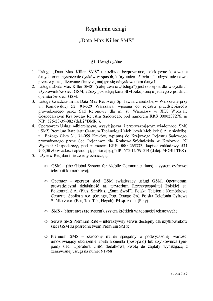 Regulamin usługi „Data Max Killer SMS” §1. Uwagi ogólne 1. Usługa „Data Max Killer SMS” umożliwia bezpowrotne, selektywne kasowanie danych oraz czyszczenie dysków w sposób, który uniemożliwia ich odzyskanie nawet przez wyspecjalizowane firmy zajmujące się odzyskiwaniem danych. 2. Usługa „Data Max Killer SMS” (dalej zwana „Usługa”) jest dostępna dla wszystkich użytkowników sieci GSM, którzy posiadają kartę SIM zakupioną u jednego z polskich operatorów sieci GSM. 3. Usługę świadczy firma Data Max Recovery Sp. Jawna z siedzibą w Warszawie przy ul. Kaniowskiej 52, 01-529 Warszawa, wpisana do rejestru przedsiębiorców prowadzonego przez Sąd Rejonowy dla m. st. Warszawy w XIX Wydziale Gospodarczym Krajowego Rejestru Sądowego, pod numerem KRS 0000239276, nr NIP: 525-23-39-982 (dalej "DMR"). 4. Operatorem Usługi odbierającym, wysyłającym i przetwarzającym wiadomości SMS i SMS Premium Rate jest: Centrum Technologii Mobilnych Mobiltek S.A. z siedzibą: ul. Bożego Ciała 31, 31-059 Kraków, wpisaną do Krajowego Rejestru Sądowego, prowadzonego przez Sąd Rejonowy dla Krakowa-Śródmieścia w Krakowie, XI Wydział Gospodarczy, pod numerem KRS: 0000265333, kapitał zakładowy 531 900,00 zł (w całości opłacony), posiadającą NIP: 675-12-79-514 (dalej: MOBILTEK) 5. Użyte w Regulaminie zwroty oznaczają: • GSM – (the Global System for Mobile Communications) – system cyfrowej telefonii komórkowej; • Operator – operator sieci GSM świadczący usługi GSM; Operatorami prowadzącymi działalność na terytorium Rzeczypospolitej Polskiej są: Polkomtel S.A. (Plus, SimPlus, „Sami Swoi”), Polska Telefonia Komórkowa Centertel Spółka z o.o. (Orange, Pop, Orange Go), Polska Telefonia Cyfrowa Spółka z o.o. (Era, Tak-Tak, Heyah), P4 sp. z o.o. (Play); • SMS - (short message system), system krótkich wiadomości tekstowych; • Serwis SMS Premium Rate – interaktywny serwis dostępny dla użytkowników sieci GSM za pośrednictwem Premium SMS; • Premium SMS – skrócony numer specjalny o podwyższonej wartości umożliwiający obciążenie konta abonenta (post-paid) lub użytkownika (prepaid) sieci Operatora GSM dodatkową kwotą do zapłaty wynikającą z zamawianej usługi na numer 91968 Strona 1 z 3 6. Każda osoba (dalej „Użytkownik”), która przystępuje do korzystania z Usługi i wysyła wiadomość SMS Premium na numer Premium SMS „91968” przyjmuje do wiadomości i akceptuje warunki niniejszego regulaminu. §2. Korzystanie z Usługi 1. Usługa dostępna jest na komputerach klasy PC z zainstalowanym jednym z systemów operacyjnych Microsoft®: Windows 2000, Windows XP, Windows Serwer 2003, Windows Vista oraz z aktywnym dostępem do sieci globalnej Internet. 2. Aby aktywować Usługę Data Max Killer SMS za pośrednictwem Premium SMS, należy wysłać na wskazany Premium SMS wiadomość o treści zamówienia podanej w opisie produktu. 3. Koszt wysłania jednej wiadomości Premium SMS na numer „91968” to 19 pln netto (23,18 (lub 23,37zł od 1 stycznia 2011) z VAT); 4. Opłaty za korzystanie z Usługi pobierane są przez Operatorów Sieci GSM. 5. Wiadomość Premium SMS może być wysłana wyłącznie z telefonu komórkowego. 6. W odpowiedzi na zamówienie Użytkownik otrzyma wiadomość SMS : a) zawierającą kod aktywacyjny umożliwiający skorzystanie z Usługi oraz informację o czasie trwania aktywacji b) informację o pomyślnej aktywacji usługi. 7. W przypadku wysłania Premium SMS o błędnej treści, Użytkownik otrzyma od MOBILTEK komunikat SMS z informacją o błędzie. 8. Wiadomość SMS bez treści lub zawierająca treść niewłaściwą, nie upoważnia do skorzystania z usługi, jednakże każde wysłanie wiadomości SMS wiąże się z naliczeniem opłaty, o której mowa w pkt 3, §2 niniejszego regulaminu. 9. Wiadomość Premium SMS na numer „91968” może być wysyłana przez jednego abonenta nie częściej niż raz na 15 minut. Wysłanie kolejnego Premium SMS w czasie krótszym niż 15 minut nie spowoduje wygenerowania kodu zwrotnego. 10. Użytkownikom przysługuje prawo do wykorzystania otrzymanego Serwisu Data Max Killer SMS tylko w zakresie użytku osobistego. §3. Odpowiedzialność 1. DMR oświadcza, że dołoży należytej staranności, aby Usługa świadczona była na jak najwyższym poziomie. 2. DMR nie ponosi odpowiedzialności za problemy w funkcjonowaniu Usługi związane z jakością usług świadczonych bezpośrednio przez Operatora sieci GSM oraz niedostępnością wiadomości w sieci odbiorcy. 3. DMR nie ponosi odpowiedzialności za brak możliwości skorzystania z Usługi będącej wynikiem utraty danych lub opóźnienia w otrzymaniu lub przesłaniu SMS oraz SMS Premium Rate spowodowane brakiem transmisji, nieprawidłową transmisją, opóźnieniami lub przerwami w świadczeniu usług niezależnymi od DMR, w szczególności wynikłymi z powodu siły wyższej, np.: wybuchu wojny, huraganu, pożaru, powodzi, trzęsienia ziemi, strajku, działań lub zaniechań instytucji rządowych, zmian prawa, awarii ogólnopolskiej sieci Internet lub jej części, awarii sieci energetycznej, przyczyn leżących po stronie Operatorów GSM i innych okoliczności Strona 2 z 3 lub zdarzeń pozostających poza kontrolą DMR, a uniemożliwiających prawidłowe funkcjonowanie Usługi. 4. Niezależnie od powyższych ustaleń DMR ma prawo zaprzestać świadczenia Usługi w każdym czasie, jeżeli takie uzasadnione żądanie zostanie zgłoszone wobec niego przez Operatora. Z zastrzeżeniem odpowiednich przepisów prawa oraz niniejszego regulaminu, DMR nie odpowiada za szkody spowodowane wadliwym działaniem systemu transmisji, w tym awariami sprzętu, opóźnieniami i zakłóceniami przesyłu informacji. §4. Postanowienia końcowe 1. Wszelkie spory związane z wykonaniem niniejszego regulaminu będą rozstrzygane przez właściwe sądy powszechne. 2. DMR zachowuje prawo do zmiany treści niniejszego regulam