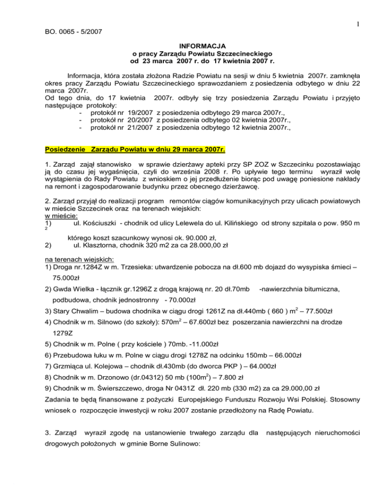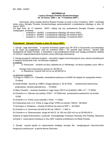 1 BO. 0065 - 5/2007 INFORMACJA o pracy Zarządu Powiatu Szczecineckiego od 23 marca 2007 r. do 17 kwietnia 2007 r. Informacja, która została złożona Radzie Powiatu na sesji w dniu 5 kwietnia 2007r. zamknęła okres pracy Zarządu Powiatu Szczecineckiego sprawozdaniem z posiedzenia odbytego w dniu 22 marca 2007r. Od tego dnia, do 17 kwietnia 2007r. odbyły się trzy posiedzenia Zarządu Powiatu i przyjęto następujące protokoły: - protokół nr 19/2007 z posiedzenia odbytego 29 marca 2007r., - protokół nr 20/2007 z posiedzenia odbytego 02 kwietnia 2007r., - protokół nr 21/2007 z posiedzenia odbytego 12 kwietnia 2007r., Posiedzenie Zarządu Powiatu w dniu 29 marca 2007r. 1. Zarząd zajął stanowisko w sprawie dzierżawy apteki przy SP ZOZ w Szczecinku pozostawiając ją do czasu jej wygaśnięcia, czyli do września 2008 r. Po upływie tego terminu wyraził wolę wystąpienia do Rady Powiatu z wnioskiem o jej przedłużenie biorąc pod uwagę poniesione nakłady na remont i zagospodarowanie budynku przez obecnego dzierżawcę. 2. Zarząd przyjął do realizacji program remontów ciągów komunikacyjnych przy ulicach powiatowych w mieście Szczecinek oraz na terenach wiejskich: w mieście: 1) ul. Kościuszki - chodnik od ulicy Lelewela do ul. Kilińskiego od strony szpitala o pow. 950 m 2 2) którego koszt szacunkowy wynosi ok. 90.000 zł, ul. Klasztorna, chodnik 320 m2 za ca 28.000,00 zł na terenach wiejskich: 1) Droga nr.1284Z w m. Trzesieka: utwardzenie pobocza na dł.600 mb dojazd do wysypiska śmieci – 75.000zł 2) Gwda Wielka - łącznik gr.1296Z z drogą krajową nr. 20 dł.70mb -nawierzchnia bitumiczna, podbudowa, chodnik jednostronny - 70.000zł 3) Stary Chwalim – budowa chodnika w ciągu drogi 1261Z na dł.440mb ( 660 ) m2 – 77.500zł 4) Chodnik w m. Silnowo (do szkoły): 570m2 – 67.600zł bez poszerzania nawierzchni na drodze 1279Z 5) Chodnik w m. Polne ( przy kościele ) 70mb. -11.000zł 6) Przebudowa łuku w m. Polne w ciągu drogi 1278Z na odcinku 150mb – 66.000zł 7) Grzmiąca ul. Kolejowa – chodnik dł.430mb (do dworca PKP ) – 64.000zł 8) Chodnik w m. Drzonowo (dr.04312) 50 mb (100m2) – 7.800 zł 9) Chodnik w m. Świerszczewo, droga Nr 0431Z dł. 220 mb (330 m2) za ca 29.000,00 zł Zadania te będą finansowane z pożyczki Europejskiego Funduszu Rozwoju Wsi Polskiej. Stosowny wniosek o rozpoczęcie inwestycji w roku 2007 zostanie przedłożony na Radę Powiatu. 3. Zarząd wyraził zgodę na ustanowienie trwałego zarządu dla drogowych położonych w gminie Borne Sulinowo: następujących nieruchomości 2 - działki oznaczone nr 81/1, 82/1, 96/1 i 98/1 o łącznej pow. 0,1913 ha wchodzącej w skład drogi powiatowej nr 1280Z (17642) położonej w obrębie ewidencyjnym Uniemino, - działki oznaczonej nr 28 o pow. 0,4163 ha wchodzącej w skład drogi powiatowej nr 17663 (obecnie nr 1298Z) położonej w obrębie ewidencyjnym 5 miasto Borne Sulinowo i Biały Bór - działki oznaczonej nr 5 o pow. 0,9060 ha w obrębie 5 miasto Biały Bór na rzecz Powiatowego Zarządu Dróg. 4. Zarząd podjął decyzje o dofinansowaniu w kwocie 9.180 zł dla Stowarzyszenia „Atut” prowadzącego warsztaty terapii zajęciowej w Szczecinku w związku ze zmianą przepisów, na podstawie których w roku 2007 wymagany jest udział finansowy budżetu powiatu w wysokości 5% kosztów działalności, zaś w kolejnych latach będzie rósł progresywnie (10%, 15%). Działalność WTZ będzie również współfinansowana przez Miasto Szczecinek w wysokości 12.000 zł. 5. Zarząd zatwierdził wybór wykonawcy przetargu na udzielenie kredytu w wysokości 1.000.000 zł, w którym oferty zgłosiły cztery banki, a najkorzystniejszą ofertę złożył Bank Spółdzielczy w Darłowie. 6. Zarząd zapoznał się ze stanowiskami w sprawie zwolnienia dr Michała Tabiszewskiego z SP ZOZ • wystosowanymi przez: Specjalistę Wojewódzkiego ds. Ortopedii i Traumatologii Narządu Ruchu Województwa Zachodniopomorskiego Prof. dr hab. Andrzeja Gusta Katedry i Kliniki Ortopedii i Traumatologii PAM w Szczecinie, • mieszkańców (list otwarty z załączonymi podpisami 3.509 osób), • środowisko lekarzy ze szczecineckiego szpitala, • Oddział Powiatowy Stronnictwa „Liga Polskich Rodzin” w Szczecinku, 7. Zarząd Powiatu podjął uchwały w sprawach: 1) dokonania zmian w planie dochodów i wydatków budżetu Powiatu Szczecineckiego na rok 2007 o kwotę 26.275 zł z tytułu zwiększenia dotacji celowych z przeznaczeniem na: – uregulowanie odszkodowania oraz zwrot kosztów sądowych w postępowaniu dot. unieważnienia wadliwie zawartych aktów notarialnych - 11.275 zł, - realizacje programów korekcyjno-edukacyjnychy dla osób stosujących przemoc w rodzinie – 15.000 zł; 2) powołania Kapituły konkursu „Mocarz Gospodarczy Powiatu Szczecineckiego” w osobach: Lis Krzysztof Pawlewicz Leszek Stakuć Piotr Bodnar Jan Chrzanowska Dorota 3 Piotrkowski Jacek Wrzeszcz Tomasz Rakuz Anna Oleś Katarzyna 3) wszczęcia postępowania o udzielenie zamówienia publicznego na zakup sprzętu komputerowego z oprogramowaniem zaplanowanego na rok 2007 – I etap w trybie zapytania o cenę oraz powołał skład osobowy komisji przetargowej, 4) wszczęcia postępowania o udzielenie zamówienia publicznego na wykonanie dostosowania lokalnego układu wysokości dla miasta Barwice do układu „Kronsztad” oraz dostosowanie dokumentacji technicznej i transformacja numerycznej mapy zasadniczej o pełnej treści prowadzonej przez Powiatowy Ośrodek Dokumentacji Geodezyjnej i Kartograficznej w Szczecinku do układu współrzędnych „2000” oraz powołał skład osobowy komisji przetargowej, 8. Zaakceptowano projekt uchwały Rady Powiatu w sprawie zatwierdzenia zmiany do Statutu Samodzielnego Publicznego Zakładu Opieki Zdrowotnej w Szczecinku. Procedura uchwalania zmian w statucie SP ZOZ daje uprawnienia w tym zakresie Radzie Społecznej przy SP ZOZ, a Radzie Powiatu tylko ich zatwierdzenie bądź odm