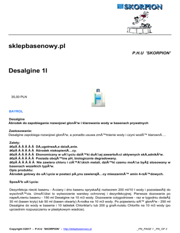 sklepbasenowy.pl P.H.U 'SKORPION' Desalgine 1l 35,00 PLN BAYROL Desalgine Åšrodek do zapobiegania rozwojowi glonów i klarowania wody w basenach prywatnych Zastosowanie: Desalgine zapobiega rozwojowi glonów, a ponadto usuwa zmÄ™tnienie wody i czyni wodÄ™ klarownÄ…. Zalety: •      DÅ‚ugotrwaÅ‚e dziaÅ‚anie. •      Środek niskopieniÄ…cy. •      Ekonomiczny w użyciu dziÄ™ki dużej zawartoÅ›ci aktywnych skÅ‚adników. •      Posiada obojÄ™tne pH, biologicznie degradowany. •      Nie zawiera chloru i ciężkich metali, dziÄ™ki czemu może być stosowany w basenach wszelkich typów. Opis produktu: Åšrodek gotowy do użycia w postaci pÅ‚ynu zawierajÄ…cy mieszaninÄ™ amin 4-rzÄ™dowych. Sposób użycia: Dezynfekcja niecki basenu - Å›ciany i dno basenu spryskać roztworem 200 ml/10 I wody i pozostawić do wyschniÄ™cia. Umożliwi to wytworzenie warstwy ochronnej i dezynfekcyjnej. Pierwsze dozowanie po napeÅ‚nieniu basenu - 150 ml Desalgine na 10 m3 wody. Dozowanie cotygodniowe - raz w tygodniu dodać 30 ml (basen kryty) lub 50 ml (basen otwarty) Å›rodka na 10 m3 wody. Po pojawieniu siÄ™ glonów - 250 ml Desalgine do wody w basenie i 10 tabletek Chloriklar'u lub 200 g graÂ-nulatu Chlorifix na 10 m3 wody (po uprzednim rozpuszczeniu w plastykowym wiadrze). Copyright ©2017 - P.H.U 'SKORPION' - http://sklepbasenowy.pl _PN_PAGE 1 _PN_OF 2 Ważne wskazówki: W celu lepszego wymieszania Desalgine należy dozować w pobliżu dysz dopÅ‚ywowych. Przy intensywnej eksploatacji basenu, po burzach, przy wysokich temperaturach oraz przy Å›liskich osadach w basenie należy Å›rodek dozować częściej lub w wiÄ™kszych iloÅ›ciach, aż do podwojenia normalnej dawki. Stosowanie Å›rodka w zarybionych zbiornikach należy skonsultować z producentem. Nie należy stosować Desalgine przy uzdatÂ-nianiu wody za pomocÄ… aktywnego tlenu.  Produkt posiada atest PZH nr W/331/93. Informacja o dostawcy Copyright ©2017 - P.H.U 'SKORPION' - http://sklepbasenowy.pl _PN_PAGE 2 _PN_OF 2