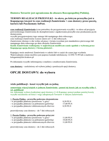 Dostawa Towarów jest ograniczona do obszaru Rzeczpospolitej Polskiej. TERMIN REALIZACJI PRZESYŁKI - to okres, po którym przesyłka jest u Kupującego tzn.jest to czas realizacji Zamówienia + czas dostawy przez pocztę, kuriera lub Paczkomaty InPost. czas realizacji Zamówienia (czas potrzebny do przygotowania wysyłki) - to okres od przyjęcia potwierdzonego Zamówienia do skompletowania i zapakowania przesyłki oraz przekazania jej do dostarczenia; wysyłki przygotowujemy tego samego lub następnego dnia roboczego; czas realizacji Zamówienia wynosi zatem od 1-2 dni roboczych. Zamówienie złożone w dni wolne od pracy i święta wysyłane jest standardowo pierwszego lub następnego dnia roboczego po dniu złożenia Zamówienia. Każde Zamówienie realizujemy w najkrótszym możliwym czasie zgodnie z wybraną przez Kupującego opcją dostawy i formą płatności . Kupujący może anulować Zamówienie w całości lub w części do czasu jego wysłania. Wprowadzanie zmian możliwe jest poprzez kontakt telefoniczny 12/294-73-99 lub e-mailowo: [email protected] Po dokonaniu wysyłki informujemy e-mailem o zrealizowaniu Zamówienia. czas dostawy - uzależniony od wyboru jednej z poniższych opcji dostawy. OPCJE DOSTAWY: do wyboru wiele publikacji - koszt wysyłki jak za jedną zamawiając więcej książek w jednym Zamówieniu - ponosi się koszty jak za wysyłkę tylko 1 szt. publikacji tzn. dokonując wyboru konkretnej opcji dostawy (1-4) Kupujący ponosi podane poniżej koszty wysyłki niezależnie od ilości i wagi zakupionych Towarów w danym Zamówieniu 1. Poczta Polska - przesyłka polecona ekonomiczna - w przypadku płatności przelewem "z góry" - w przypadku płatności za pobraniem (gotówką) - w przypadku płatności elektronicznych eService 8,50 PLN 17,00 PLN 8,50 PLN przewidywany czas dostawy - do 7 dni roboczych 2. Poczta Polska - przesyłka polecona priorytet - w przypadku płatności przelewem "z góry" - w przypadku płatności za pobraniem (gotówką) - w przypadku płatności elektronicznych eService przewidywany czas dostawy - do 2 dni roboczych 11,00 PLN 19,00 PLN 11,00 PLN 3. firma kurierska PATRON SERVICE / DHL - w przypadku płatności przelewem "z góry" - w przypadku płatności za pobraniem (gotówką) - w przypadku płatności elektronicznych eService 16,00 PLN 21,00 PLN 16,00 PLN przewidywany czas dostawy - do 2 dni roboczych Podany koszt dostawy dotyczy standardowych dostarczeń w godzinach od 8.00 do 20.00 w zależności od obsługiwanego rejonu Odbiorcy. W sytuacji nieobecności Odbiorcy pod wskazanym adresem kurier standardowo zostawia awizo. Są dwie próby doręczenia przesyłki, każda kolejna jest ustalana indywidualnie i dodatkowo płatna wg aktualnego cennika usług kurierskich. Następnie od momentu drugiej nieskutecznej próby doręczenia przesyłka oczekuje przez 7 dni na odbiór w magazynie firmy Patron Service lub DHL obsługującym rejon Odbiorcy. Przesyłka zwracana jest do Nadawcy: - po 7 dniach w sytuacji pozostawienia awiza - w przypadku błędnego adresu Odbiorcy czeka 7 dni w oddziale doręczającym na wyjaśnienia - w przypadku odmowy przyjęcia - kolejny dzień roboczy licząc od nieskutecznej dostawy. Wszelkie informacje na temat konkretnej przesyłki oraz status przesyłki: http://patronservice.pl/kontakt/kontakt-z-biurem-obslugi-klienta Biuro Obsługi Klienta tel.+48 22 319 88 99 Wszelkie informacje na temat konkretnej przesyłki oraz status przesyłki: Patron Service - Biuro Obsługi Klienta 4. odbiór osobisty Paczkomaty InPost - w przypadku płatności przelewem "z góry" - w przypadku płatności za pobraniem (kartą pł.) - w przypadku płatności elektronicznych eService 8,50 PLN 13,50 PLN 8,50 PLN przewidywany czas dostawy - do 3 dni roboczych Po wybraniu w Zamówieniu opcji dostawy przez Paczkomaty podaj koniecznie swój numer telefonu komórkowego i wskaż Paczkomat docelowy. To wystarczy! Poczekaj na wiadomość SMS i e-mail z informacją o dostarczeniu paczki i 6-cyfrowym kodem odbioru. Przy Paczkomacie podaj tylko swój numer telefonu komórkowego oraz kod odbioru. Paczkomat automatycznie otworzy drzwiczki skrytki z Twoją paczką. Za odbiór przesyłki pobraniowej zapłacisz kartą bezpośrednio w Paczkomacie. UWAGA - przy wyborze Paczkomatu ! - Paczkomat z możliwością opłaty za pobraniem Paczka czeka w Paczkomacie na odbiór przez 3 dni kalendarzowe. Po 48 godzinach od momentu doręczenia paczki do Paczkomatu otrzymasz powiadomienie SMS i e-mail z przypomnieniem, że na odbiór pozostały już tylko 24 godziny. Później, jeżeli jej nie odbierzesz, otrzymasz powiadomienie o przeniesieniu przesyłki do najbliższego Oddziału InPost. Po upływie 11 dni przesyłka zostanie odesłana do nadawcy. więcej o Paczkomatach na stronie paczkomaty.pl Zamówienia o wartości od 500,00 PLN realizowane są bez doliczania kosztów związanych z dostawą. 5. odbiór osobisty w siedzibie Księgarni FERT ul.Kazimierza Wielkiego 54A 30-074 Kraków poniedziałek - piątek 9.00 - 17.00 sobota 10.00 - 13.00 FORMY PŁATNOŚCI: Płatności za zamówiony Towar można dokonać wybierając jeden z poniższych sposobów: 1. płatność przelewem tradycyjnym "z góry" - przedpłata - przelew kwoty wynikającej z potwierdzonego Zamówienia bezpośrednio z konta bankowego Kupującego na konto Sprzedawcy; - termin zapłaty: do 7 dni roboczych od daty złożenia Zamówienia; Wysyłka Zamówienia następuje po otrzymaniu wpłaty od Kupującego PKO BP Inteligo 50 1020 5558 1111 1070 5620 0065 Grażyna Górecka FERT ul.Kazimierza Wielkiego 54A 30-074 Kraków 2. płatność przy odbiorze termin zapłaty: przy odbiorze Towaru/przesyłki - zapłata gotówką przy odbiorze przesyłki przedstawicielowi firmy kurierskiej lub Poczty Polskiej tzw. płatność za pobraniem - zapłata tylko kartą płatniczą przy odbiorze przesyłki bezpośrednio w Paczkomacie InPost - zapłata gotówką lub kartą płatniczą przy osobistym odbiorze Towaru w Księgarni F