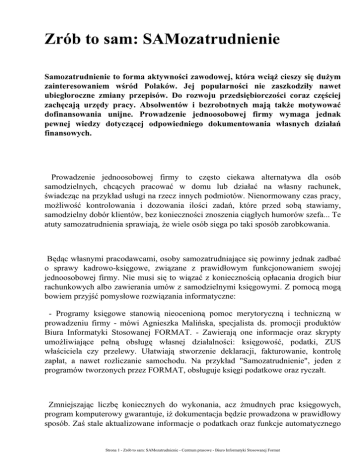 Zrób to sam: SAMozatrudnienie Samozatrudnienie to forma aktywności zawodowej, która wciąż cieszy się dużym zainteresowaniem wśród Polaków. Jej popularności nie zaszkodziły nawet ubiegłoroczne zmiany przepisów. Do rozwoju przedsiębiorczości coraz częściej zachęcają urzędy pracy. Absolwentów i bezrobotnych mają także motywować dofinansowania unijne. Prowadzenie jednoosobowej firmy wymaga jednak pewnej wiedzy dotyczącej odpowiedniego dokumentowania własnych działań finansowych. Prowadzenie jednoosobowej firmy to często ciekawa alternatywa dla osób samodzielnych, chcących pracować w domu lub działać na własny rachunek, świadcząc na przykład usługi na rzecz innych podmiotów. Nienormowany czas pracy, możliwość kontrolowania i dozowania ilości zadań, które przed sobą stawiamy, samodzielny dobór klientów, bez konieczności znoszenia ciągłych humorów szefa... Te atuty samozatrudnienia sprawiają, że wiele osób sięga po taki sposób zarobkowania. Będąc własnymi pracodawcami, osoby samozatrudniające się powinny jednak zadbać o sprawy kadrowo-księgowe, związane z prawidłowym funkcjonowaniem swojej jednoosobowej firmy. Nie musi się to wiązać z koniecznością opłacania drogich biur rachunkowych albo zawierania umów z samodzielnymi księgowymi. Z pomocą mogą bowiem przyjść pomysłowe rozwiązania informatyczne: - Programy księgowe stanowią nieocenioną pomoc merytoryczną i techniczną w prowadzeniu firmy - mówi Agnieszka Malińska, specjalista ds. promocji produktów Biura Informatyki Stosowanej FORMAT. - Zawierają one informacje oraz skrypty umożliwiające pełną obsługę własnej działalności: księgowość, podatki, ZUS właściciela czy przelewy. Ułatwiają stworzenie deklaracji, fakturowanie, kontrolę zapłat, a nawet rozliczanie samochodu. Na przykład "Samozatrudnienie", jeden z programów tworzonych przez FORMAT, obsługuje księgi podatkowe oraz ryczałt. Zmniejszając liczbę koniecznych do wykonania, acz żmudnych prac księgowych, program komputerowy gwarantuje, iż dokumentacja będzie prowadzona w prawidłowy sposób. Zaś stale aktualizowane informacje o podatkach oraz funkcje automatycznego Strona 1 - Zrób to sam: SAMozatrudnienie - Centrum prasowe - Biuro Informatyki Stosowanej Format wypełniania i wydruku deklaracji, uchronią od błędów niejednego płatnika urzędu skarbowego. Co istotne, takie programy, przeznaczone dla jednoosobowych inicjatyw, świetnie sprawdzą się również w przypadku firm małych lub takich, które dopiero rozpoczynają działalność gospodarczą. Samozatrudnienie może więc stanowić wstęp do rozwoju własnej, dużej firmy, która stanie się pracodawcą dla wielu innych osób Strona 2 - Zrób to sam: SAMozatrudnienie - Centrum prasowe - Biuro Informatyki Stosowanej Format