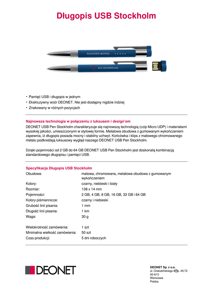 Długopis USB Stockholm . Pamięć USB i długopis w jednym . Ekskluzywny wzór DEONET. Nie jest dostępny nigdzie indziej . Znakowany w różnych pozycjach Najnowsza technologia w połączeniu z luksusem i design’em DEONET USB Pen Stockholm charakteryzuje się najnowszą technologią (czip Micro UDP) i materiałami wysokiej jakości, umieszczonymi w stylowej formie. Metalowa obudowa z gumowanym wykończeniem zapewnia, iż długopis posiada mocny i stabilny uchwyt. Końcówka i klips z matowego chromowanego metalu podkreślają luksusowy wygląd naszego DEONET USB Pen Stockholm. Dzięki pojemności od 2 GB do 64 GB DEONET USB Pen Stockholm jest doskonałą kombinacją standardowego długopisu i pamięci USB. Specyfikacja Długopis USB Stockholm Obudowa: matowa, chromowana, metalowa obudowa z gumowanym wykończeniem Kolory: czarny, niebieski i biały Rozmiar: 138 x 14 mm Pojemności: 2 GB, 4 GB, 8 GB, 16 GB, 32 GB i 64 GB Kolory piśmiennicze: czarny i niebieski Grubość linii pisania: 1 mm Długość linii pisania: 1 km Waga: 30 g Wielokrotność zamówienia: 1 szt Minimalna wielkość zamówienia: 50 szt Czas produkcji: 5 dni roboczych DEONET Sp. z o.o. ul. Chalubiñskiego 8 p. 45:72 00-613 Warszawa Polska Możliwości znakowania . Nadruk w pełnym kolorze i/lub grawer laserowy w 4 pozycjach . Możliwość indywidualnej personalizacji . Wgrywanie danych usuwalnych, nieusuwalnych lub chronionych przez DeoCrypt Opakowania Pudełko Frame Torebka foliowa Etui na długopis Pudełko Tube Pudełko na długopis DEONET Sp. z o.o. ul. Chalubiñskiego 8 p. 45:72 00-613 Warszawa Polska Powered by TCPDF (www.tcpdf.org)