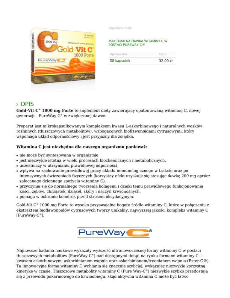 suplement diety MAKSYMALNA DAWKA WITAMINY C W POSTACI PUREWAY-C® Opakowanie Cena 30 kapsułek 32.00 zł OPIS Gold-Vit C® 1000 mg Forte to suplement diety zawierający opatentowaną witaminę C, nowej generacji – PureWay-C® w zwiększonej dawce. Preparat jest mikrokapsułkowanym kompleksem kwasu L-askorbinowego i naturalnych wosków roślinnych (tłuszczowych metabolitów), wzbogaconych bioflawonoidami cytrusowymi, który wspomaga układ odpornościowy i jest przyjazny dla żołądka. Witamina C jest niezbędna dla naszego organizmu ponieważ: ● ● ● ● ● ● nie może być syntezowana w organizmie jest niezwykle istotna w wielu procesach biochemicznych i metabolicznych, uczestniczy w utrzymaniu prawidłowej odporności, wpływa na zachowanie prawidłowej pracy układu immunologicznego w trakcie oraz po intensywnych ćwiczeniach fizycznych (korzystny efekt uzyskuje się stosując dawkę 200 mg oprócz zalecanego dziennego spożycia witaminy C), przyczynia się do normalnego tworzenia kolagenu i dzięki temu prawidłowego funkcjonowania kości, zębów, chrząstek, dziąseł, skóry i naczyń krwionośnych, pomaga w ochronie komórek przed stresem oksydacyjnym. Gold-Vit C® 1000 mg Forte to wysoko przyswajalne bogate źródło witaminy C, które w połączeniu z ekstraktem bioflawonoidów cytrusowych tworzy unikalny, najwyższej jakości kompleks witaminy C [PureWay-C®]. Najnowsze badania naukowe wykazały wyższość ultranowoczesnej formy witaminy C w postaci tłuszczowych metabolitów (PureWay-C®) nad dostępnymi dotąd na rynku formami witaminy C – kwasem askorbinowym, askorbinianem wapnia oraz askorbinianem/treonianem wapnia (Ester-C®). Ta innowacyjna forma witaminy C wchłania się znacznie szybciej, wykazując niezwykle korzystną kinetykę w czasie. Tłuszczowe metabolity witaminy C (Pure Way-C®) niezwykle szybko przedostają się z przewodu pokarmowego do krwioobiegu, skąd aktywna witamina C może być łatwo dystrybuowana do komórek. W przeprowadzonym na grupie zdrowych ochotników badaniu klinicznym wykazano przewagę w szybkości wchłaniania tłuszczowych metabolitów witaminy C nad innymi formami tej witaminy w odniesieniu do grupy kontrolnej. W porównaniu do innych obecnych na rynku form witaminy C Pure Way-C® jest najkorzystniejszą i najszybszą w działaniu postacią tej niezwykle potrzebnej i aktywnej w organizmie cząsteczki. Fakt doskonałego wchłaniania PureWay-C® do krwioobiegu związany jest jednocześnie z wyjątkowo szybką przenikalnością tłuszczowych metabolitów witaminy C przez błony komórek. Mikrokapsułkowane cząsteczki PureWay-C® mają znacznie większe powinowactwo do lipidowych struktur błon komórkowych, dlatego łatwiej i sprawniej mogą przez nie przenikać do wnętrza komórek. W badaniach naukowych udowodniono, że ta forma witaminy C była najszybciej absorbowana przez ludzkie limfocyty T H9. Te komórki układu odpornościowego, pełnią niezwykle istotne funkcje w organizmie. Siła antyoksydacyjna PureWay-C® ora zdolności do wymiatania wolnych rodników to kolejne cechy wyróżniające tłuszczowe metabolity witaminy C od innych form witaminy C. Przebadano zdolność do wymiatania wolnych rodników poprzez analizę stopnia redukcji DPPH, co pozwoliło określić stopień efektywności tłuszczowych metabolitów witaminy C w walce z wolnymi rodnikami. SKŁAD Informacja żywieniowa 1 kapsułka PureWay- C® 1111 mg w tym: Witamina C 1000 mg (1250%*) Bioflawonoidy cytrusowe (z PureWay-C® ) 25 mg *RWS - referencyjna wartość spożycia. Składniki: mikrokapsułkowany kwas L-askorbinowy [PureWay-C®] (wit.C), bioflawonoidy cytrusowe, substancja przeciwzbrylająca – sole magnezowe kwasów tłuszczowych; substancja wypełniająca celuloza mikrokrystaliczna; kapsułka (żelatyna – składnik otoczki, barwniki: E 171). PRZEZNACZENIE Gold-Vit C® 1000 Forte przeznaczony jest dla osób wykazujących zwiększone zapotrzebowanie na witaminę C; szczególnie dla narażonych na stres, palących papierosy, osób starszych oraz aktywnych fizycznie. Szczególnie polecany osobom wykonującym ciężką pracę fizyczną, sportowcom wyczynowym oraz w okresie obniżonej odporności. DAWKOWANIE Zalecana dzienna porcja: 1 kapsułka raz dziennie po posiłku głównym lub inaczej po konsultacji z lekarzem. Przeciwwskazania: nadwrażliwość na składniki preparatu. Osoby z kamica nerkowa (szczawianowa lub moczanowa), zaburzeniami gospodarki żelaza (talasemia, hemochromatoza), kobiety w ciąży lub karmiące stosowanie preparatu powinny skonsultować z lekarzem. Nie należy przekraczać zalecanej dziennej porcji do spożycia w ciągu dnia. Suplement diety nie może być stosowany jako substytut zróżnicowanej diety. Zalecany jest zrównoważony sposób żywienia i zdrowy tryb życia.