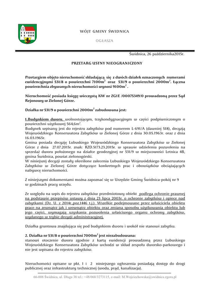 WÓJT GMINY ŚWIDNICA OGŁASZA Świdnica, 26 października2015r. PRZETARG USTNY NIEOGRANICZONY Przetargiem objęto nieruchomość składającą się z dwóch działek oznaczonych numerami ewidencyjnymi 531/8 o powierzchni 7100m2 oraz 531/9 o powierzchni 2000m2. Łączna powierzchnia zbywanych nieruchomości wynosi 9100m2 . Nieruchomość posiada księgę wieczystą KW nr ZG1E /00075349/0 prowadzoną przez Sąd Rejonowy w Zielonej Górze. Działka nr 531/9 o powierzchni 2000m2 zabudowana jest: 1.Budynkiem dworu, wolnostojącym, trzykondygnacyjnym w części podpiwniczonym o powierzchni użytkowej 564,6m2. Budynek wpisany jest do rejestru zabytków pod numerem L-691/A (dawniej 518), decyzją Wojewódzkiego Konserwatora Zabytków w Zielonej Górze z dnia 30.05.1963r. oraz z dnia 16.03.1965r. Gmina posiada decyzję Lubuskiego Wojewódzkiego Konserwatora Zabytków w Zielonej Górze z dnia 27.07.2015r. znak: RZD.5173.23.2015r. w sprawie udzielenia pozwolenia na sprzedaż dworu położonego na działce geodezyjnej nr 531/9 w miejscowości Letnica 4B, gmina Świdnica, powiat zielonogórski. W niniejszej decyzji zostały określone zalecenia Lubuskiego Wojewódzkiego Konserwatora Zabytków w Zielonej Górze dotyczące konkretnych prac i obowiązków obciążających nabywcę nieruchomości. Z niniejszymi dokumentami można zapoznać się w Urzędzie Gminy Świdnica-pokój nr 9 w godzinach pracy urzędu. Ze względu na wpis do rejestru zabytków przedmiotowy obiekt podlega ochronie prawnej na podstawie przepisów ustawy z dnia 23 lipca 2003r. o ochronie zabytków i opiece nad zabytkami (Dz. U. z 2014r.,poz.1446 t.j.). Wszelkie podejmowane przez właściciela obiektu prace na zewnątrz jak i wewnątrz obiektu oraz zmiana sposobu użytkowania obiektu lub jego części, wymagają uzyskania pozwolenia właściwego organu ochrony zabytków, wydanego w trybie decyzji administracyjnej. Działka gruntowa znajdująca się pod budynkiem dworu i wokół nie stanowi zabytku. 2. Działka nr 531/8 o powierzchni 7000m2 jest niezabudowana: stanowi otoczenie dworu zgodnie z kartą ewidencji prowadzoną przez Lubuskiego Wojewódzkiego Konserwatora Zabytków wchodzi w skład zespołu dworsko-parkowego i nie jest wpisana do rejestru zabytków. Nieruchomości opisane w pkt. 1 i 2 niniejszego ogłoszenia posiadają dostęp do drogi publicznej oraz infrastruktury technicznej (woda, prąd, kanalizacja). 66-008 Świdnica, ul. Długa 38 tel.: +48/068/3273115, e-mail: [email protected] W obowiązującej zmianie miejscowego planu zagospodarowania przestrzennego gminy Świdnica w zakresie lokalizacji funkcji usług kultury, rekreacji, funkcji mieszkaniowej oraz terenów leśnych i parkowych zatwierdzonej uchwałą Rady Gminy Świdnica nr II/8/03 z dnia 21 marca 2003r.: - działka nr 531/9 –oznaczona jest UK,MN – teren usług kultury z dopuszczeniem funkcji mieszkaniowej, -działka nr 531/8 –oznaczona jest ZP,Ls,US – teren zieleni parkowej, lasów i rekreacji. Nieruchomość przeznaczona do sprzedaży łącznie dwie działki wolna jest od wszelkich długów, ciężarów i zobowiązań. Nie przewiduje się sprzedaży pojedynczych działek wymienionych w ogłoszeniu. Cena nieruchomości stanowiącej działkę zabudowaną dworem oznaczoną nr 531/9 oraz działkę niezabudowaną oznaczoną nr 531/8 została ustalona zgodnie z art. 67 ust.1 i 2 pkt.1 oraz art. 68 ust.3 ustawy o gospodarce nieruchomościami (zastosowano 50% bonifikatę dla budynku dworu wpisanego do rejestru zabytków). Cena wywoławcza nieruchomości wynosi: 1.034.676,00zł (słownie złotych jeden milion trzydzieści cztery tysiące sześćset siedemdziesiąt sześć 00/100) Ustala się wysokość wadium w kwocie 103.470,00zł oraz minimalną wysokość postąpienia w kwocie 10.400,00zł Przetarg na sprzedaż nieruchomości odbędzie się w dniu 28 grudnia 2015r. o godz. 1000 w siedzibie Urzędu Gminy Świdnica, ul. Długa 38- sala posiedzeń – pokój nr 2. Warunkiem przystąpienia do przetargu jest wniesienie wadium w pieniądzu, które należy wpłacić na konto Urzędu Gminy Świdnica nr 16 1020 5402 0000 0602 0027 8838 PKO BP SA I ODDZIAŁ w Zielonej Górze, w takim terminie, aby najpóźniej w dniu 24 grudnia 2015r. wymagana kwota znajdowała się na w/w koncie, z dopiskiem „na nieruchomość składającą się z działek nr 531/8 i 531/9 położonych w miejscowości Letnica”. Osoby uczestniczące w przetargu zobowiązane są przedłożyć komisji przetargowej: dowód wpłaty wadium i dowód tożsamości. Osoby reprezentujące w przetargu podmioty gospodarcze, dodatkowo komplet dokumentów niezbędny do ich reprezentowania. Uczestnicy biorą udział w przetargu osobiście lub przez pełnomocnika (pełnomocnictwo wymaga formy pisemnej). Małżonkowie posiadający wspólność ustawową biorą udział w przetargu osobiście lub za okazaniem pełnomocnictwa współmałżonka, zawierającym zgodę na odpłatne nabycie nieruchomości. Sprzedaż nieruchomości dla cudzoziemców następuje na podstawie ustawy z dnia 24 marca 1920r. o nabywaniu nieruchomości przez cudzoziemców – wymaga uzyskania zezwolenia Ministra Spraw Wewnętrznych, które musi być uzyskane do dnia zawarcia aktu notarialnego, w przypadku nieuzyskania wymaganego zezwolenia do dnia zawarcia aktu notarialnego wpłacone wadium przepada na rzecz Gminy. Przetarg jest ważny bez względu na liczbę uczestników przetargu, jeżeli przynajmniej jeden uczestnik zaoferuje co najmniej jedno postąpienie minimalne powyższej ceny wywoławczej. Wadium wpłacone przez uczestnika przetargu, który przetarg wygra zostanie zaliczone na poczet ceny nabycia nieruchomości. Pozostałym uczestnikom przetargu wadium zostanie zwrócone niezwłocznie po rozstrzygnięciu przetargu przelewem na podane konto bankowe. 66-008 Świdnica, ul. Długa 38 tel.: +48/068/3273115, e-mail: [email protected] Wylicytowana cena sprzedaży nieruchomości podlega zapłacie do czasu zawarcia aktu notarialnego, które nast