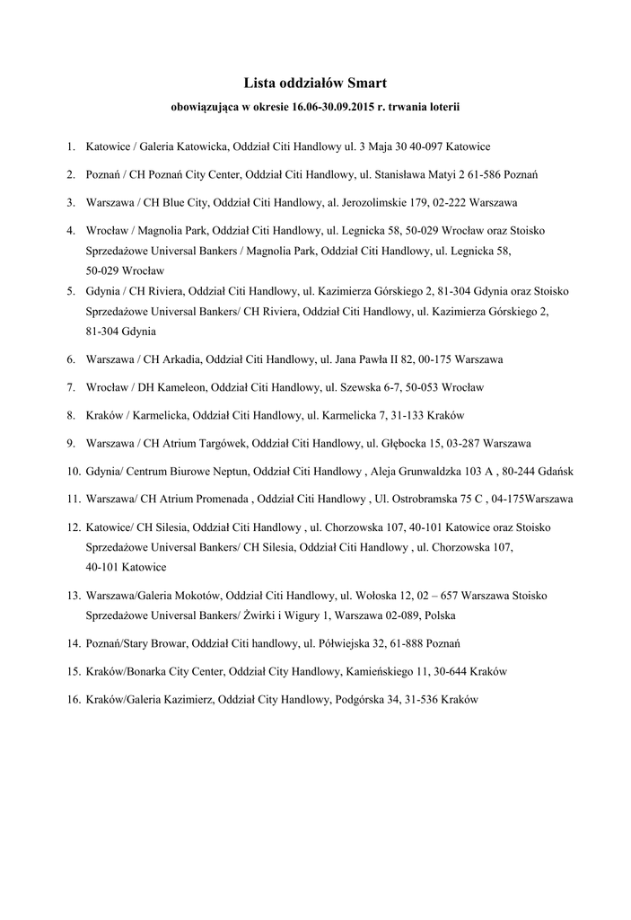 Lista oddziałów Smart obowiązująca w okresie 16.06-30.09.2015 r. trwania loterii 1. Katowice / Galeria Katowicka, Oddział Citi Handlowy ul. 3 Maja 30 40-097 Katowice 2. Poznań / CH Poznań City Center, Oddział Citi Handlowy, ul. Stanisława Matyi 2 61-586 Poznań 3. Warszawa / CH Blue City, Oddział Citi Handlowy, al. Jerozolimskie 179, 02-222 Warszawa 4. Wrocław / Magnolia Park, Oddział Citi Handlowy, ul. Legnicka 58, 50-029 Wrocław oraz Stoisko Sprzedażowe Universal Bankers / Magnolia Park, Oddział Citi Handlowy, ul. Legnicka 58, 50-029 Wrocław 5. Gdynia / CH Riviera, Oddział Citi Handlowy, ul. Kazimierza Górskiego 2, 81-304 Gdynia oraz Stoisko Sprzedażowe Universal Bankers/ CH Riviera, Oddział Citi Handlowy, ul. Kazimierza Górskiego 2, 81-304 Gdynia 6. Warszawa / CH Arkadia, Oddział Citi Handlowy, ul. Jana Pawła II 82, 00-175 Warszawa 7. Wrocław / DH Kameleon, Oddział Citi Handlowy, ul. Szewska 6-7, 50-053 Wrocław 8. Kraków / Karmelicka, Oddział Citi Handlowy, ul. Karmelicka 7, 31-133 Kraków 9. Warszawa / CH Atrium Targówek, Oddział Citi Handlowy, ul. Głębocka 15, 03-287 Warszawa 10. Gdynia/ Centrum Biurowe Neptun, Oddział Citi Handlowy , Aleja Grunwaldzka 103 A , 80-244 Gdańsk 11. Warszawa/ CH Atrium Promenada , Oddział Citi Handlowy , Ul. Ostrobramska 75 C , 04-175Warszawa 12. Katowice/ CH Silesia, Oddział Citi Handlowy , ul. Chorzowska 107, 40-101 Katowice oraz Stoisko Sprzedażowe Universal Bankers/ CH Silesia, Oddział Citi Handlowy , ul. Chorzowska 107, 40-101 Katowice 13. Warszawa/Galeria Mokotów, Oddział Citi Handlowy, ul. Wołoska 12, 02 – 657 Warszawa Stoisko Sprzedażowe Universal Bankers/ Żwirki i Wigury 1, Warszawa 02-089, Polska 14. Poznań/Stary Browar, Oddział Citi handlowy, ul. Półwiejska 32, 61-888 Poznań 15. Kraków/Bonarka City Center, Oddział City Handlowy, Kamieńskiego 11, 30-644 Kraków 16. Kraków/Galeria Kazimierz, Oddział City Handlowy, Podgórska 34, 31-536 Kraków