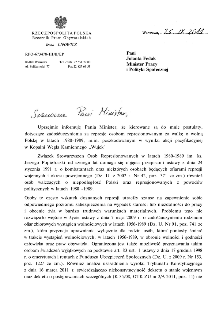 R Z E C Z P O S P O L I T A POLSKA Rzecznik P r a w Obywatelskich Irena LIPOWICZ RPO-673478-III/ll/EP 00-090 Warszawa Al. Solidarności 77 Tel. centr. 22 551 77 00 Fax 22 827 64 53 Pani Jolanta Fedak Minister Pracy i Polityki Społecznej Uprzejmie informuję Panią Minister, że kierowane są do mnie postulaty, dotyczące zadośćuczynienia za represje osobom represjonowanym za walkę o wolną Polskę w latach 1980-1989, m.in. poszkodowanym w wyniku akcji pacyfikacyjnej w Kopalni Węgla Kamiennego „Wujek". Związek Stowarzyszeń Osób Represjonowanych w latach 1980-1989 im. ks. Jerzego Popiełuszki od szeregu lat domaga się objęcia przepisami ustawy z dnia 24 stycznia 1991 r. o kombatantach oraz niektórych osobach będących ofiarami represji wojennych i okresu powojennego (Dz. U. z 2002 r. Nr 42, poz. 371 ze zm.) również osób walczących o niepodległość Polski oraz represjonowanych z powodów politycznych w latach 1980 -1989. Osoby te często wskutek doznanych represji utraciły szanse na zapewnienie sobie odpowiedniego poziomu zabezpieczenia na wypadek starości lub niezdolności do pracy i obecnie żyją w bardzo trudnych warunkach materialnych. Problemu tego nie rozwiązało wejście w życie ustawy z dnia 7 maja 2009 r. o zadośćuczynieniu rodzinom ofiar zbiorowych wystąpień wolnościowych w latach 1956-1989 (Dz. U. Nr 91, poz. 741 ze zm.), która przyznaje uprawnienia wyłącznie dla rodzin osób, które" poniosły śmierć w trakcie wystąpień wolnościowych, w latach 1956-1989, w obronie wolności i godności człowieka oraz praw obywatela. Ograniczona jest także możliwość przyznawania takim osobom świadczeń wyjątkowych na podstawie art. 83 ust. 1 ustawy z dnia 17 grudnia 1998 r. o emeryturach i rentach z Funduszu Ubezpieczeń Społecznych (Dz. U. z 2009 r. Nr 153, poz. 1227 ze zm.). Również analiza uzasadnienia wyroku Trybunału Konstytucyjnego z dnia 16 marca 2011 r. stwierdzającego niekonstytucyjność dekretu o stanie wojennym oraz dekretu o postępowaniach szczególnych (K 35/08, OTK ZU nr 2/A 2011, poz. 11) nie 2 stwarza podstaw do rozszerzenia kręgu beneficjentów w stosunku do obowiązującej ustawy kombatanckiej. Orzeczenie Trybunału Konstytucyjnego ma bezpośrednią doniosłość w sferze prawa karnego. Umożliwia ono na żądanie zainteresowanych wznowienie postępowań karnych, w których stosowane były przepisy prawa represyjnego zawarte w zakwestionowanych dekretach. Ministerstwo Pracy i Polityki Społecznej dokonało analizy roszczeń, związanych z okresem 1939 - 1989, różnych grup społecznych. W „Założeniach nowelizacji prawa kombatanckiego", przyjętych przez Radą Ministrów w dniu 27 marca 2007 r., zawarta została część informacyjna, zawierająca oczekiwania poszczególnych grup społecznych. Wśród nich są między innymi: osoby deportowane do pracy przymusowej, małoletnie ofiary wojny tzw. cywilne ofiary wojny, osoby wysiedlone w czasie wojny ze swego miejsca zamieszkania, osoby rozminowujące kraj w latach 1945-56, ofiary akcji Wisła, przymusowo pracujący żołnierze batalionów budowlanych, junacy Powszechnej Organizacji „Służba Polsce", żołnierze-górnicy. Wybrano tylko niektóre z tych grup, które zostały określone min. uchwałą Sejmu z dnia 6 kwietnia 2006 r. w sprawie pomocy państwa dla represjonowanych uczestników walk o niepodległość z lat 1944-1989, znajdujących się obecnie w bardzo trudnych warunkach materialnych (M. P. Nr 26, poz. 282). Ponadto nową kategorią beneficjentów projektowanej ustawy mieli zostać działacze opozycji wobec dyktatury komunistycznej. Projekt Założeń był przedmiotem szerokich konsultacji społecznych, głównie w środowiskach kombatantów i osób represjonowanych. Na podstawie założeń nowelizacji prawa kombatanckiego, opracowany został projekt ustawy o uprawnieniach kombatantów, uczestników walki cywilnej lat 1914 - 1945, działaczy opozycji wobec dyktatury komunistycznej oraz niektórych ofiar represji systemów totalitarnych. Obecnie, jak wynika z informacji udzielonych Rzecznikowi, w Ministerstwie Pracy i Polityki Społecznej nie są prowadzone prace w tym zakresie. W związku z powyższym, działając na podstawie art. 16 ust. 1 ustawy z dnia 15 lipca 1987r. o Rzeczniku Praw Obywatelskich (Dz. U. nr 14. poz. 147 ze zm.), zwracam się do Pani Minister z uprzejmą prośbą o przedstawienie stanowiska w kwestii wprowadzenia regulacji ustawowej dotyczącej zadośćuczynienia osobom represjonowanym w czasach PRL.