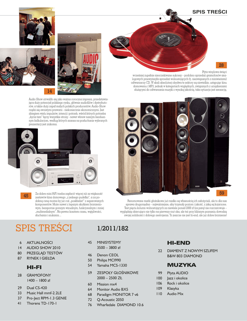 SPIS TRECI 28 Pyta winylowa wici wczeniej zupenie nieoczekiwane sukcesy – podobno sprzeda gramofonów analogowych przewyszya sprzeda wolnostojcych (tj. niezwizanych z miniwieami) odtwarzaczy CD. W skali absolutnej obydwa te sektory s niewielkie, ustpujc kinu domowemu i MP3, jednak w kategoriach wzgldnych, zwizanych z urzdzeniami sucymi do odtwarzania muzyki z wysok jakoci, taka sytuacja jest sensacj. 14 Audio Show utrwalio si jako wana coroczna impreza, przedstawiajca duy potencja polskiego rynku, gównie audiolów i dystrybutorów, a take duy zapa maych polskich producentów. Audio-Show rzdzi si swoistymi prawami - niekoniecznie ekonomicznymi. Jest zbiegiem wielu impulsów, intencji i potrzeb, wród których potrzeba „bycia tam” czy wszystkie strony - nawet wbrew naszym bezdusznym kalkulacjom, wedug których szansa na posuchanie wybranych prezentacji jest znikoma. 45 Za dobre mini-HiFi trzeba zapaci wicej ni za wikszo zestawów kina domowego „z jednego pudeka”, a za podobn cen mona by ju co „poskada” z separowanych komponentów. Moe nawet z lepszym skutkiem brzmieniowym, bezspornie gorszym wizualnym, funkcjonalnym i mniej „multimedialnym”. Na pewno kosztem czasu, wtpliwoci, suchania i szukania… SPIS TRECI 6 14 80 87 AKTUALNOŚCI AUDIO SHOW 2010 PRZEGLĄD TESTÓW RYNEK I GIEŁDA HI-FI 28 GRAMOFONY 1400 – 1800 zł 29 33 37 41 Dual CS-420 Music Hall mmf-2.2LE Pro-Ject RPM-1.3 GENIE Thorens TD-170-1 59 Renomowane marki gonikowe ju rzadko s wasnoci ich zaoycieli, ale to dla nas sprawa drugorzdna – najwaniejsze, aby trzymay poziom i jako, z jak s kojarzone. Test piciu kolumn wolnostojcych za niewiele ponad 2000 z (za par) nie rozczarowuje – wygldaj obiecujco nie tylko na pierwszy rzut oka, ale te przy bliszym poznaniu dowodz swojej solidnoci i dobrego zestrojenia. To jeszcze nie jest hi-end, ale ju dobre brzmienie! 1/2011/182 45 MINISYSTEMY 3500 – 3800 zł 46 50 54 Denon CEOL Philips MCI990 Yamaha MCS-1330 59 ZESPOŁY GŁOŚNIKOWE 2000 – 2500 ZŁ 60 64 68 72 76 Mission mx4 Monitor Audio BX5 Paradigm MONITOR 7 v6 Q-Acoustic 2050 Wharfedale DIAMOND 10.6 HI-END 22 DIAMENT Z NOWYM SZLIFEM B&W 803 DIAMOND MUZYKA 99 100 106 109 110 Płyta AUDIO Jazz i okolice Rock i okolice Klasyka Audio Mix