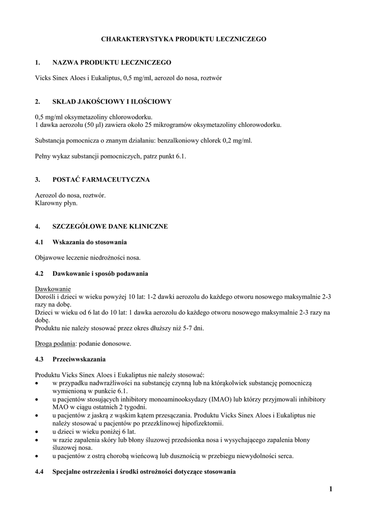 CHARAKTERYSTYKA PRODUKTU LECZNICZEGO 1. NAZWA PRODUKTU LECZNICZEGO Vicks Sinex Aloes i Eukaliptus, 0,5 mg/ml, aerozol do nosa, roztwór 2. SKŁAD JAKOŚCIOWY I ILOŚCIOWY 0,5 mg/ml oksymetazoliny chlorowodorku. 1 dawka aerozolu (50 μl) zawiera około 25 mikrogramów oksymetazoliny chlorowodorku. Substancja pomocnicza o znanym działaniu: benzalkoniowy chlorek 0,2 mg/ml. Pełny wykaz substancji pomocniczych, patrz punkt 6.1. 3. POSTAĆ FARMACEUTYCZNA Aerozol do nosa, roztwór. Klarowny płyn. 4. SZCZEGÓŁOWE DANE KLINICZNE 4.1 Wskazania do stosowania Objawowe leczenie niedrożności nosa. 4.2 Dawkowanie i sposób podawania Dawkowanie Dorośli i dzieci w wieku powyżej 10 lat: 1-2 dawki aerozolu do każdego otworu nosowego maksymalnie 2-3 razy na dobę. Dzieci w wieku od 6 lat do 10 lat: 1 dawka aerozolu do każdego otworu nosowego maksymalnie 2-3 razy na dobę. Produktu nie należy stosować przez okres dłuższy niż 5-7 dni. Droga podania: podanie donosowe. 4.3 Przeciwwskazania Produktu Vicks Sinex Aloes i Eukaliptus nie należy stosować: w przypadku nadwrażliwości na substancję czynną lub na którąkolwiek substancję pomocniczą wymienioną w punkcie 6.1. u pacjentów stosujących inhibitory monoaminooksydazy (IMAO) lub którzy przyjmowali inhibitory MAO w ciągu ostatnich 2 tygodni. u pacjentów z jaskrą z wąskim kątem przesączania. Produktu Vicks Sinex Aloes i Eukaliptus nie należy stosować u pacjentów po przezklinowej hipofizektomii. u dzieci w wieku poniżej 6 lat. w razie zapalenia skóry lub błony śluzowej przedsionka nosa i wysychającego zapalenia błony śluzowej nosa. u pacjentów z ostrą chorobą wieńcową lub dusznością w przebiegu niewydolności serca. 4.4 Specjalne ostrzeżenia i środki ostrożności dotyczące stosowania 1 4.5 Należy zachować ostrożność w przypadku nadciśnienia tętniczego, chorób serca, w tym dławicy piersiowej, nadczynności tarczycy, cukrzycy i rozrostu gruczołu krokowego. Nie należy stosować dawki większej niż zalecana. Jeśli objawy nasilą się lub nie ulegną poprawie po 3 dniach stosowania leku, lekarz powinien ponownie ocenić stan pacjenta. Vicks Sinex Aloes i Eukaliptus może być stosowany przez maksimum 7 kolejnych dni, aby uniknąć efektu odbicia i zapalenia błony śluzowej nosa spowodowanego lekami. Środek konserwujący (benzalkoniowy chlorek) wchodzący w skład produktu Vicks Sinex Aloes i Eukaliptus może powodować obrzęk błony śluzowej nosa, szczególnie podczas długotrwałego stosowania. Jeśli taka reakcja (przewlekła niedrożność nosa) jest podejrzewana, należy stosować inne leki do stosowania do nosa nie zawierające środków konserwujących, jeśli możliwe. Jeśli leki do stosowania do nosa, bez środków konserwujących, są niedostępne, należy rozważyć zastosowanie leku w innej postaci. Interakcje z innymi lekami i inne rodzaje interakcji Produktu nie należy stosować w skojarzeniu z inhibitorami MAO lub przez okres do 2 tygodni po stosowaniu inhibitorów MAO, ze względu na ryzyko wystąpienia interakcji prowadzących do nadciśnienia tętniczego. Produkt ten wchodzi w interakcje z trójpierścieniowymi lekami przeciwdepresyjnymi powodując zwiększenie ryzyka wystąpienia nadciśnienia tętniczego i arytmii serca. Działanie beta-adrenolityków i innych leków przeciwnadciśnieniowych, takich jak metylodopy, betanidyny, debryzochiny i guanetydyny może być antagonistyczne. Podczas jednoczesnego stosowania sympatykomimetyków i leków stosowanych w chorobie Parkinsona, takich jak bromokryptyna, rozwinąć się może nasilona toksyczność sercowo-naczyniowa. 4.6 Wpływ na płodność, ciążę i laktację Ciąża Brak danych klinicznych dotyczących ekspozycji kobiet w ciąży na oksymetazolinę. Wyniki badań na zwierzętach nie wykazują bezpośredniego lub pośredniego szkodliwego wpływu na ciążę, rozwój zarodka/płodu, poród i rozwój pourodzeniowy. Karmienie piersią Nie wiadomo, czy oksymetazoliny chlorowodorek przenika do mleka matki. Nie należy przekraczać zalecanej dawki, ponieważ przedawkowanie może zmniejszyć przepływ krwi łożyskowej i wytwarzanie mleka. Należy zachować ostrożność stosując produkt w czasie ciąży i karmienia piersią, gdyż oksymetazolina może przenikać do krążenia ogólnego. 4.7 Wpływ na zdolność prowadzenia pojazdów i obsługiwania maszyn Vicks Sinex Aloes i Eukaliptus nie ma wpływu na zdolność prowadzenia pojazdów i obsługiwania maszyn. 4.8 Działania niepożądane Działania niepożądane są wymienione zgodnie z klasyfikacją układów i narządów i częstością występowania (liczba pacjentów, u których spodziewane jest wystąpienie reakcji), z użyciem następującej konwencji: bardzo często (≥1/10), często (≥1/100 do <1/10), niezbyt często (≥1/1 000 do <1/100), rzadko (≥1/10 000 do <1/1 000), bardzo rzadko (<1/10 000), częstość nieznana (nie może być określona na podstawie dostępnych danych). Klasyfikacja układów i narządów Działanie niepożądane Zaburzenia układu oddechowego, klatki piersiowej i śródpiersia Niezbyt często (1/100 – 1/1000): kichanie, suchość i podrażnienie błony śluzowej nosa, jamy ustnej i gardła 2 Zaburzenia układu nerwowego Rzadko (<1/1000): lęk, sedacja, drażliwość, zaburzenia snu u dzieci Zaburzenia serca i zaburzenia naczyniowe Rzadko (<1/1000): tachykardia, kołatanie serca, wzrost ciśnienia tętniczego krwi Zaburzenia ogólne i stany w miejscu podania Rzadko (<1/1000): przekrwienie reaktywne, ból głowy, nudności, wysypka i zaburzenia widzenia Stosowanie leku przez okres dłuższy niż zalecany może prowadzić do osłabienia działania i (lub) ponownego przekrwienia błony śluzowej nosa. Zgłaszanie podejrzewanych działań niepożądanych Po dopuszczeniu produktu leczniczego do obrotu istotne jest zgłaszanie podejrzewanych działań niepożądanych. Umożliwia to nieprzerwane monitorowanie stosunku korzyści do ryzyka stosowania