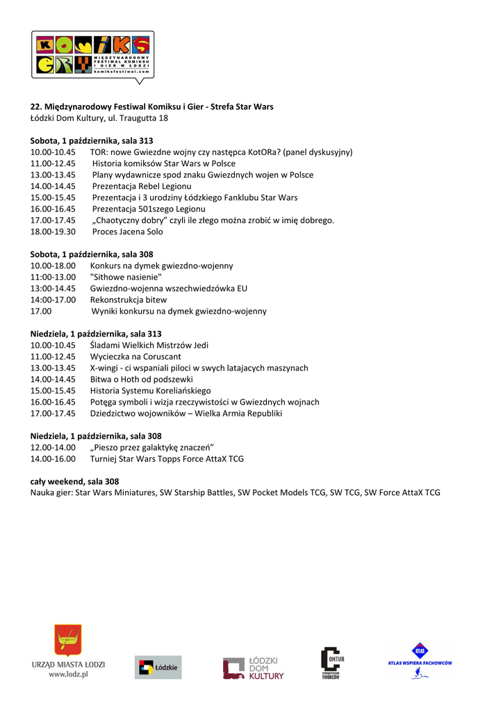 22. Międzynarodowy Festiwal Komiksu i Gier ‐ Strefa Star Wars Łódzki Dom Kultury, ul. Traugutta 18 Sobota, 1 października, sala 313 10.00‐10.45 TOR: nowe Gwiezdne wojny czy następca KotORa? (panel dyskusyjny) 11.00‐12.45 Historia komiksów Star Wars w Polsce 13.00‐13.45 Plany wydawnicze spod znaku Gwiezdnych wojen w Polsce 14.00‐14.45 Prezentacja Rebel Legionu 15.00‐15.45 Prezentacja i 3 urodziny Łódzkiego Fanklubu Star Wars 16.00‐16.45 Prezentacja 501szego Legionu 17.00‐17.45 „Chaotyczny dobry” czyli ile złego można zrobić w imię dobrego. 18.00‐19.30 Proces Jacena Solo Sobota, 1 października, sala 308 10.00‐18.00 Konkurs na dymek gwiezdno‐wojenny 11:00‐13.00 "Sithowe nasienie" 13:00‐14.45 Gwiezdno‐wojenna wszechwiedzówka EU 14:00‐17.00 Rekonstrukcja bitew 17.00 Wyniki konkursu na dymek gwiezdno‐wojenny Niedziela, 1 października, sala 313 10.00‐10.45 Śladami Wielkich Mistrzów Jedi 11.00‐12.45 Wycieczka na Coruscant 13.00‐13.45 X‐wingi ‐ ci wspaniali piloci w swych latajacych maszynach 14.00‐14.45 Bitwa o Hoth od podszewki 15.00‐15.45 Historia Systemu Koreliańskiego 16.00‐16.45 Potęga symboli i wizja rzeczywistości w Gwiezdnych wojnach 17.00‐17.45 Dziedzictwo wojowników – Wielka Armia Republiki Niedziela, 1 października, sala 308 12.00‐14.00 „Pieszo przez galaktykę znaczeń” 14.00‐16.00 Turniej Star Wars Topps Force AttaX TCG cały weekend, sala 308 Nauka gier: Star Wars Miniatures, SW Starship Battles, SW Pocket Models TCG, SW TCG, SW Force AttaX TCG