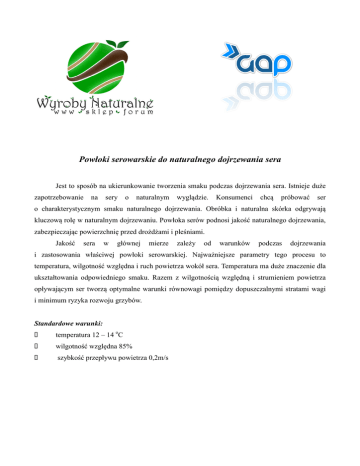 Powłoki serowarskie do naturalnego dojrzewania sera Jest to sposób na ukierunkowanie tworzenia smaku podczas dojrzewania sera. Istnieje duże zapotrzebowanie na sery o naturalnym wyglądzie. Konsumenci chcą próbować ser o charakterystycznym smaku naturalnego dojrzewania. Obróbka i naturalna skórka odgrywają kluczową rolę w naturalnym dojrzewaniu. Powłoka serów podnosi jakość naturalnego dojrzewania, zabezpieczając powierzchnię przed drożdżami i pleśniami. Jakość sera w głównej mierze zależy od warunków podczas dojrzewania i zastosowania właściwej powłoki serowarskiej. Najważniejsze parametry tego procesu to temperatura, wilgotność względna i ruch powietrza wokół sera. Temperatura ma duże znaczenie dla ukształtowania odpowiedniego smaku. Razem z wilgotnością względną i strumieniem powietrza opływającym ser tworzą optymalne warunki równowagi pomiędzy dopuszczalnymi stratami wagi i minimum ryzyka rozwoju grzybów. Standardowe warunki: temperatura 12 – 14 oC wilgotność względna 85% szybkość przepływu powietrza 0,2m/s Sposób nakładania powłoki Nakładanie powłoki serowarskiej na ser wykonuje się przy pomocy miękkiej gąbki, pędzla lub szmatki, nie zostawiającej nitek. Ser można powlekać po zakończeniu solenia i osuszeniu powierzchni. Jeżeli w międzyczasie na powierzchni sera pojawią się oznaki rozwoju pleśni, ser należy dokładnie umyć i osuszyć. Sery nie nadające się do pokrycia powłoką serowarską to te, które nie zostały odpowiednio ukwaszone podczas obróbki i zachowują wilgotną skórkę lub wydzielają serwatkę. Powłokę serowarską starannie mieszamy i nabieramy niewielką ilość na gąbkę lub pędzel. Nanosimy cienką warstwę powłoki na górną i boczne powierzchnie sera, upewniając się, czy nie zostały miejsca niepokryte. Pozostawiamy ser w miejscu suchym i mocno wentylowanym, w celu wyschnięcia powłoki, co może trwać kilka, do kilkunastu godzin. Gdy ser jest całkowicie suchy, skórka nie klei się i jest twarda, ser odwracamy i pokrywamy resztę powierzchni. Postępujemy analogicznie jak poprzednio. Taką czynność powtarzamy jeszcze dwu- lub trzykrotnie. Pomiędzy naniesieniem powłoki na pierwszą i drugą stronę nie powinno upłynąć więcej niż 24 godziny. Dla dobrego, końcowego efektu lepsze jest częstsze nakładanie cienkich warstw powłoki, niż rzadsze pokrywanie dużą ilością emulsji. UWAGA: powlekać można tylko sery twarde i półtwarde dojrzewające co najmniej 3 tygodnie. Pamiętajmy, że powłoka serowarska jest niejadalna i należy ją skroić przed konsumpcją, o czym powinno się informować klientów. Jeżeli emulsja nadmiernie zgęstnieje, np. wskutek częstego i długiego otwierania pojemnika, można ją rozcieńczyć przegotowaną, letnia wodą. Najważniejsze wskazówki przy stosowaniu powłoki: powłokę należy nakładać na ser możliwie jak najszybciej po wyjęciu go z solanki, aby zapobiec rozwojowi grzybów przed pierwszym pokryciem, ser musi być jak najszybciej osuszony po wyjęciu z solanki, w celu uniknięcia strat wody podczas nakładania powłoki odpowiednia dawka powłoki serowarskiej zależy od typu sera, rozmiarów, wieku, itd. emulsję nanosi się gąbką przez dokładne wcieranie lub natrysk, zabieg powtarza się dwulub trzykrotnie Powodzenia !