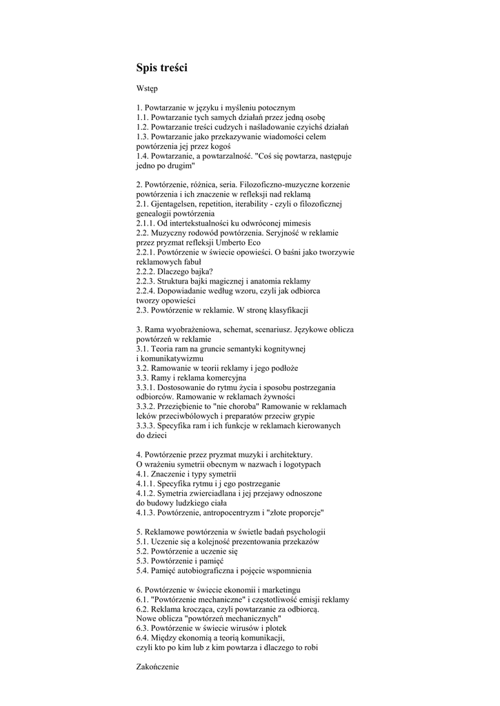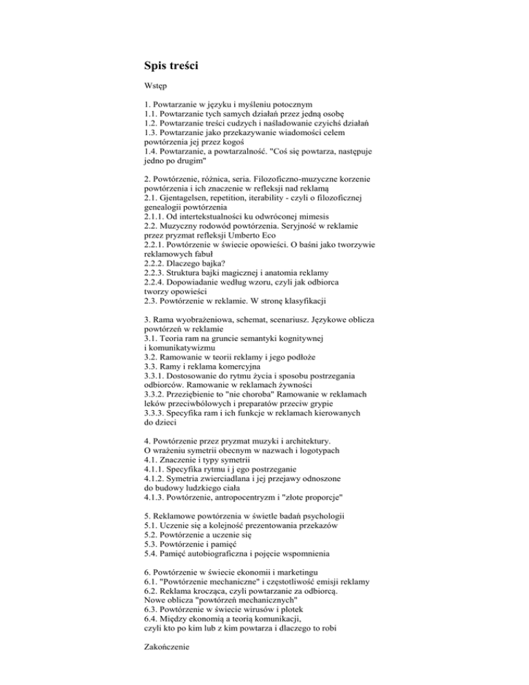 Spis treści Wstęp 1. Powtarzanie w języku i myśleniu potocznym 1.1. Powtarzanie tych samych działań przez jedną osobę 1.2. Powtarzanie treści cudzych i naśladowanie czyichś działań 1.3. Powtarzanie jako przekazywanie wiadomości celem powtórzenia jej przez kogoś 1.4. Powtarzanie, a powtarzalność. "Coś się powtarza, następuje jedno po drugim" 2. Powtórzenie, różnica, seria. Filozoficzno-muzyczne korzenie powtórzenia i ich znaczenie w refleksji nad reklamą 2.1. Gjentagelsen, repetition, iterability - czyli o filozoficznej genealogii powtórzenia 2.1.1. Od intertekstualności ku odwróconej mimesis 2.2. Muzyczny rodowód powtórzenia. Seryjność w reklamie przez pryzmat refleksji Umberto Eco 2.2.1. Powtórzenie w świecie opowieści. O baśni jako tworzywie reklamowych fabuł 2.2.2. Dlaczego bajka? 2.2.3. Struktura bajki magicznej i anatomia reklamy 2.2.4. Dopowiadanie według wzoru, czyli jak odbiorca tworzy opowieści 2.3. Powtórzenie w reklamie. W stronę klasyfikacji 3. Rama wyobrażeniowa, schemat, scenariusz. Językowe oblicza powtórzeń w reklamie 3.1. Teoria ram na gruncie semantyki kognitywnej i komunikatywizmu 3.2. Ramowanie w teorii reklamy i jego podłoże 3.3. Ramy i reklama komercyjna 3.3.1. Dostosowanie do rytmu życia i sposobu postrzegania odbiorców. Ramowanie w reklamach żywności 3.3.2. Przeziębienie to "nie choroba" Ramowanie w reklamach leków przeciwbólowych i preparatów przeciw grypie 3.3.3. Specyfika ram i ich funkcje w reklamach kierowanych do dzieci 4. Powtórzenie przez pryzmat muzyki i architektury. O wrażeniu symetrii obecnym w nazwach i logotypach 4.1. Znaczenie i typy symetrii 4.1.1. Specyfika rytmu i j ego postrzeganie 4.1.2. Symetria zwierciadlana i jej przejawy odnoszone do budowy ludzkiego ciała 4.1.3. Powtórzenie, antropocentryzm i "złote proporcje" 5. Reklamowe powtórzenia w świetle badań psychologii 5.1. Uczenie się a kolejność prezentowania przekazów 5.2. Powtórzenie a uczenie się 5.3. Powtórzenie i pamięć 5.4. Pamięć autobiograficzna i pojęcie wspomnienia 6. Powtórzenie w świecie ekonomii i marketingu 6.1. "Powtórzenie mechaniczne" i częstotliwość emisji reklamy 6.2. Reklama krocząca, czyli powtarzanie za odbiorcą. Nowe oblicza "powtórzeń mechanicznych" 6.3. Powtórzenie w świecie wirusów i plotek 6.4. Między ekonomią a teorią komunikacji, czyli kto po kim lub z kim powtarza i dlaczego to robi Zakończenie Aneks Bibliografia Spis rycin ISBN: 978-83-8083-202-2