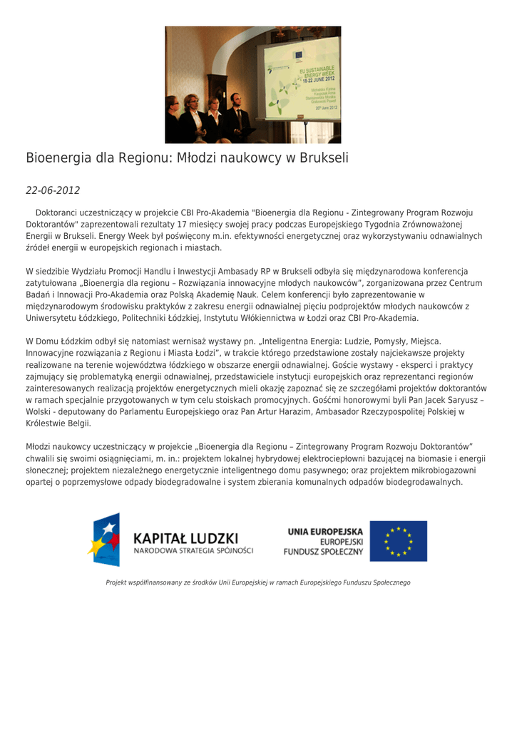 Bioenergia dla Regionu: Młodzi naukowcy w Brukseli 22-06-2012 Doktoranci uczestniczący w projekcie CBI Pro-Akademia "Bioenergia dla Regionu - Zintegrowany Program Rozwoju Doktorantów" zaprezentowali rezultaty 17 miesięcy swojej pracy podczas Europejskiego Tygodnia Zrównoważonej Energii w Brukseli. Energy Week był poświęcony m.in. efektywności energetycznej oraz wykorzystywaniu odnawialnych źródeł energii w europejskich regionach i miastach. W siedzibie Wydziału Promocji Handlu i Inwestycji Ambasady RP w Brukseli odbyła się międzynarodowa konferencja zatytułowana „Bioenergia dla regionu – Rozwiązania innowacyjne młodych naukowców”, zorganizowana przez Centrum Badań i Innowacji Pro-Akademia oraz Polską Akademię Nauk. Celem konferencji było zaprezentowanie w międzynarodowym środowisku praktyków z zakresu energii odnawialnej pięciu podprojektów młodych naukowców z Uniwersytetu Łódzkiego, Politechniki Łódzkiej, Instytutu Włókiennictwa w Łodzi oraz CBI Pro-Akademia. W Domu Łódzkim odbył się natomiast wernisaż wystawy pn. „Inteligentna Energia: Ludzie, Pomysły, Miejsca. Innowacyjne rozwiązania z Regionu i Miasta Łodzi”, w trakcie którego przedstawione zostały najciekawsze projekty realizowane na terenie województwa łódzkiego w obszarze energii odnawialnej. Goście wystawy - eksperci i praktycy zajmujący się problematyką energii odnawialnej, przedstawiciele instytucji europejskich oraz reprezentanci regionów zainteresowanych realizacją projektów energetycznych mieli okazję zapoznać się ze szczegółami projektów doktorantów w ramach specjalnie przygotowanych w tym celu stoiskach promocyjnych. Gośćmi honorowymi byli Pan Jacek Saryusz – Wolski - deputowany do Parlamentu Europejskiego oraz Pan Artur Harazim, Ambasador Rzeczypospolitej Polskiej w Królestwie Belgii. Młodzi naukowcy uczestniczący w projekcie „Bioenergia dla Regionu – Zintegrowany Program Rozwoju Doktorantów” chwalili się swoimi osiągnięciami, m. in.: projektem lokalnej hybrydowej elektrociepłowni bazującej na biomasie i energii słonecznej; projektem niezależnego energetycznie inteligentnego domu pasywnego; oraz projektem mikrobiogazowni opartej o poprzemysłowe odpady biodegradowalne i system zbierania komunalnych odpadów biodegrodawalnych. Projekt współfinansowany ze środków Unii Europejskiej w ramach Europejskiego Funduszu Społecznego Strona CBI Pro-Akademia używa ciasteczek (cookies), dzięki którym nasz serwis może działać lepiej. Zobacz
