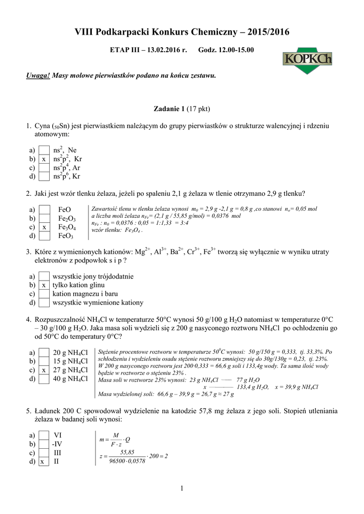VIII Podkarpacki Konkurs Chemiczny – 2015/2016 ETAP III – 13.02.2016 r. Godz. 12.00-15.00 Uwaga! Masy molowe pierwiastków podano na końcu zestawu. Zadanie 1 (17 pkt) 1. Cyna (50Sn) jest pierwiastkiem należącym do grupy pierwiastków o strukturze walencyjnej i rdzeniu atomowym: a) b) x c) d) ns2, Ne ns2p2, Kr ns2p4, Ar ns2p6, Kr 2. Jaki jest wzór tlenku żelaza, jeżeli po spaleniu 2,1 g żelaza w tlenie otrzymano 2,9 g tlenku? a) b) c) x d) FeO Fe2O3 Fe3O4 FeO3 Zawartość tlenu w tlenku żelaza wynosi m0 = 2,9 g -2,1 g = 0,8 g ,co stanowi no= 0,05 mol a liczba moli żelaza nFe= (2,1 g / 55,85 g/mol) = 0,0376 mol nFe : n0 = 0,0376 : 0,05 = 1:1,33 = 3:4 wzór tlenku: Fe3O4 . 3. Które z wymienionych kationów: Mg2+, Al3+, Ba2+, Cr3+, Fe3+ tworzą się wyłącznie w wyniku utraty elektronów z podpowłok s i p ? a) wszystkie jony trójdodatnie b) x tylko kation glinu c) kation magnezu i baru d) wszystkie wymienione kationy 4. Rozpuszczalność NH4Cl w temperaturze 50°C wynosi 50 g/100 g H2O natomiast w temperaturze 0°C – 30 g/100 g H2O. Jaka masa soli wydzieli się z 200 g nasyconego roztworu NH4Cl po ochłodzeniu go od 50°C do temperatury 0°C? a) b) c) x d) 20 g NH4Cl 15 g NH4Cl 27 g NH4Cl 40 g NH4Cl Stężenie procentowe roztworu w temperaturze 500C wynosi: 50 g/150 g = 0,333, tj. 33,3%. Po schłodzeniu i wydzieleniu osadu stężenie roztworu zmniejszy się do 30g/130g = 0,23, tj. 23%. W 200 g nasyconego roztworu jest 200∙0,333 = 66,6 g soli i 133,4g wody. Ta sama ilość wody będzie w roztworze o stężeniu 23% . Masa soli w roztworze 23% wynosi: 23 g NH4Cl 77 g H2O x 133,4 g H2O, x = 39,9 g NH4Cl Masa wydzielonej soli: 66,6 g – 39,9 g = 26,7 g ≈ 27 g 5. Ładunek 200 C spowodował wydzielenie na katodzie 57,8 mg żelaza z jego soli. Stopień utleniania żelaza w badanej soli wynosi: a) b) c) d) x VI -IV III II M Q Fz 55,85 z 200 2 96500 0,0578 m 1 6. Które z poniższych stwierdzeń jest niepoprawne? Ozon: a) jest cięższy od powietrza b) x jest trwały c) w wodzie rozpuszcza się lepiej od O2 d) w stanie gazowym jest niebieskawy, a w ciekłym – ciemnoniebieski 7. Określ typ hybrydyzacji każdego atomu węgla w związku licząc od jego lewej strony: CHO–CH2–CH2–COOH a) sp3, sp3, sp3, sp3 b) x sp2, sp3, sp3, sp2 c) sp, sp2, sp2, sp d) sp, sp3, sp3, sp 8. Podać wzór rzeczywisty węglowodoru, który w warunkach normalnych jest gazem o gęstości 2,59 g/dm3 i zawiera 82,8% C. a) x C4H10 b) C2H5 c) C3H10 d) C4H6 Szukany wzór związku: CxHy Obliczenie stosunku moli atomów: nC : nH = 82,8/12 : 17,2/1 = 6,9 / 17,2 = 1 : 2,5 = 2 : 5 Wzór elementarny (najprostszy): C2H5, ME = 29 g/mol Obliczenie masy molowej: d = m/v = M/22,4 M = 22,4 dm3/mol ∙ 2,59 g/dm3 = 58 g/mol Obliczanie wzoru rzeczywistego: n = M/ME = 58/29 = 2, stąd wzór rzeczywisty węglowodoru: C4H10 9. Do 4 probówek wlano obojętny 2% r-r manganianu(VII) potasu, a następnie wprowadzono węglowodór: a) heksan b) benzen c) x cykloheksen d) cykloheksan Mieszaninę reakcyjną intensywnie wstrząśnięto. W której probówce zaobserwowano przebieg reakcji. 10. Z etenu na skalę przemysłową można otrzymać produkty: a) x b) c) d) tlenek etylenu, aldehyd octowy, chlorek winylu chlorek winylu, etanol, chloroform aldehyd octowy, metanol, etylobenzen, chlorometan, etanol, tlenek etylenu 11. Kwas octowy należy do słabych elektrolitów. a. Napisać równanie dysocjacji kwasu: …………………………………………………………….. b. Uzupełnić poniższą tabelę: Kwasu 0,01 Stężenie, mol/dm3 niezdysocjowanych cząsteczek jonów wodorowych [H+] [CH3COOH] 0,000418 0,001320 0,098680 1 Stopień dysocjacji, % 0,42 2 pH Rozwiązanie: CH3COOH Wypełnienie tabeli CH3COO- + H+ Stopień dysocjacji: Nz 100% , Nw gdzie: Nz – liczba cząsteczek zdysocjowanych, Nw – liczba cząsteczek wprowadzonych, pH = -log[H+] Kwasu 0,01 0,1 1 Stężenie, mol/dm3 jonów wodorowych [H+] niezdysocjowanych cząsteczek [CH3COOH] 0,000418 0,009582 0,001320 0,098680 0,004200 0,995800 Stopień dysocjacj i, % 4,18 1,32 0,42 pH 3,38 2,88 2,38 po 0,2 pkt za każdą poprawną odpowiedź (max 2 pkt) 12. Odwracalna reakcja zachodzi zgodnie z równaniem A2 B2 2AB. 3 3 Zmieszano 500 cm 4 mol/dm roztworu substratu A2, oraz 500 cm3 6 mol/dm3 roztworu substratu B2 i ogrzano do 50oC. W stanie równowagi otrzymano 1,5 mola produktu AB. Stała stężeniowa równowagi reakcji wynosi: a) b) c) x d) 0,2 0,6 0,8 1,5 Rozwiązanie : Zgodnie z równaniem reakcji A2 B2 K 2AB stała równowagi ma postać: [AB]2 [A 2 ] [B2 ] 1pkt Z równania stechiometrycznego wynika, że 1mol A2 reaguje z 1molem B2 i powstaje 2 mole AB. Liczba moli substratów w mieszaninie reakcyjnej wynosi: n A 2 0,5 dm3 4 mol 2 mol dm3 n B2 0,5 dm3 6 mol 3 mol dm3 2pkt Liczba moli reagentów w stanie równowagi: A2 B2 Liczba moli początkowa 2 3 Liczba moli produktu Liczba moli przereagowanego substratu 0,75 0,75 Liczba moli w stanie równowagi 2 0,75 = 1,25 3 0,75 = 2,25 Ponieważ objętość mieszaniny reakcyjnej wynosi 1 dm3 stężenia reagentów w stanie równowagi wynoszą: [A2] = 1,25 mol/dm3 [B2] = 2,25 mol/dm3 AB 0 1,5 1,5 [AB] = 1,5 mol/dm3 Wartość stałej równowagi wynosi: 2 mol 1,5 3 [AB] dm K 0,8 [A 2 ] [B2 ] 1,25 mol 2,25 mol 3 3 dm dm 2 2 pkt Łącznie zadanie 1: 17 pkt 3 Zadanie 2 (15 pkt) 500 cm3 40% kwasu siarkowego(VI) o gęstości 1,303 g/cm3 poddano elektrolizie na elektrodach platynowych. Elektrolizę prowadzono do momentu aż łączna objętość wydzielonych produktów gazowych wyniosła 22,7 dm3 w temperaturze 20oC pod ciśnieniem 1007 hPa. 1. Zapisać równania reakcji elektrodowych, zachodzących podczas elektrolizy. 2. Obliczyć objętości wydzielonych produktów gazowych w warunkach normalnych. 3. Obliczyć teoretyczny ładunek, który przepłynął podczas elektrolizy. 4. Zakładając 70% wydajność procesu i wartość natężenia prądu elektrolizy 5 A, obliczyć czas jej trwania. Wynik podaj a) w sekundach, b) jako liczbę godz