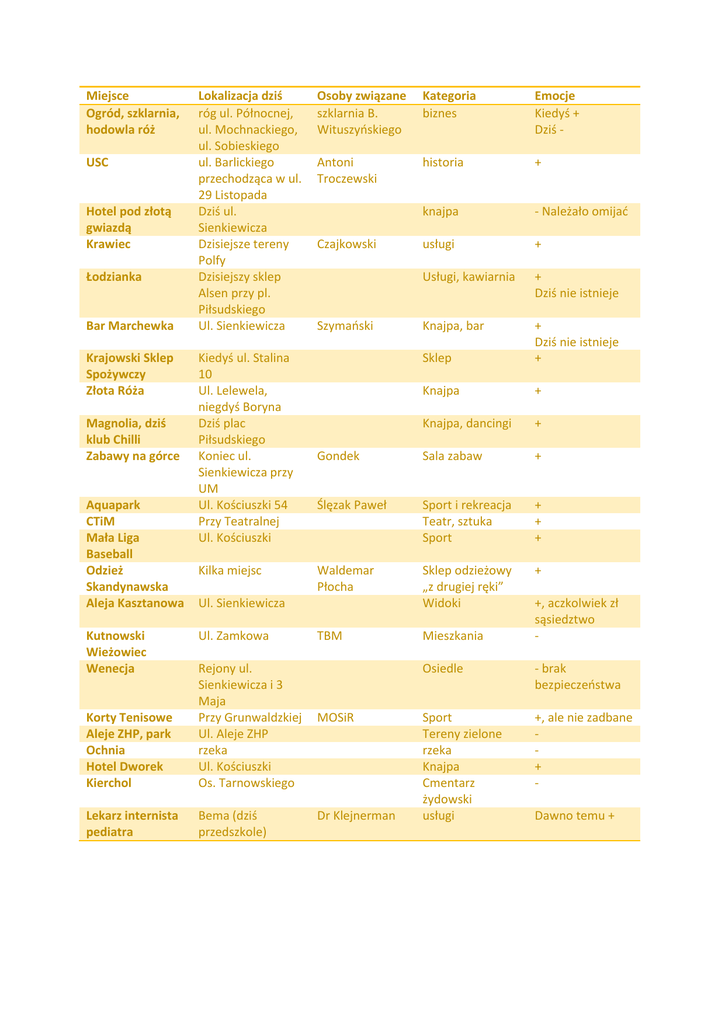 Miejsce Ogród, szklarnia, hodowla róż USC Hotel pod złotą gwiazdą Krawiec Łodzianka Bar Marchewka Krajowski Sklep Spożywczy Złota Róża Magnolia, dziś klub Chilli Zabawy na górce Aquapark CTiM Mała Liga Baseball Odzież Skandynawska Aleja Kasztanowa Kutnowski Wieżowiec Wenecja Lokalizacja dziś róg ul. Północnej, ul. Mochnackiego, ul. Sobieskiego ul. Barlickiego przechodząca w ul. 29 Listopada Dziś ul. Sienkiewicza Dzisiejsze tereny Polfy Dzisiejszy sklep Alsen przy pl. Piłsudskiego Ul. Sienkiewicza Kiedyś ul. Stalina 10 Ul. Lelewela, niegdyś Boryna Dziś plac Piłsudskiego Koniec ul. Sienkiewicza przy UM Ul. Kościuszki 54 Przy Teatralnej Ul. Kościuszki Kilka miejsc Osoby związane szklarnia B. Wituszyńskiego Kategoria biznes Emocje Kiedyś + Dziś - Antoni Troczewski historia + knajpa - Należało omijać usługi + Usługi, kawiarnia + Dziś nie istnieje Knajpa, bar Sklep + Dziś nie istnieje + Knajpa + Knajpa, dancingi + Gondek Sala zabaw + Ślęzak Paweł Sport i rekreacja Teatr, sztuka Sport + + + Waldemar Płocha Sklep odzieżowy „z drugiej ręki” Widoki + Czajkowski Szymański Ul. Sienkiewicza Ul. Zamkowa Korty Tenisowe Aleje ZHP, park Ochnia Hotel Dworek Kierchol Rejony ul. Sienkiewicza i 3 Maja Przy Grunwaldzkiej Ul. Aleje ZHP rzeka Ul. Kościuszki Os. Tarnowskiego Lekarz internista pediatra Bema (dziś przedszkole) TBM MOSiR Dr Klejnerman Mieszkania +, aczkolwiek zł sąsiedztwo - Osiedle - brak bezpieczeństwa Sport Tereny zielone rzeka Knajpa Cmentarz żydowski usługi +, ale nie zadbane + Dawno temu +