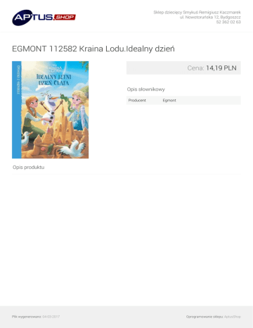 Sklep dziecięcy Smykuś Remigiusz Kaczmarek ul. Nowotoruńska 12, Bydgoszcz 52 362 02 63 EGMONT 112582 Kraina Lodu.Idealny dzień Cena: 14,19 PLN Opis słownikowy Producent Egmont Opis produktu Plik wygenerowano: 04-03-2017 Powered by TCPDF (www.tcpdf.org) Oprogramowanie sklepu: AptusShop