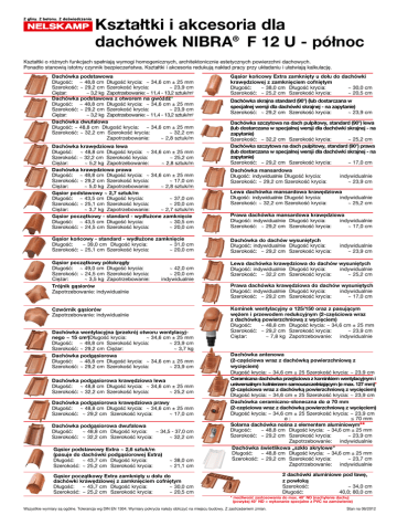 Kształtki i akcesoria dla dachówek NIBRA® F 12 U - północ Kształtki o różnych funkcjach spełniają wymogi homogenicznych, architektonicznie estetycznych powierzchni dachowych. Ponadto stanowią istotny czynnik bezpieczeństwa. Kształtki i akcesoria redukują nakład pracy przy układaniu i ułatwiają kalkulację. Dachówka podstawowa Długość: ~ 48,8 cm Długość krycia: ~ 34,6 cm ± 25 mm Szerokość: ~ 29,2 cm Szerokość krycia: ~ 23,9 cm Ciężar: ~ 3,2 kg Zapotrzebowanie:~ 11,4 - 13,2 sztuk/m2 Dachówka podstawowa z otworem na gwóźdź* Długość: ~ 48,8 cm Długość krycia: ~ 34,6 cm ± 25 mm Szerokość: ~ 29,2 cm Szerokość krycia: ~ 23,9 cm Ciężar: ~ 3,2 kg Zapotrzebowanie:~ 11,4 - 13,2 sztuk/m2 Dachówka dwufalowa Długość: ~ 48,8 cm Długość krycia: ~ 34,6 cm ± 25 mm Szerokość: ~ 32,2 cm Szerokość krycia: ~ 32,2 cm Zapotrzebowanie: ~ 2,8 sztuk/m Dachówka krawędziowa lewa Długość: ~ 48,8 cm Długość krycia: ~ 34,6 cm ± 25 mm Szerokość: ~ 32,2 cm Szerokość krycia: ~ 25,2 cm Ciężar: ~ 5,2 kg Zapotrzebowanie: ~ 2,8 sztuk/m Dachówka krawędziowa prawa Długość: ~ 48,8 cm Długość krycia: ~ 34,6 cm ± 25 mm Szerokość: ~ 29,2 cm Szerokość krycia: ~ 17,0 cm Ciężar: ~ 5,0 kg Zapotrzebowanie: ~ 2,8 sztuk/m Gąsior podstawowy ~ 2,7 sztuk/m Długość: ~ 43,5 cm Długość krycia: ~ 37,0 cm Szerokość: ~ 25,1 cm Szerokość krycia: ~ 20,0 cm Ciężar: ~ 3,7 kg Zapotrzebowanie: ~ 2,7 sztuk/m Gąsior początkowy - standard - wydłużone zamknięcie Długość: ~ 43,5 cm Długość krycia: ~ 30,5 cm Szerokość: ~ 24,5 cm Szerokość krycia: ~ 20,0 cm Gąsior końcowy Extra zamknięty u dołu do dachówki krawędziowej z zamknięciem cofniętym Długość: ~ 38,0 cm Długość krycia: ~ 30,0 cm Szerokość: ~ 25,2 cm Szerokość krycia: ~ 20,5 cm Dachówka skrajna standard (90°) (lub dostarczana w specjalnej wersji dla dachówki skrajnej - na zapytanie) Szerokość: ~ 29,2 cm Szerokość krycia: ~ 23,9 cm Dachówka szczytowa na dach pulpitowy, standard (90°) lewa (lub dostarczana w specjalnej wersji dla dachówki skrajnej - na zapytanie) Szerokość: ~ 32,2 cm Szerokość krycia: ~ 25,2 cm Dachówka szczytowa na dach pulpitowy, standard (90°) prawa (lub dostarczana w specjalnej wersji dla dachówki skrajnej - na zapytanie) Szerokość: ~ 29,2 cm Szerokość krycia: ~ 17,0 cm Dachówka mansardowa Długość: indywidualnieDługość krycia: Szerokość: ~ 29,2 cm Szerokość krycia: indywidualnie ~ 23,9 cm Lewa dachówka mansardowa krawędziowa Długość: indywidualnieDługość krycia: indywidualnie Szerokość: ~ 32,2 cm Szerokość krycia: ~ 25,2 cm Prawa dachówka mansardowa krawędziowa Długość: indywidualnie Długość krycia: indywidualnie Szerokość: ~ 29,2 cm Szerokość krycia: ~ 17,0 cm Gąsior końcowy - standard - wydłużone zamknięcie Długość: ~ 39,0 cm Długość krycia: ~ 31,0 cm Szerokość: ~ 25,1 cm Szerokość krycia: ~ 20,0 cm Dachówka do dachów wysuniętych Długość: indywidualnie Długość krycia: indywidualnie Szerokość: ~ 29,2 cm Szerokość krycia: ~ 23,9 cm Gąsior początkowy półokrągły Długość: ~ 49,0 cm Długość krycia: Szerokość: ~ 24,5 cm Szerokość krycia: Ciężar: ~ 3,5 kg Zapotrzebowanie: Trójnik gąsiorów Zapotrzebowanie: indywidualnie Lewa dachówka krawędziowa do dachów wysuniętych Długość: indywidualnie Długość krycia: indywidualnie Szerokość: ~ 32,2 cm Szerokość krycia: ~ 25,2 cm ~ 42,0 cm ~ 20,0 cm indywidualnie Prawa dachówka krawędziowa do dachów wysuniętych Długość: indywidualnie Długość krycia: indywidualnie Szerokość: ~ 29,2 cm Szerokość krycia: ~ 17,0 cm Czwórnik gąsiorów Zapotrzebowanie: indywidualnie Dachówka wentylacyjna (przekrój otworu wentylacyjnego ~ 15 cm2)Długość krycia: ~ 34,6 cm ± 25 mm Długość: ~ 48,8 cm Szerokość krycia: ~ 23,9 cm Szerokość: ~ 29,2 cm Ciężar: ~ 3,7 kg Dachówka podgąsiorowa Długość: ~ 48,8 cm Długość krycia: ~ 34,6 cm ± 25 mm Szerokość: ~ 29,2 cm Szerokość krycia: ~ 23,9 cm Dachówka podgąsiorowa krawędziowa lewa Długość: ~ 48,8 cm Długość krycia: ~ 34,6 cm ± 25 mm Szerokość: ~ 32,2 cm Szerokość krycia: ~ 25,2 cm Dachówka podgąsiorowa krawędziowa prawy Długość: ~ 48,8 cm Długość krycia: ~ 34,6 cm ± 25 mm Szerokość: ~ 29,2 cm Szerokość krycia: ~ 17,0 cm Dachówka podgąsiorowa dwufalowa Długość: ~ 48,8 cm Długość krycia: ~ 34,5 - 37,0 cm Szerokość: ~ 32,2 cm Szerokość krycia: ~ 32,2 cm Gąsior podstawowy Extra ~ 2,6 sztuk/m (pasuje do dachówki podgąsiorowej Extra) Długość: ~ 43,7 cm Długość krycia: Szerokość: ~ 25,2 cm Szerokość krycia: ~ 38,0 cm ~ 21,1 cm Gąsior początkowy Extra zamknięty u dołu do dachówki krawędziowej z zamknięciem cofniętym Długość: ~ 43,7 cm Długość krycia: ~ 30,0 cm Szerokość: ~ 25,2 cm Szerokość krycia: ~ 20,5 cm Kominek wentylacyjny ø 125/150 oraz z pasującym wężem i przewodem redukcyjnym (2-częściowa wraz z dachówką powierzchniową z wycięciem) Długość: ~ 48,8 cm Długość krycia: ~ 34,6 cm ± 25 mm Szerokość: ~ 29,2 cm Szerokość krycia: ~ 23,9 cm Ciężar: ~ 7,8 kg Zapotrzebowanie: indywidualnie Dachówka antenowa (2-częściowa wraz z dachówką powierzchniową z wycięciem) Długość krycia: ~ 34,6 cm ± 25 Szerokość krycia: ~ 23,9 cm Ceramiczna dachówka przejściowa z kominkiem wentylacyjnym i uniwersalnym kołnierzem samouszczelniającym (ø max. 127 mm)* (2-częściowa wraz z dachówką powierzchniową z wycięciem) Długość krycia: ~ 34,6 cm ± 25 Szerokość krycia: ~ 23,9 cm Dachówka ceramiczno-słoneczna do ø 70 mm (2-częściowa wraz z dachówką powierzchniową z wycięciem) Długość krycia: ~ 34,6 cm ± 25 Szerokość krycia: ~ 23,9 cm ø : ≤ 70 mm Solarna dachówka nośna z elementem aluminiowym** Długość: ~ 48,8 cm Długość krycia: ~ 34,6 cm ± 25 mm Szerokość: ~ 29,2 cm Szerokość krycia: ~ 23,9 cm Zapotrzebowanie: indywidualnie Da