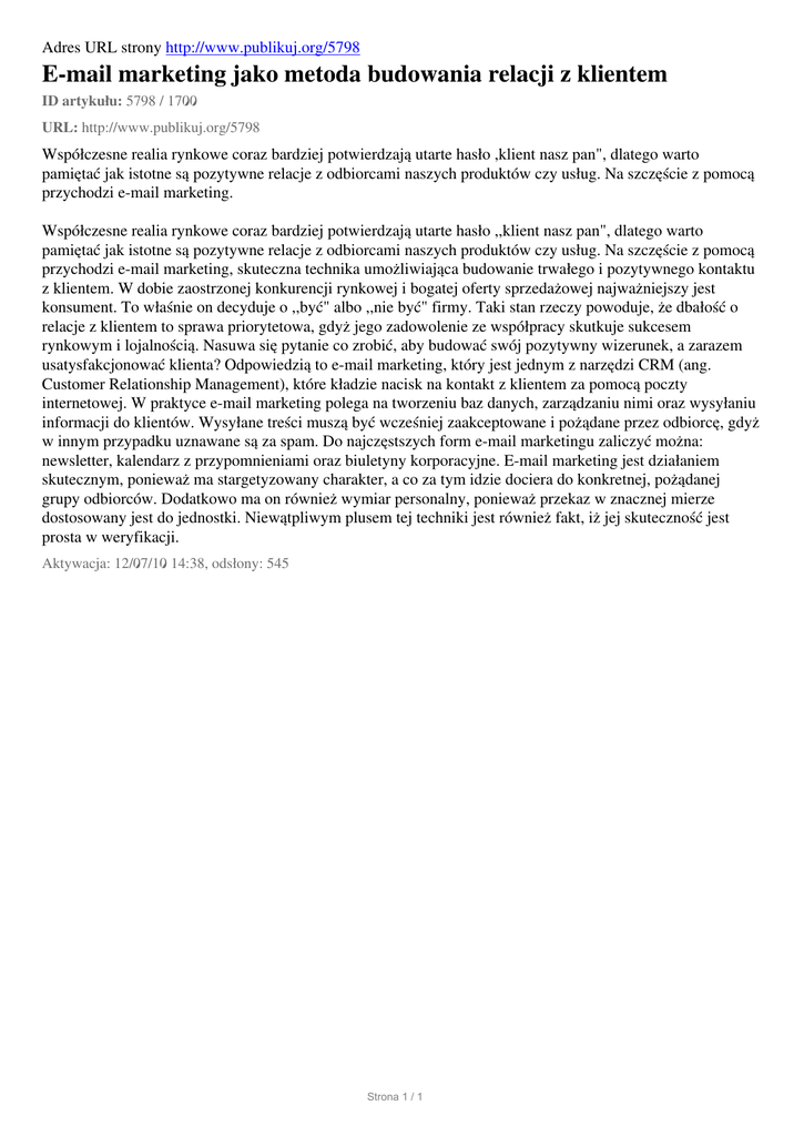 Adres URL strony http://www.publikuj.org/5798 E-mail marketing jako metoda budowania relacji z klientem ID artykułu: 5798 / 1700 URL: http://www.publikuj.org/5798 Współczesne realia rynkowe coraz bardziej potwierdzają utarte hasło ,klient nasz pan", dlatego warto pamiętać jak istotne są pozytywne relacje z odbiorcami naszych produktów czy usług. Na szczęście z pomocą przychodzi e-mail marketing. Współczesne realia rynkowe coraz bardziej potwierdzają utarte hasło ,,klient nasz pan", dlatego warto pamiętać jak istotne są pozytywne relacje z odbiorcami naszych produktów czy usług. Na szczęście z pomocą przychodzi e-mail marketing, skuteczna technika umożliwiająca budowanie trwałego i pozytywnego kontaktu z klientem. W dobie zaostrzonej konkurencji rynkowej i bogatej oferty sprzedażowej najważniejszy jest konsument. To właśnie on decyduje o ,,być" albo ,,nie być" firmy. Taki stan rzeczy powoduje, że dbałość o relacje z klientem to sprawa priorytetowa, gdyż jego zadowolenie ze współpracy skutkuje sukcesem rynkowym i lojalnością. Nasuwa się pytanie co zrobić, aby budować swój pozytywny wizerunek, a zarazem usatysfakcjonować klienta? Odpowiedzią to e-mail marketing, który jest jednym z narzędzi CRM (ang. Customer Relationship Management), które kładzie nacisk na kontakt z klientem za pomocą poczty internetowej. W praktyce e-mail marketing polega na tworzeniu baz danych, zarządzaniu nimi oraz wysyłaniu informacji do klientów. Wysyłane treści muszą być wcześniej zaakceptowane i pożądane przez odbiorcę, gdyż w innym przypadku uznawane są za spam. Do najczęstszych form e-mail marketingu zaliczyć można: newsletter, kalendarz z przypomnieniami oraz biuletyny korporacyjne. E-mail marketing jest działaniem skutecznym, ponieważ ma stargetyzowany charakter, a co za tym idzie dociera do konkretnej, pożądanej grupy odbiorców. Dodatkowo ma on również wymiar personalny, ponieważ przekaz w znacznej mierze dostosowany jest do jednostki. Niewątpliwym plusem tej techniki jest również fakt, iż jej skuteczność jest prosta w weryfikacji. Aktywacja: 12/07/10 14:38, odsłony: 545 Strona 1 / 1