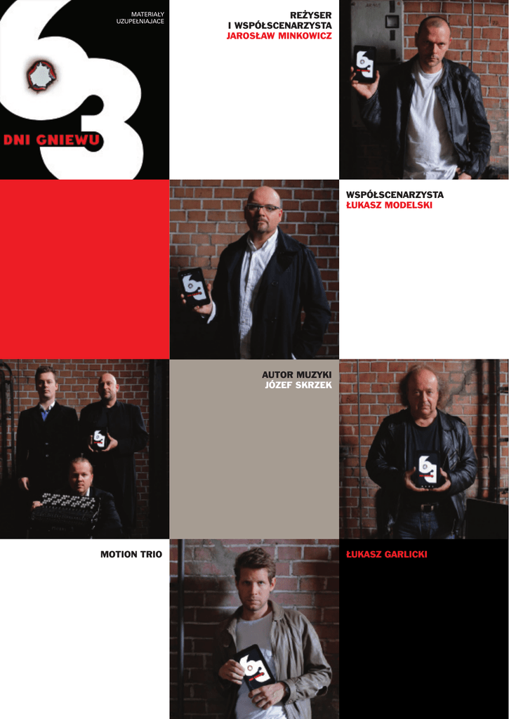 MATERIA¸Y UZUPE¸NIAJACE RE˚YSER I WSPÓ¸SCENARZYSTA JAROS¸AW MINKOWICZ WSPÓ¸SCENARZYSTA ¸UKASZ MODELSKI AUTOR MUZYKI JÓZEF SKRZEK MOTION TRIO ¸UKASZ GARLICKI OPIS SPEKTAKLU 63 DNI GNIEWU SCENARIUSZ I RE˚YSERIA „63 Dni Gniewu” - to spektakl muzyczny przygotowywany z okazji szeÊçdziesiàtej siódmej rocznicy Powstania Warszawskiego. Inny od dotychczasowych przedsi´wzi´ç z kilku powodów: - Po pierwsze forma narracji. Twórcy spektaklu zdecydowali si´ opowiadaç histori´ Powstania wstecz. Ta opowieÊç zaczyna si´ trzeciego paêdziernika 1944 roku, kilka godzin po podpisaniu kapitulacji ÂródmieÊcia. Ka˝dego z trojga bohaterów poznajemy w chwili jego Êmierci. Potem, cofajàc si´ w czasie us∏yszymy o czym ka˝dy z nich marzy∏, Êni∏, za czym t´skni∏. Nasza opowieÊç skupi si´ na codziennoÊci ˝ycia w Powstaniu – tylko poprzez codziennoÊç jesteÊmy dziÊ w stanie zrozumieç – choç w pewnym stopniu – jak wyglàda∏o ˝ycie w powstaƒczej Warszawie. W rol´ „powstaƒców” wcielà si´ wyjàtkowo zdolni polscy aktorzy. Nie zamierzamy ich przebieraç w kostium z epoki – wr´cz przeciwnie. Oryginale, powstaƒcze teksty pozwolimy im czytaç z tabletów. - Po drugie struktura. Ten wieczór b´dzie mia∏ kameralnà, introwertycznà form´ narzuconà poprzez klasycznà form´ tragedii greckiej. Oto mamy troje bohaterów i chór. Bohaterów poznajemy poprzez oryginalne wspomnienia, zapiski i korespondencj´ z Powstania. ˚adne s∏owo nie zostanie dopisane ponad to, co napisali sami Powstaƒcy. Chór b´dzie komentatorem, a czasem sonorystycznym t∏em dla zdarzeƒ. Rol´ chóru pragniemy powierzyç dwunastce m∏odych ludzi tworzàcych Voice Factory. To formacja wokalna prowadzona przez wspó∏tworzàcego przed laty legendarny Novi Singers – Waldemara Parzyƒskiego. Voice Factory brzmià nad wyraz wspó∏czeÊnie. DoÊwiadczenie i wra˝liwoÊç muzyczna Parzyƒskiego dodajà tej nowoczesnoÊci szlachetnych odcieni muzycznych z lat ÊwietnoÊci Novi Singers. - po trzecie muzyka. Kanwà muzycznà naszego spektaklu b´dà kompozycje specjalnie na t´ okazj´ napisane przez Józefa Skrzeka. Poza Józefem Skrzekiem w spektaklu udzia∏ wezmà Atom String Quartet i Motion Trio. Re˝yserem i scenarzystà spektaklu jest Jaros∏aw Minkowicz, a wspó∏scenarzystà ¸ukasz Modelski. Jaros∏aw Minkowicz to re˝yser teatralny i telewizyjny. Studiowa∏ w warszawskiej i petersburskiej Akademii Teatralnej. Debiutowa∏ na scenie teatru Hybrydy spektaklem „Wyspa” z Tomaszem Saprykiem i S∏awomirem Packiem w rolach g∏ównych. Re˝yserowa∏ najwi´ksze przedsi´wzi´cia telewizyjne dla TVP (festiwal w Sopocie i koncerty festiwalowe w Opolu). Mi´dzynarodowy rozg∏os przynios∏a mu realizacja spektaklu muzycznego „Siedem Bram Jerozolimy” którego scenariusz napisa∏ do muzyki Krzysztofa Pendereckiego. Spektakl z animacjami w re˝yserii Tomasza Bagiƒskiego i scenografià Borysa Kudlicki by∏ podstawà filmu muzycznego nagrodzonego na wielu mi´dzynarodowych festiwalach, nominowanego do najwa˝niejszych nagród telewizyjnych: Z∏otej Ró˝y i EMMY. Wspó∏pracowa∏ z W∏odzimierzem Pawlikiem (spektakl muzyczno-baletowy „Chopin” z Ulà Dudziak, czy Agà Zaryan, ale równie˝ ze wspominanym Krzysztofem Pendereckim, czy Walerym Giergiewem (koncert „Orchestra for the Peace” dla uczczenia siedemdziesiàtej rocznicy wybuchu II Wojny Âwiatowej). W swoich pracach najch´tniej si´ga do wspó∏czesnej muzyki symfonicznej i jazzu. ¸UKASZ GARLICKI Absolwent Akademii Teatralnej w Warszawie. Debiutowa∏ w roku 1998 w spektaklu Teatru Telewizji w re˝yserii Stanis∏awa J´dryki pt. "¸ukaszek", w Teatrze Ateneum w "OpowieÊci Lasku Wiedeƒskiego" rolà Ericha w spektaklu Agnieszki Gliƒskiej oraz g∏ównà rolà Marcina Borowicza w serialu Paw∏a Komorowskiego "Syzyfowe prace". W roku 1999 wystàpi∏ w spektaklu dyplomowym "Dwaj Panowie z Werony", w sztuce Teatru Powszechnego z Warszawy w re˝yserii W∏adys∏awa Kowalskiego i Agnieszki Gliƒskiej "Kaleka z Inishmaan" (rola Kaleki), oraz w dwóch spektaklach Teatru Telewizji - "Wypadek" (re˝. Stanis∏aw J´dryka) oraz "Lato w Nohant" (re˝. Agnieszka Gliƒska). W roku 2000 ¸ukasz Garlicki zagra∏ rol´ Miedwiedienki w przedstawieniu dyplomowym "Mewa" w re˝yserii Agnieszki Gliƒskiej oraz postaç m∏odego Fàfary w spektaklu Teatru Telewizji "Wyrok na Franciszka K∏osa" w re˝yserii Andrzeja Wajdy. W 2008 roku otrzyma∏ Nagrod´ Aktorskà dla najlepszego aktora festiwalu za rol´ w filmie „Lekcje pana Kuki” w re˝. Dariusza Gajewskiego na I Festiwal The East and the West w Orenburgu. Jeden z za∏o˝ycieli Projektu Warszawiak. ¸ukasz Modelski, wspó∏scenarzysta spektaklu muzycznego ’63 dni gniewu”. Na co dzieƒ zast´pca redaktora naczelnego "Twojego Stylu". Obecnie pracuje nad ksià˝kà o losach kobiet, które prze˝y∏y Powstanie Warszawskie. KINGA PREIS Absolwentka wroc∏awskiej Paƒstwowej Wy˝szej Szko∏y Teatralnej. Od poczàtku swojej kariery zwiàzana z Teatrem Polskim we Wroc∏awiu. Laureatka konkursu interpretacji piosenki na XX Przeglàdzie Piosenki Aktorskiej we Wroc∏awiu (1999) za wykonanie utworu „Przekleƒstwo Millheaven” Nicka Cave’a. Wielokrotnie doceniana za wspania∏e kreacje aktorskie. W 2002 roku czytelnicy miesi´cznika FILM przyznali jej Z∏otà Kaczk´ za najlepszà rol´ pierwszoplanowà 2001 roku – film „Cisza” Micha∏a Rosy. Trzykrotna laureatka Polskiej Nagrody Filmowej ORZE¸ za role w filmach: „Cisza” Micha∏a Rosy (2002), „Wtorek” Witolda Adamka (2003), „Komornik” Feliksa Falka (2006), za który otrzyma∏a równie˝ nagrod´ im. Zbyszka Cybulskiego (2006). Stworzone przez nià wyraziste, psychologicznie pog∏´bione portrety wspó∏czesnych kobiet m.in. w filmie „Poniedzia∏ek” (1998), „Komornik” (2005) doceniono równie˝ na Festiwalu Polskich Filmów Fabularnych. Dwukrotna laureatka Festi