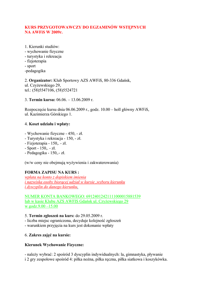 KURS PRZYGOTOWAWCZY DO EGZAMINÓW WSTĘPNYCH NA AWFiS W 2009r. 1. Kierunki studiów: - wychowanie fizyczne - turystyka i rekreacja - fizjoterapia - sport -pedagogika 2. Organizator: Klub Sportowy AZS AWFiS, 80-336 Gdańsk, ul. Czyżewskiego 29, tel.: (58)5547106, (58)5524721 3. Termin kursu: 06.06. – 13.06.2009 r. Rozpoczęcie kursu dnia 06.06.2009 r., godz. 10.00 – holl główny AWFiS, ul. Kazimierza Górskiego 1. 4. Koszt udziału i wpłaty: - Wychowanie fizyczne - 450, - zł. - Turystyka i rekreacja - 150, - zł. - Fizjoterapia - 150,. - zł. - Sport - 150,. - zł. - Pedagogika - 150,.- zł. (w/w ceny nie obejmują wyżywienia i zakwaterowania) FORMA ZAPISU NA KURS : wpłata na konto z dopiskiem imienia i nazwiska osoby biorącej udział w kursie ,wyboru kierunku i dyscyplin do danego kierunku. NUMER KONTA BANKOWEGO: 69124012421111000015881539 lub w kasie Klubu AZS AWFIS Gdańsk ul. Czyżewskiego 29 w godz.9.00 –15.00 5. Termin zgłoszeń na kurs: do 29.05.2009 r. - liczba miejsc ograniczona, decyduje kolejność zgłoszeń - warunkiem przyjęcia na kurs jest dokonanie wpłaty 6. Zakres zajęć na kursie: Kierunek Wychowanie Fizyczne: - należy wybrać: 2 spośród 3 dyscyplin indywidualnych: la, gimnastyka, pływanie i 2 gry zespołowe spośród 4: piłka nożna, piłka ręczna, piłka siatkowa i koszykówka. Kierunek Turystyka i Rekreacja: - należy wybrać: 1 spośród 3 dyscyplin indywidualnych: la, gimnastyka, pływanie i 1 grę zespołową spośród 4: piłka nożna, piłka ręczna, piłka siatkowa i koszykówka. Kierunek Fizjoterapia: - kurs obejmuje zajęcia z pływania Kierunek Sport: - kurs obejmuje: przygotowanie do testu Cooper’a, biegu ze zmianą kierunku po kopercie 3 x 5 m., podciąganie na drążku i bieg na 50 m. Kierunek Pedagogika*: *Nabór przeprowadzony będzie pod warunkiem uzyskania przez Uczelnię zgody Ministra Nauki i Szkolnictwa Wyższego na prowadzenie kierunku. - należy wybrać: 1 spośród 3 dyscyplin indywidualnych: la, gimnastyka, pływanie i 1 grę zespołową spośród 4: piłka nożna, piłka ręczna, piłka siatkowa i koszykówka. 6. Informacja dodatkowa: W KS AWFiS Gdańsk istnieje możliwość kontynuowania kariery sportowej w dyscyplinach: gimnastyka sportowa mężczyzn, judo, la, pływanie, szermierka, rugby, tenis stołowy, wioślarstwo, żeglarstwo, piłka ręczna. 7. UWAGA KOŃCOWA: Wybrane dyscypliny nie dotyczą późniejszego wyboru na egzaminie.