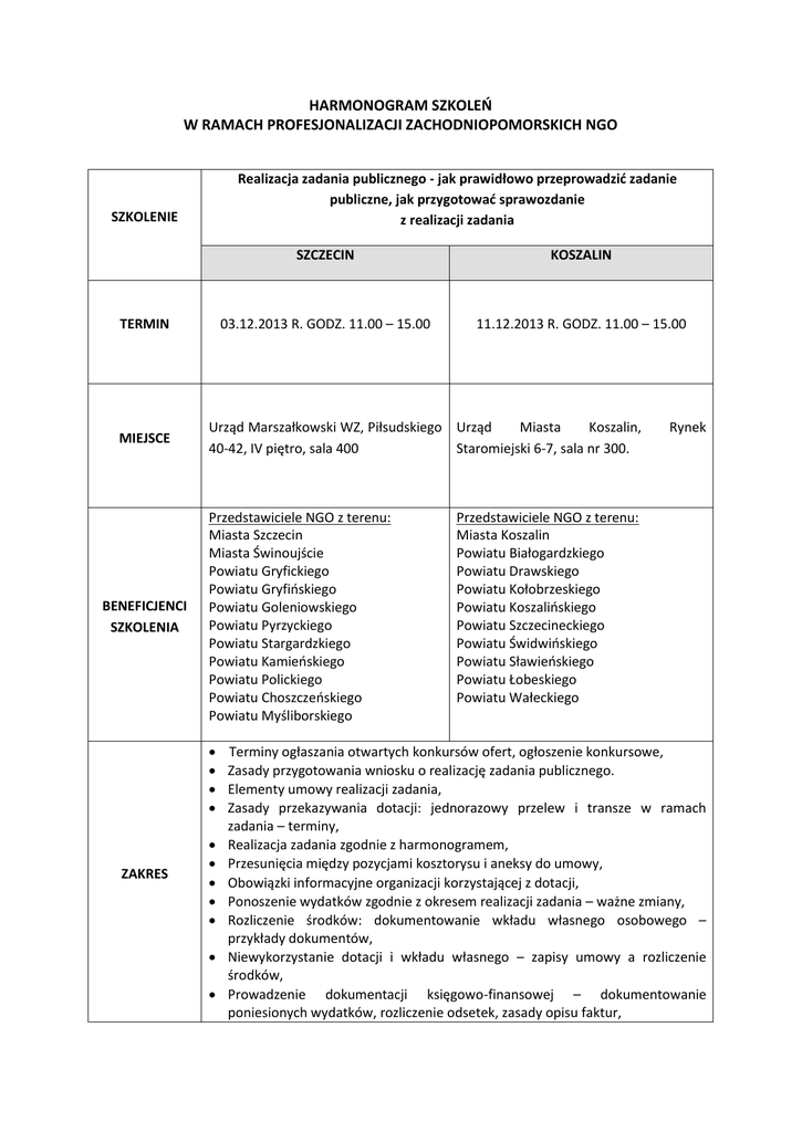 HARMONOGRAM SZKOLEŃ W RAMACH PROFESJONALIZACJI ZACHODNIOPOMORSKICH NGO Realizacja zadania publicznego - jak prawidłowo przeprowadzić zadanie publiczne, jak przygotować sprawozdanie z realizacji zadania SZKOLENIE TERMIN MIEJSCE BENEFICJENCI SZKOLENIA KOSZALIN 03.12.2013 R. GODZ. 11.00 – 15.00 11.12.2013 R. GODZ. 11.00 – 15.00 Urząd Marszałkowski WZ, Piłsudskiego Urząd Miasta Koszalin, 40-42, IV piętro, sala 400 Staromiejski 6-7, sala nr 300. Przedstawiciele NGO z terenu: Miasta Szczecin Miasta Świnoujście Powiatu Gryfickiego Powiatu Gryfińskiego Powiatu Goleniowskiego Powiatu Pyrzyckiego Powiatu Stargardzkiego Powiatu Kamieńskiego Powiatu Polickiego Powiatu Choszczeńskiego Powiatu Myśliborskiego ZAKRES SZCZECIN Rynek Przedstawiciele NGO z terenu: Miasta Koszalin Powiatu Białogardzkiego Powiatu Drawskiego Powiatu Kołobrzeskiego Powiatu Koszalińskiego Powiatu Szczecineckiego Powiatu Świdwińskiego Powiatu Sławieńskiego Powiatu Łobeskiego Powiatu Wałeckiego Terminy ogłaszania otwartych konkursów ofert, ogłoszenie konkursowe, Zasady przygotowania wniosku o realizację zadania publicznego. Elementy umowy realizacji zadania, Zasady przekazywania dotacji: jednorazowy przelew i transze w ramach zadania – terminy, Realizacja zadania zgodnie z harmonogramem, Przesunięcia między pozycjami kosztorysu i aneksy do umowy, Obowiązki informacyjne organizacji korzystającej z dotacji, Ponoszenie wydatków zgodnie z okresem realizacji zadania – ważne zmiany, Rozliczenie środków: dokumentowanie wkładu własnego osobowego – przykłady dokumentów, Niewykorzystanie dotacji i wkładu własnego – zapisy umowy a rozliczenie środków, Prowadzenie dokumentacji księgowo-finansowej – dokumentowanie poniesionych wydatków, rozliczenie odsetek, zasady opisu faktur, W jakich przypadkach należy rozwiązać umowę – konsekwencje dla organizacji realizującej zadanie, Sprawozdanie z realizacji zadania publicznego – rozliczenie środków, Kontrola realizacji zadania publicznego -terminy, kto przeprowadza kontrole, zakres kontroli, Małe granty, Nowe rozporządzenie Ministra Pracy i Polityki Społecznej w sprawie wzoru oferty, ramowego wzoru umowy i wzoru sprawozdania z realizacji zadania publicznego.