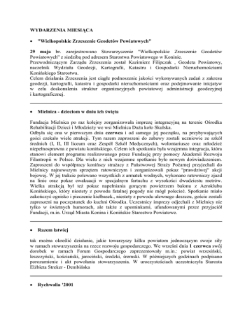 WYDARZENIA MIESIĄCA "Wielkopolskie Zrzeszenie Geodetów Powiatowych" 29 maja br. zarejestrowano Stowarzyszenie "Wielkopolskie Zrzeszenie Geodetów Powiatowych" z siedzibą pod adresem Starostwa Powiatowego w Koninie. Przewodniczącym Zarządu Zrzeszenia został Kazimierz Filipczak , Geodeta Powiatowy, naczelnik Wydziału Geodezji, Kartografii, Katastru i Gospodarki Nieruchomościami Konińskiego Starostwa. Celem działania Zrzeszenia jest ciągłe podnoszenie jakości wykonywanych zadań z zakresu geodezji, kartografii, katastru i gospodarki nieruchomościami oraz podejmowanie inicjatyw w celu doskonalenia struktur organizacyjnych powiatowej administracji geodezyjnej i kartograficznej. Mielnica - dzieciom w dniu ich święta Fundacja Mielnica po raz kolejny zorganizowała imprezę integracyjną na terenie Ośrodka Rehabilitacji Dzieci i Młodzieży we wsi Mielnica Duża koło Skulska. Odbyła się ona w pierwszym dniu czerwca i od samego jej początku, na przybywających gości czekało wiele atrakcji. Tym razem zaproszeni do zabawy zostali uczniowie ze szkół średnich (I, II, III liceum oraz Zespół Szkół Medycznych), wolontariusze oraz młodzież niepełnosprawna z powiatu konińskiego. Celem ich spotkania była wzajemna integracja, która stanowi element programu realizowanego przez Fundację przy pomocy Akademii Rozwoju Filantropii w Polsce. Dla wielu z nich wzajemne spotkanie było nowym doświadczeniem. Zaproszeni do współpracy konińscy strażacy z Państwowej Straży Pożarnej przyjechali do Mielnicy najnowszym sprzętem ratowniczym i zorganizowali pokaz "prawdziwej" akcji bojowej. W jej trakcie polewano wszystkich z armatek wodnych, wykonano ratowniczy zjazd na linie oraz pokaz ewakuacji w specjalnym fartuchu z wysokości dwudziestu metrów. Wielka atrakcją był też pokaz napełniania gorącym powietrzem balonu z Aeroklubu Konińskiego, który niestety z powodu fatalnej pogody nie mógł polecieć. Spotkanie miało zakończyć ognisko i pieczenie kiełbasek., niestety z powodu ulewnego deszczu, goście zostali zaproszeni na poczęstunek do kuchni Ośrodka. Uczestnicy imprezy odjechali z Mielnicy nie tylko w świetnych humorach, ale także z upominkami, ufundowanymi przez przyjaciół Fundacji, m.in. Urząd Miasta Konina i Konińskie Starostwo Powiatowe. Razem łatwiej tak można określić działanie, jakie towarzyszy kilku powiatom jednoczącym swoje siły w ramach stowarzyszenia na rzecz rozwoju gospodarczego. We wrześni dnia 1 czerwca swój dorobek w ramach Forum Gospodarczego zaprezentowały m.in.: powiat wrzesiński, leszczyński, kościański, jarociński, średzki, śremski. W późniejszych godzinach podpisano porozumienie i akt powołania stowarzyszenia. W uroczystościach uczestniczyła Starosta Elżbieta Streker - Dembińska Rychwalia '2001 Festyn Ziemi Rychwalskiej, tzw. "Rychwalia", organizowane już po raz trzeci przez samorząd gminy, rozpoczęły się 2 czerwca rano na stadionie szkolną spartakiadą dla dzieci i młodzieży. Od południa do późnych godzin nocnych na rynku trwał wielki festyn z wieloma atrakcjami, przygotowanymi dla miejscowej społeczności i przybyłych gości. Święto Ziemi Rychwalskiej zakończyła "Biesiada", czyli gawędy i tańce na rynku. Tradycyjnie, w święcie uczestniczyła Starosta Koniński Elżbieta Streker – Dembińska i członek Zarządu Barbara Szeflińska. V Patronalny Zlot Harcerzy w Skulsku Na zaproszenie Komendanta Hufca ZHP Konin hm. Marii Bąk, Kustosza ks. prałata Tadeusza Sierosławskiego oraz Komenda Skulskiej Wspólnoty Seniorów hm. Janusza Szymczaka, członek Zarządu Powiatu Barbara Szeflińska uczestniczyła w uroczystościach V Patronalnego Zlotu Harcerek i Harcerzy, który odbył się w Sanktuarium Matki Bożej Bolesnej w Skulsku. W bogatym programie tegorocznego Zlotu znalazły się m. in.: patriotyczny apel harcerskich seniorów, złożenie kwiatów pod pomnikiem wdzięczności i przemarsz do sanktuarium, w którym odprawiona została Polowa Msza Święta, spotkanie pokoleń - ognisko o Szarych Szeregach, zbiórka Wspólnoty Seniorów ZHP w Skulsku. Asia wyśpiewała nagrodę Starosty 2 czerwca miał miejsce finał XXII Festiwalu Piosenki i Tańca Konin 2001., który w tym roku odbywał się pod honorowym patronatem Jolanty Kwaśniewskiej. Nagrodę ufundowaną przez Starostwo Powiatowe w Koninie dla najlepszej uczestniczki Festiwalu reprezentującej Powiat Koniński, z rąk Starosty Elżbiety Streker – Dembińskiej i Barbary Szeflińskiej otrzymała Joanna Sych "Targi Wierzby i Wikliny SALIX '2001" 3 czerwca br. odbyła się już IV edycja Targów Wierzby i Wikliny Salix oraz XI edycja Dni Wierzbinka. "Salix", to jedyna na terenie Powiatu i jedna z niewielu w Kraju impreza wystawiennicza, na której prezentowane są wyroby rękodzielnicze, przede wszystkim z wierzby, wikliny, słomy i siana, a także wyroby pamiątkarskie, cepeliowskie, rękodzieło ludowe, rzeźby i wyroby z drewna. Aktywna kampania informacyjna i marketingowa prowadzona przez władze gminy sprawia, że targi w Wierzbinku cieszą się coraz większym zainteresowaniem wśród wystawców. Pomimo deszczowej i wietrznej pogody, podczas tegorocznej edycji zaprezentowało się 62 wystawców z całej Polski. Kapituła Targów, będąc pod dużym wrażeniem ekspozycji wystawowych, przyznała statuetki targowe w następujących kategoriach: I. Wyroby z wierzby i wikliny 1. Technikum Przemysłu Wikliniarsko-Trzciniarkiego Kwidzyń, 2. Krzysztof Łukaszewski "ROOF-REED" z Lisewa 3. Eugeniusz Świątkowski z Leszna II. Wyroby ze słomy i siana 1. Stefan Natywa " DOMUS" - Stare Miasto 2. Krzysztof Woźniak ZPHiU JARPOL - Jaroszewice Grodzieńskie III. Rzeźba i malarstwo 1. Ewa i Waldemar Majcher - Olsztyn 2. Marian Ściseł - Radzyń Podlaski 3. Stanisław Kolczyński - Mąkoszyn IV. Nowości 1. Anna Kieszkowska P.H.OGRODNIK - Kutno 2. Barbara Miedziak " SMOOTH" - Swarządz 3. Maciej i Barbara Sanigórscy - Czołowo V. Rękodzieło lud
